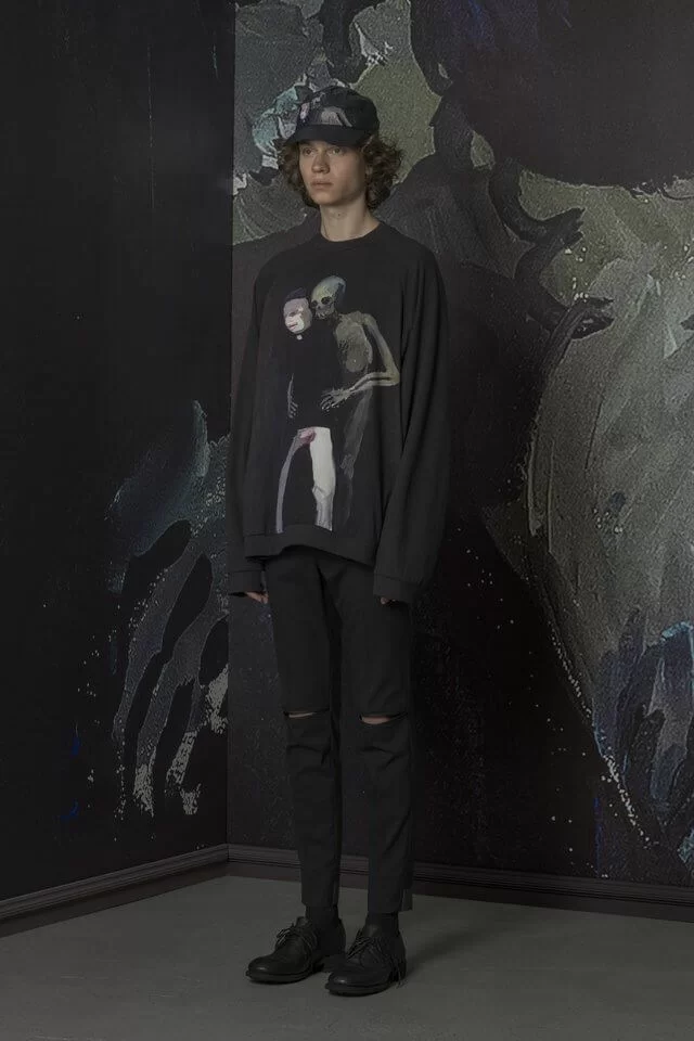 系列中色彩被抑制,設計師沒有單讓黑暗佔據整個系列,而是運用低飽和的黃、金、綠、灰和啡色作為基調,並加入深紅作為點綴,結合古典雅緻印花,披上輕薄頭紗,營造出浪漫、肅穆的視覺故事效果。此外,他還為各式單品注入當代藝術家 HELEN VERHOEVEN 具有暗黑色彩的畫作,闡釋報喪女妖陰鬱、神秘的哀嚎世界。