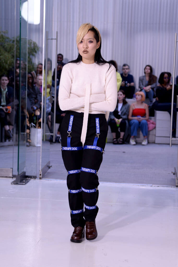 如果你有留意過Youtube熱門影片,或許有聽過這個被喻為壞嘴女(Bad mouthed girl)的YOUTUBER Jessi Slaughter,她之所以令人不滿主要因為她在在影片一直重複說「 我很完美,討厭的人聽好了,我被討厭只是我比你漂亮,我是平常女孩,只是每個地方都完美,而你討厭我只是因為忌妒我。」後來 Jessi Slaughter 遭到無數人圍攻,情緒崩潰。Gareth Wrighton從她身上得到靈感,她可說是最早期的網絡欺凌受害者之一。 同樣是中央聖馬丁畢業的Gareth Wrighton大膽給予現場觀眾衝擊感。貫徹他黑色的反烏托邦氣息,系列混合學院風與危險意識設計。就像看似正常普通的高腰長褲上卻寫著「Therapy Gog」等與束腿繩索,而部分上裝則保持超短版型,呼應她昔日風格。網絡黑暗讓Gareth Wrighton把這種無形暴力以別樣形式展現眼前……