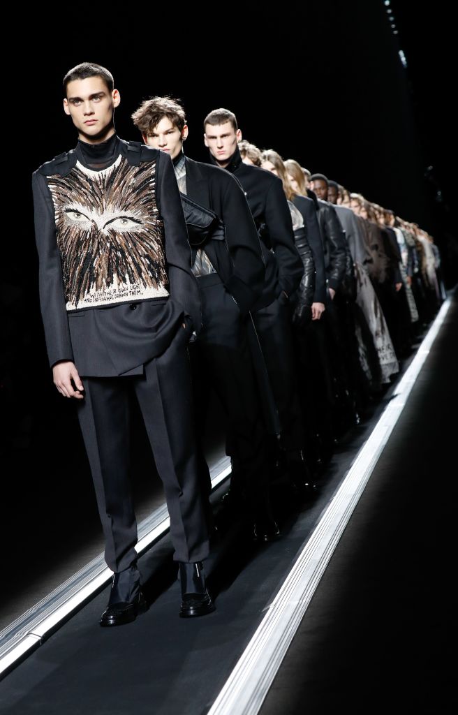 Dior在巴黎鐵塔下的戰神廣場公園內搭建了一個巨型的黑色匣子,並在裏面舉行fashion show。這次2019 Fall/ Winter系列的亮點無疑是場內一個又一個的模特兒穿著dior 19fw系列衣服並站在長達76米的輸送帶上滑行,而這個展示方式就是要模特兒要像Kim Jones這次的設計靈感—法國巴黎的英雄雕像。