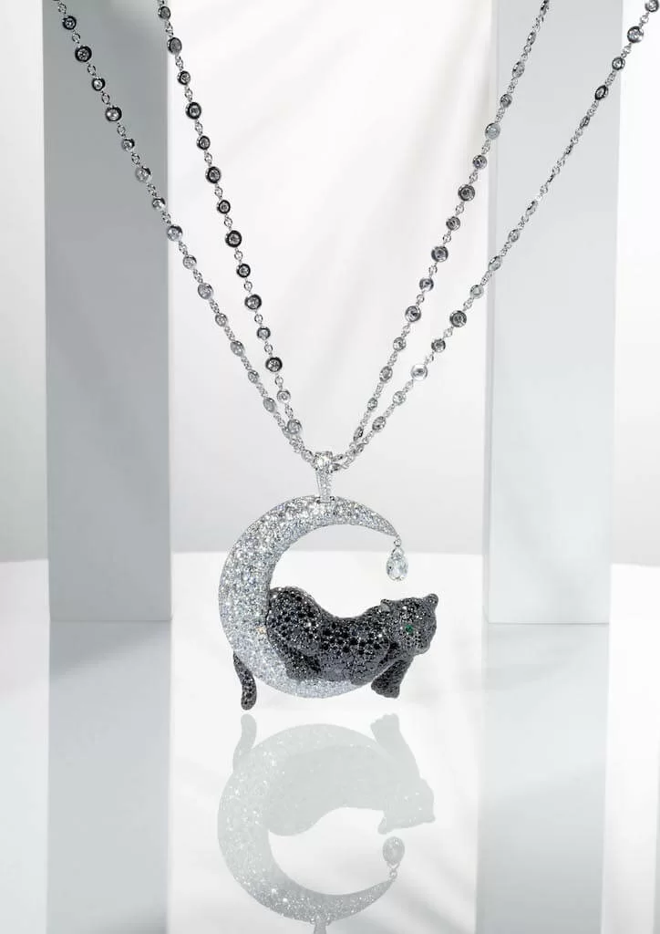Red Carpet系列18K白金彎月吊墜,鑲嵌白鑽及黑鑽黑豹,配搭18K白金鑽石項鏈