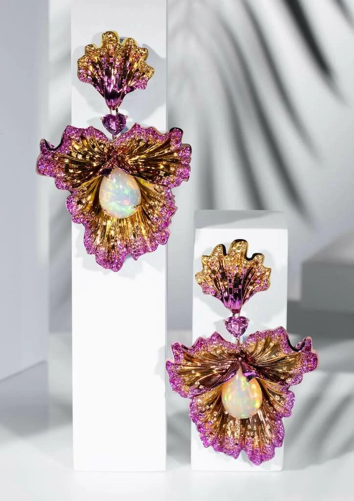 Red Carpet系列鈦金花耳環,綴以白色蛋白石、紅寶石、粉紅色及黃色藍寶石