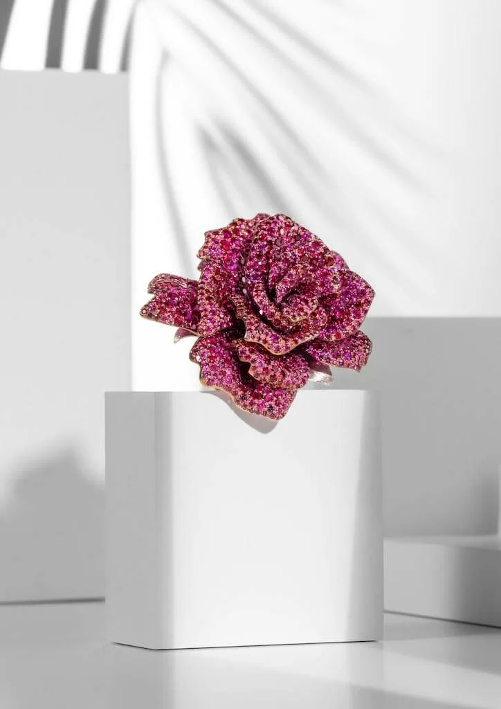 Red Carpet系列18K玫瑰金玫瑰花胸針,鑲嵌紅寶石