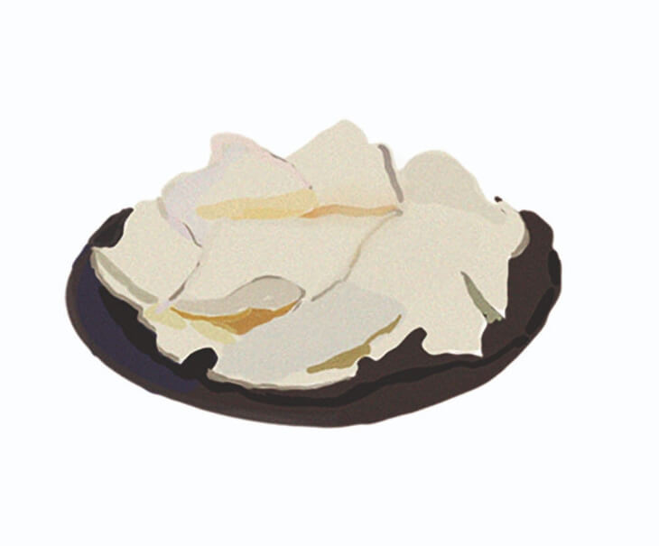 吃麻辣火鍋必吃之物,又稱牛柏葉。毛肚取自牛的第三個胃,製作工序繁複,先將毛肚一片片撕下,清除牛胃裡面的雜物,在放入冰水浸,透過冷縮熱脹原理令毛肚的毛孔收緊,令它更為爽口。