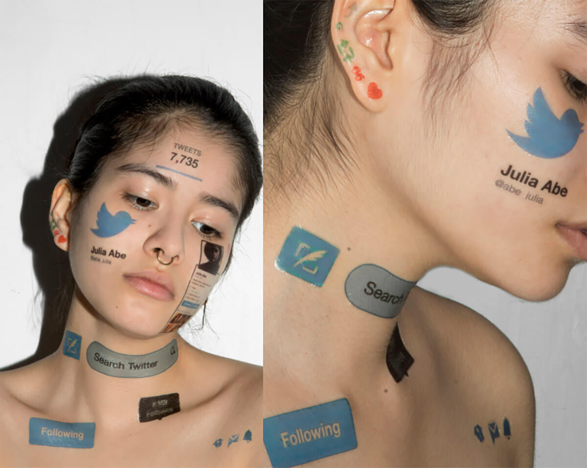 江宥儀 John Yuyi 生於台灣,透過將社交媒體上的 emoji 與符號轉化成暫時性的紋身印於人體上,成為一種當代且前衛的人體藝術創作,反諷及探討我們對社交網絡的沉迷以及它對我們生活的影響。