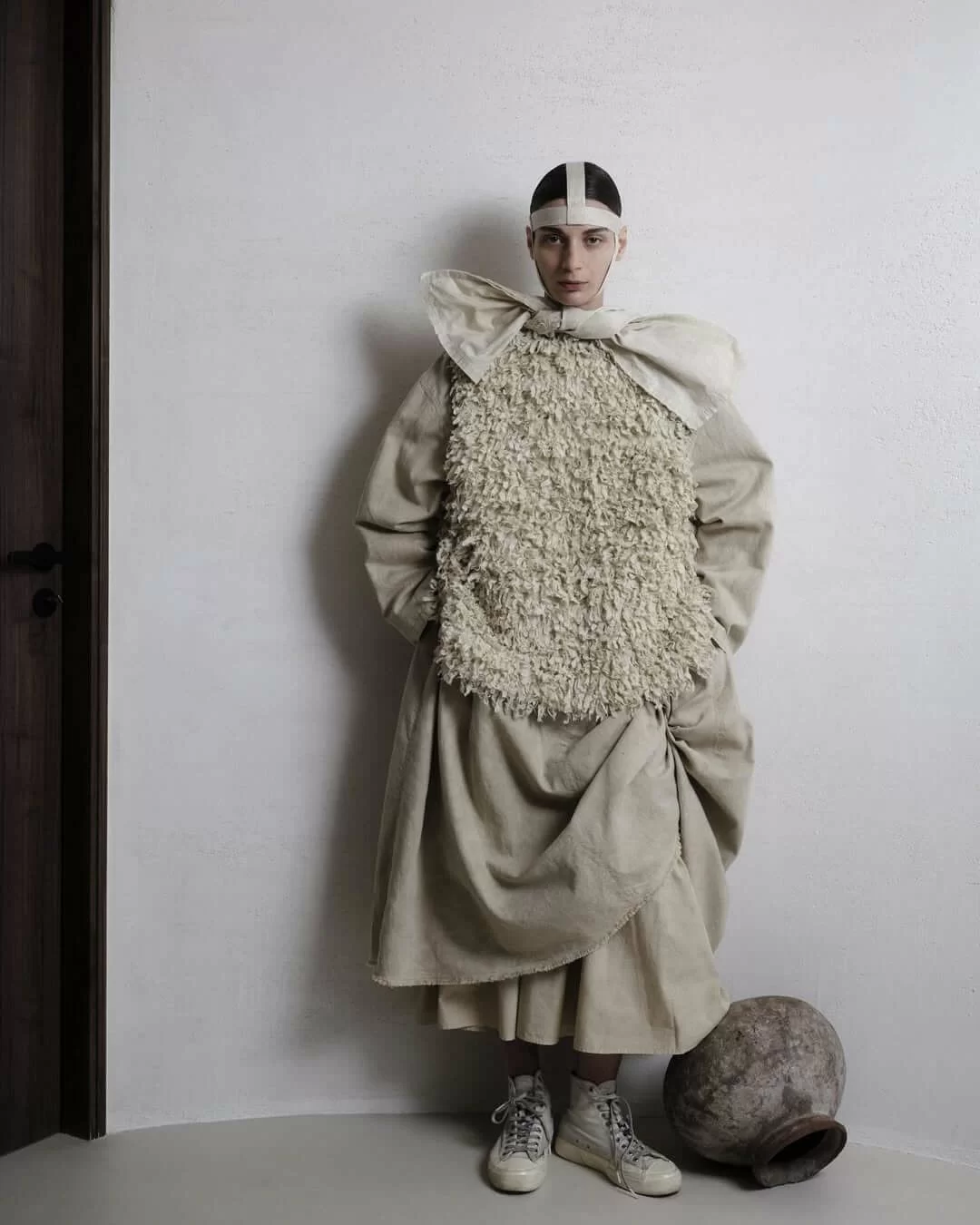野村仁美:這件作品是我至今最喜歡的一件設計之一,它看起來像皮革,但其實是經過特殊處理的棉布。我喜歡它有一點幽默感,打破了人們對布料的第一印象,也保留了身體的柔軟度與舒適。