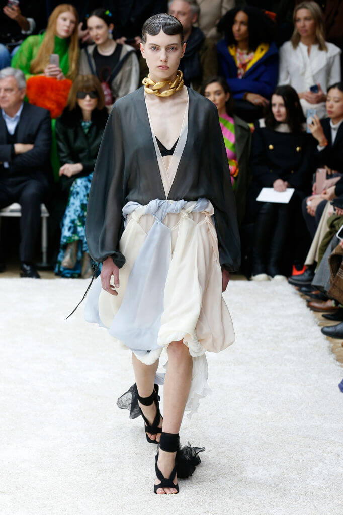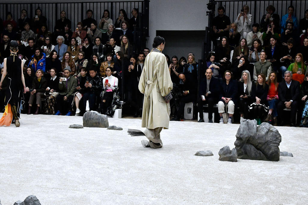 那麼JONATHAN ANDERSON是如何與他拉上關係呢?回到JW ANDERSON 2019 倫敦時裝周秋冬系列,今次我們不談彷彿置於雲端的設計與頭頂上帽飾,而是天橋上的走位設計。當時期的模特兒是沿正方形秀場走秀,而靈感正正是來自人 SAMUEL BECKETT 為 BBC 構思的戲劇作品《QUAD》 。地毯點綴石頭模仿山峰,禪宗花園裏模糊扮演著《QUAD》的人物以類似的步伐走秀,讓人能夠以四個角度去觀看一件衣服。JONATHAN ANDERSON接受訪問時說:「我喜歡正方形的秀場,你可以從不同的角度看到這件衣服。」