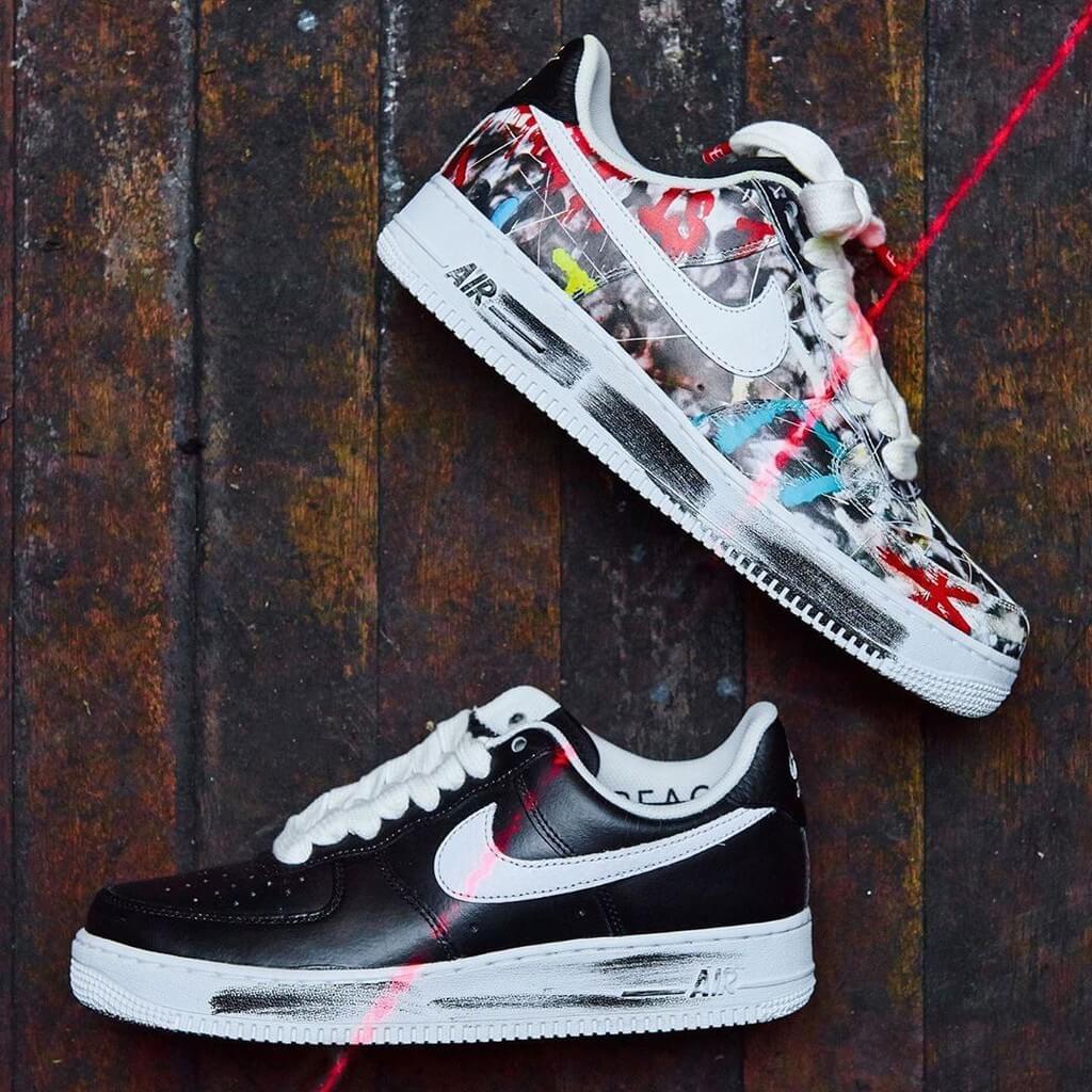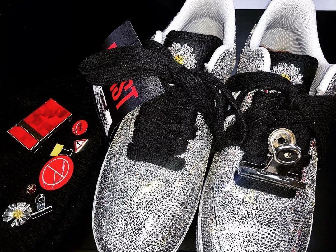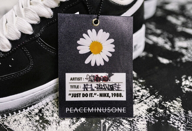 權志龍把藝術細胞注入設計之中,經典的雛菊小花刺繡成為全黑AIR FORCE 1的重點細節。值得留意的是黑色鞋面烤漆的選材會隨著時間磨蝕脫離,透出G-DRAGON 所創作的藝術設計。品牌開賣當天後瞬間被搶購一空,權志龍後來更上傳貼滿閃亮鑽石版的AIR FORCE 1,成功掀起聯乘風潮。