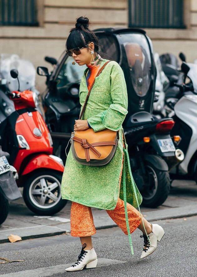 Fashion Blogger Jenny Walton就用淺綠色上裝搭配深綠色闊腿褲,薄荷綠小方巾起到點亮造型的效果,為整體營造出層次感。同時,為免寬鬆的造型,過度休閒顯邋遢,她的方跟涼鞋就大大增添優雅精緻感。