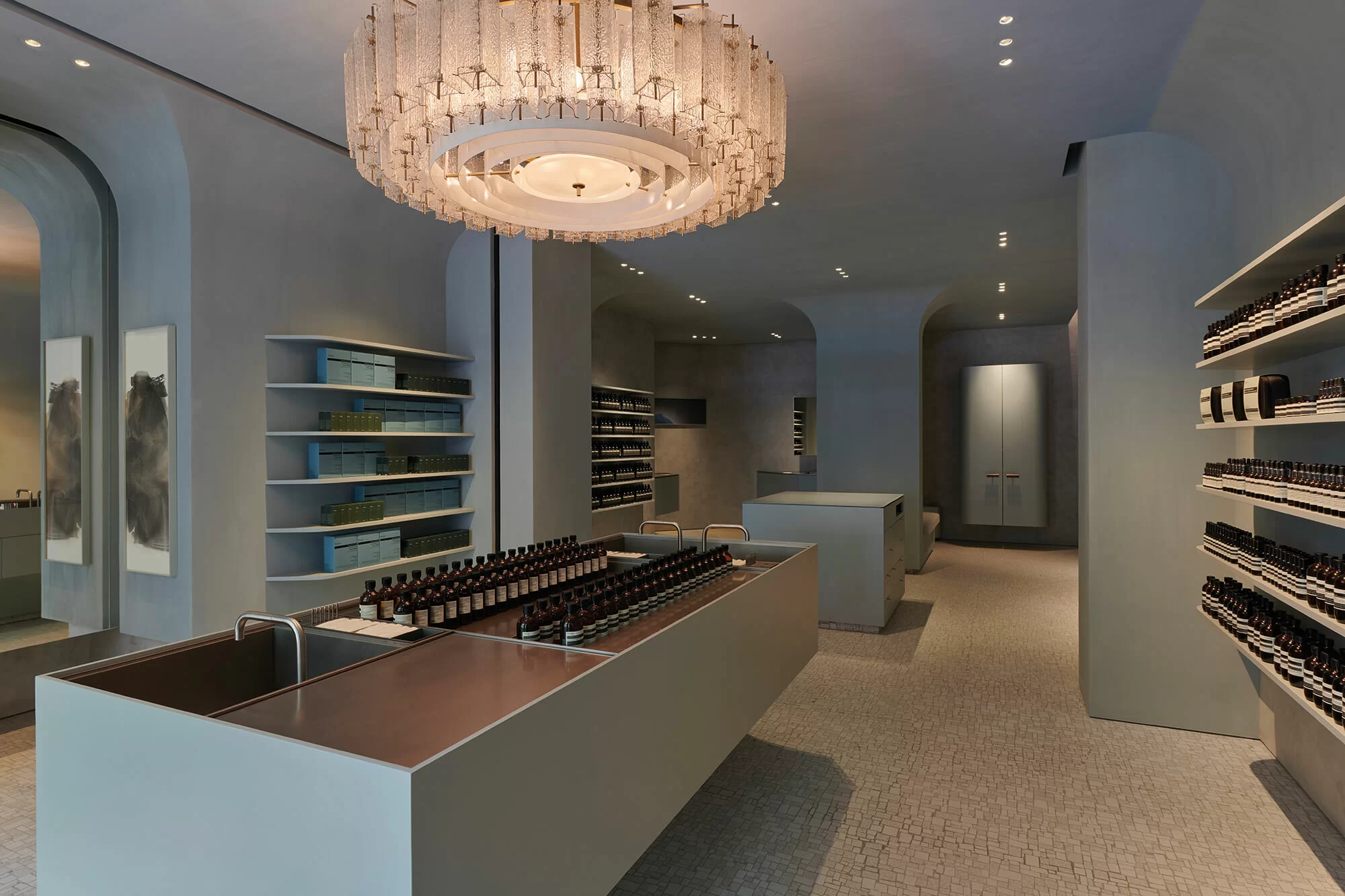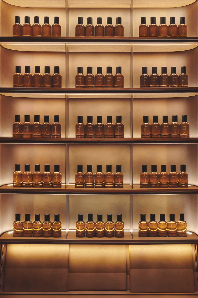 每間 AESOP 都是城市中的歇腳亭,繁忙鬧市中的一處安寧。雖與街道的吵雜形成對比,但也巧妙地融入街道,而非破壞當地氛圍。最近在銅鑼灣名店坊重開的 AESOP (與舊店僅幾步之遙) 就以「隱退及反思」為靈感重新設計,以廢棄材料變成現代實用的設計美學:例如在本地老工廠收集「舊港式雲紋板」,切割成小碎片再重新組裝成馬賽克風格的地板、回收 AESOP 舊店的銅板,與本地金工職人重新鑄造的香水櫃 (FRAGRANCE ARMOIRE)。尊重過去、珍惜現在、保護未來一直都是品牌店鋪設計的標杆,每一間都用心「再造」當地已有的元素,充滿在地連結感。而這個「過去現在和未來」除了指街道與店鋪,還有人們的故事。