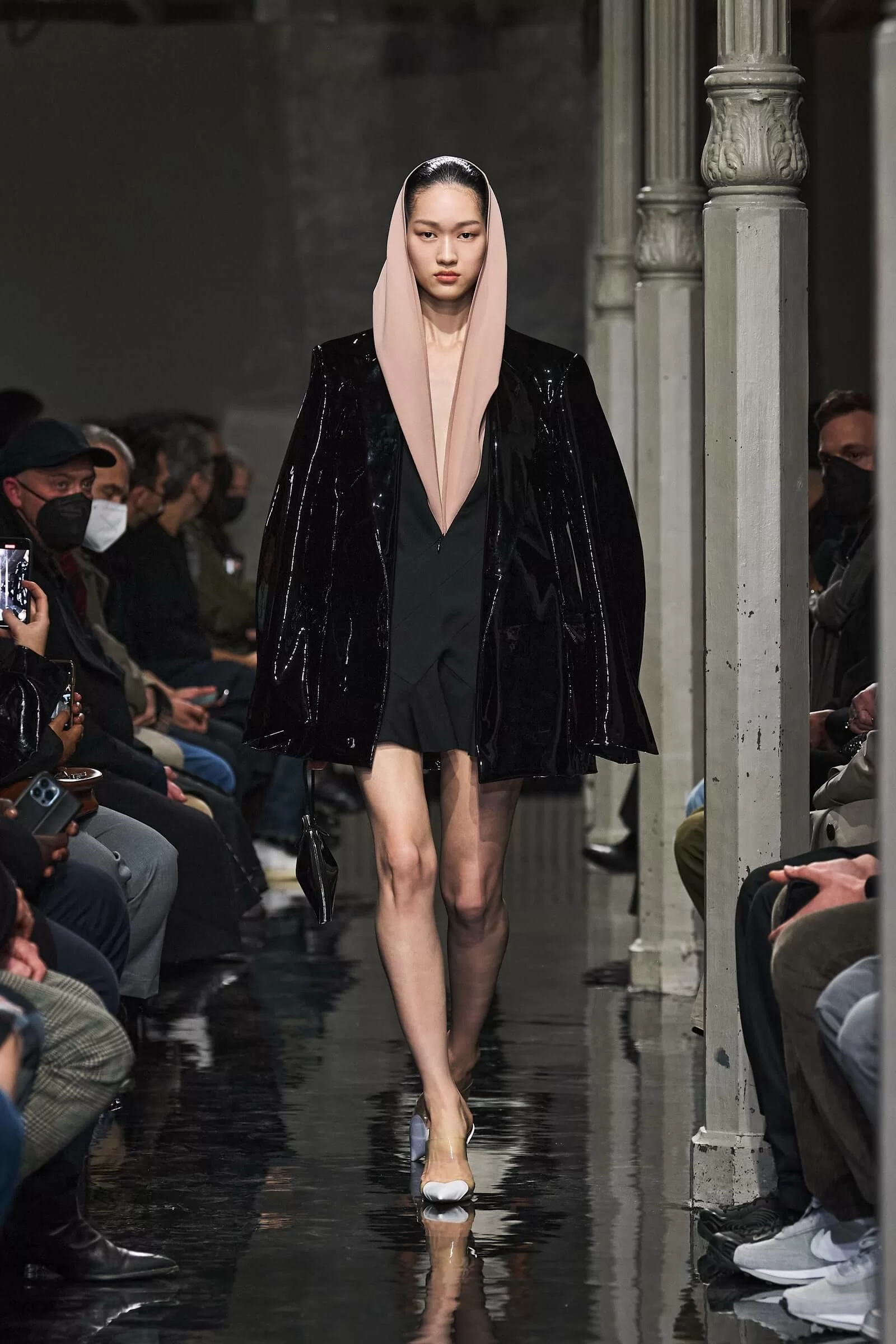 從 AZZEDINE ALAÏA 的西班牙裙子衍生出的喇叭褲系列。褲和裙都以修身的魚尾的剪裁為主,略寬的裙擺左右搖曳擺動,呵娜多姿。西裝加上犀利的恤衫領子,配上荷葉邊的裙擺,形成了一個有趣的對比,既具有宗教式的超現實主義風格,但當拆開來看時,又發現每件都非常實穿:從紳士的衣櫥裡走出來的 OVERSIZE 西裝;不對稱的緊身連身裙;極高領的衣領遮住了下半臉,卻以服裝勾勒出女性的線條美,神秘而性感,精緻而充滿氣勢。