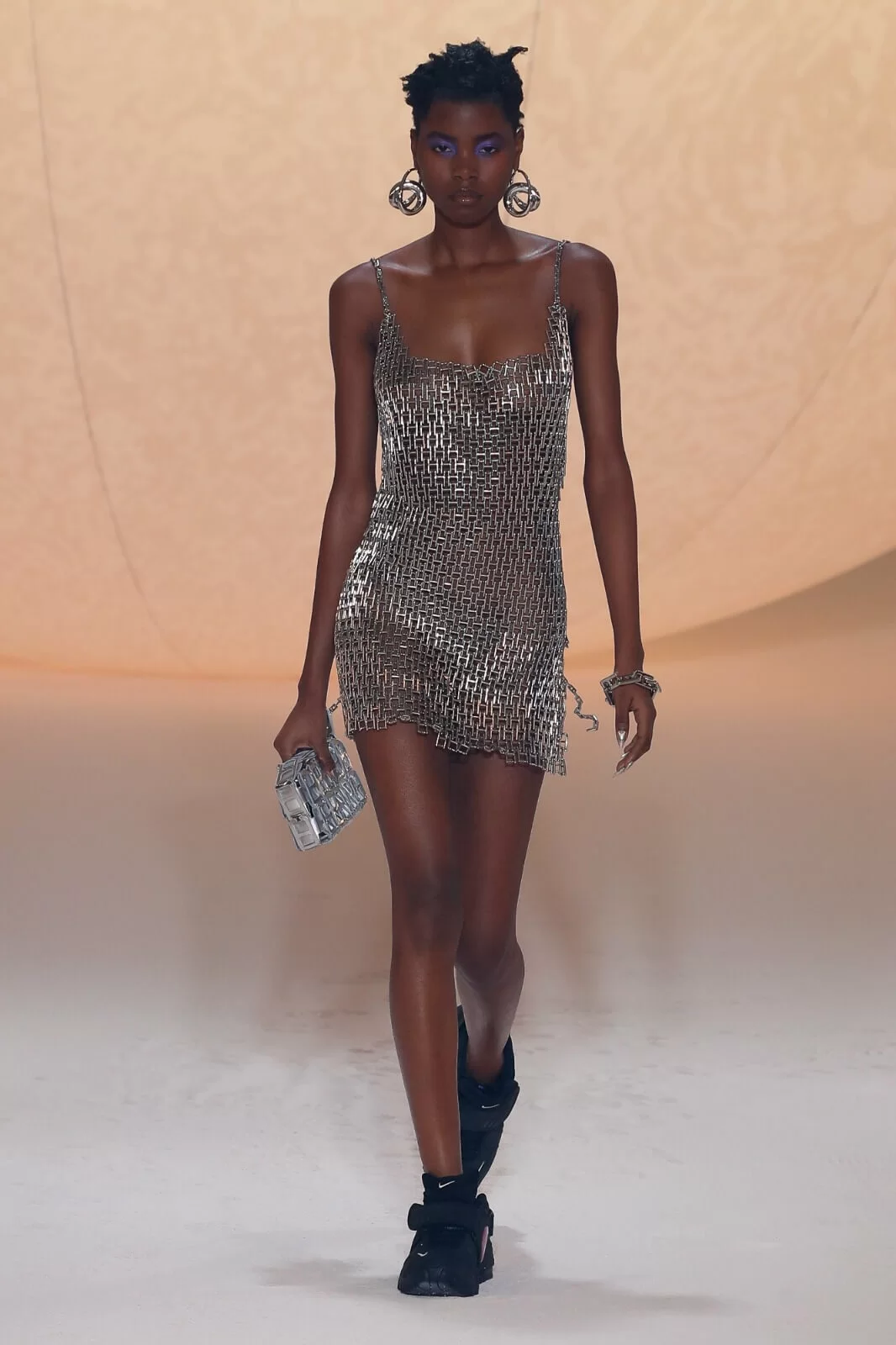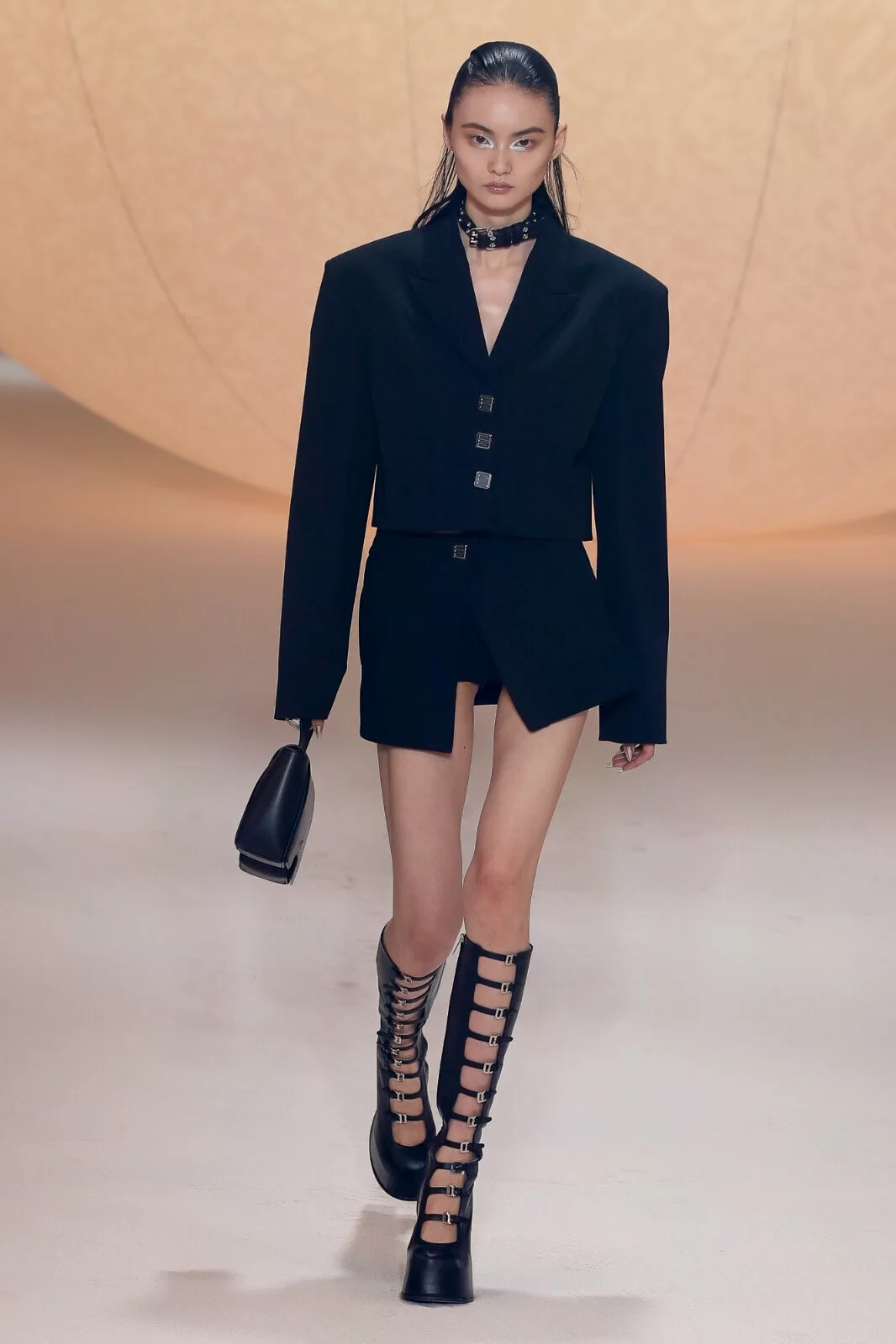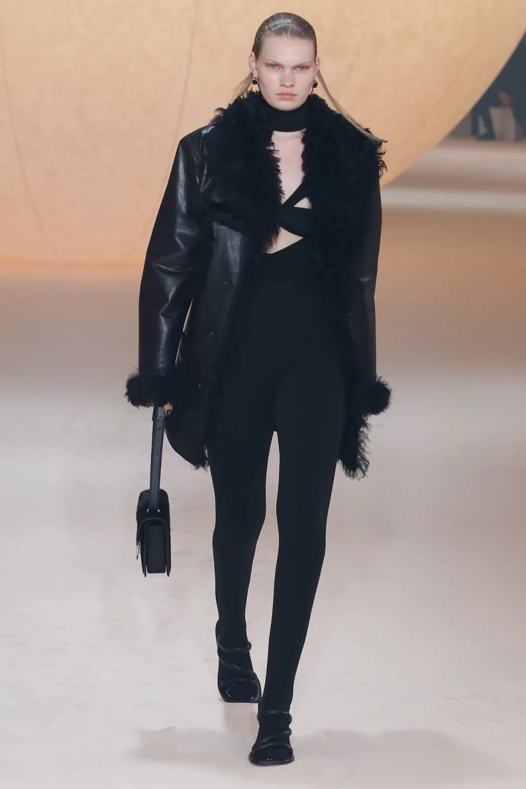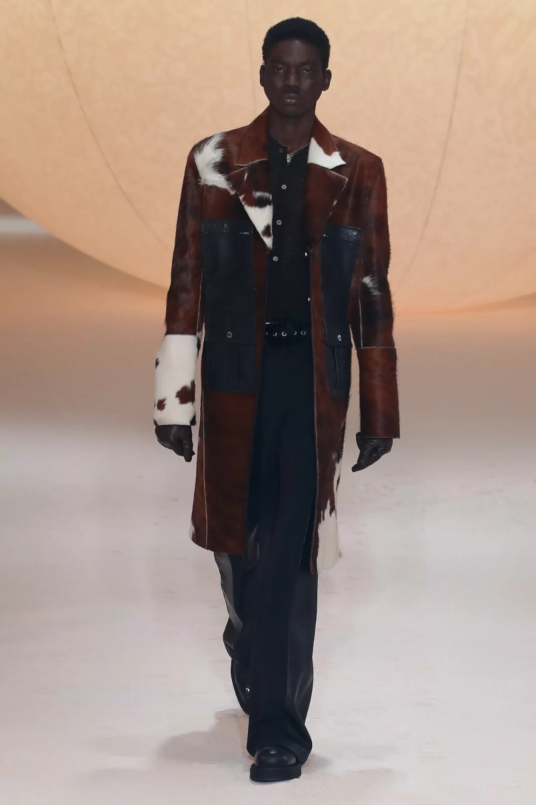 2022秋冬系列的服飾採用了前幾季標誌性的加長版輪廓為元素。模特兒們昂首挺胸的穿著像動畫裡一樣的厚底鞋,戴著毛茸茸的超大帽子。堅實的方肩外套,與女裝微緊身的喇叭褲(或者不穿褲子)或男裝超長直腿褲形成了鮮明的對比。變形的輪廓增添了一種超現實的一面,而當這些模特兒從球體降下時,他們的腳觸碰到鋪滿白色石英粉末的伸展台,就像重回地球的現實世界。