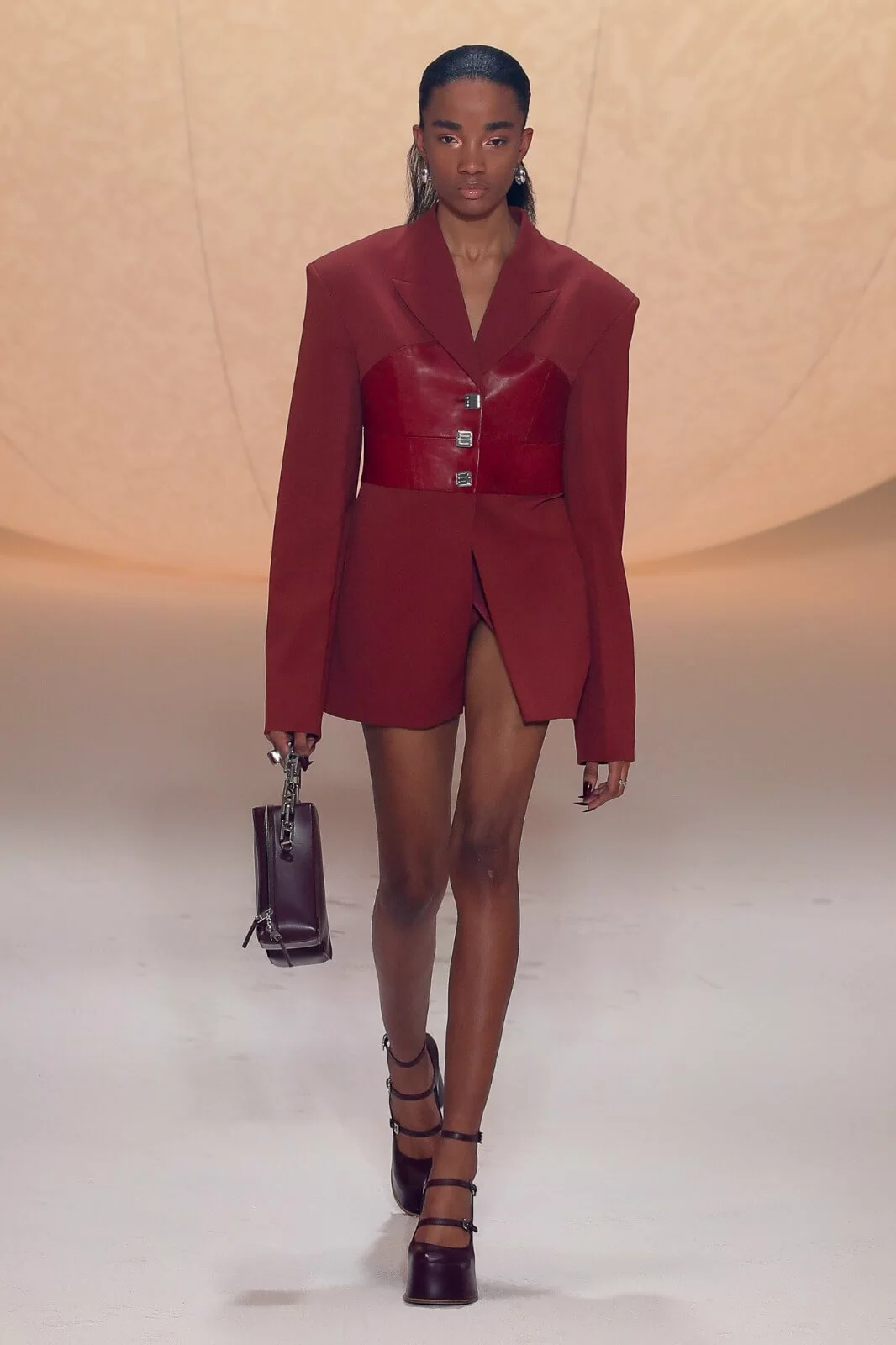 外套是 AMBUSH® 的一個標誌,而本季AMBUSH® 外套又走向了新的極致。硬邊皮製外套,包括短款騎士外套、黑色與栗色的西裝外套,配上剪羊毛袖子和領口,營造出了70年代的風格。男裝方面,海軍藍或黑色的襯墊皮製背心和合身的無袖上衣與利落剪裁形成對位。飾有心形鏤空細節的緊身上衣和連身衣進一步為女性打造修長的廓形,搭配黑色和金屬色內衣造型的連身裙更顯完美。