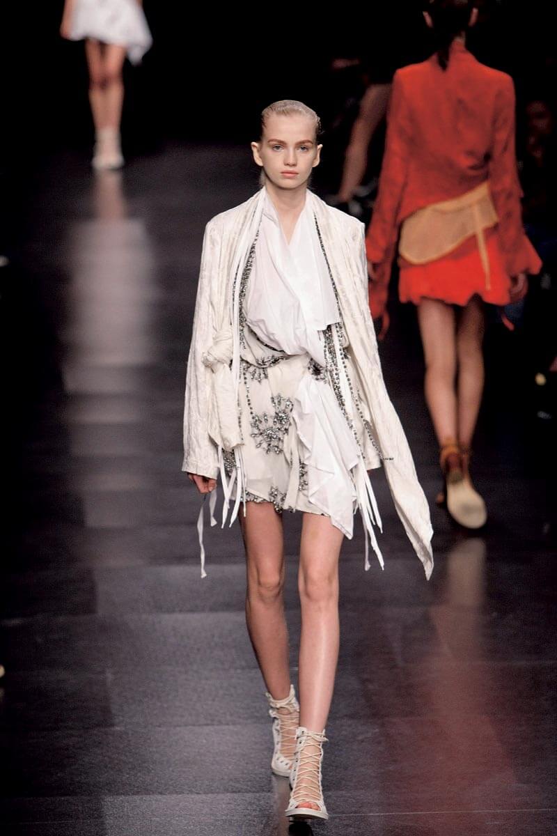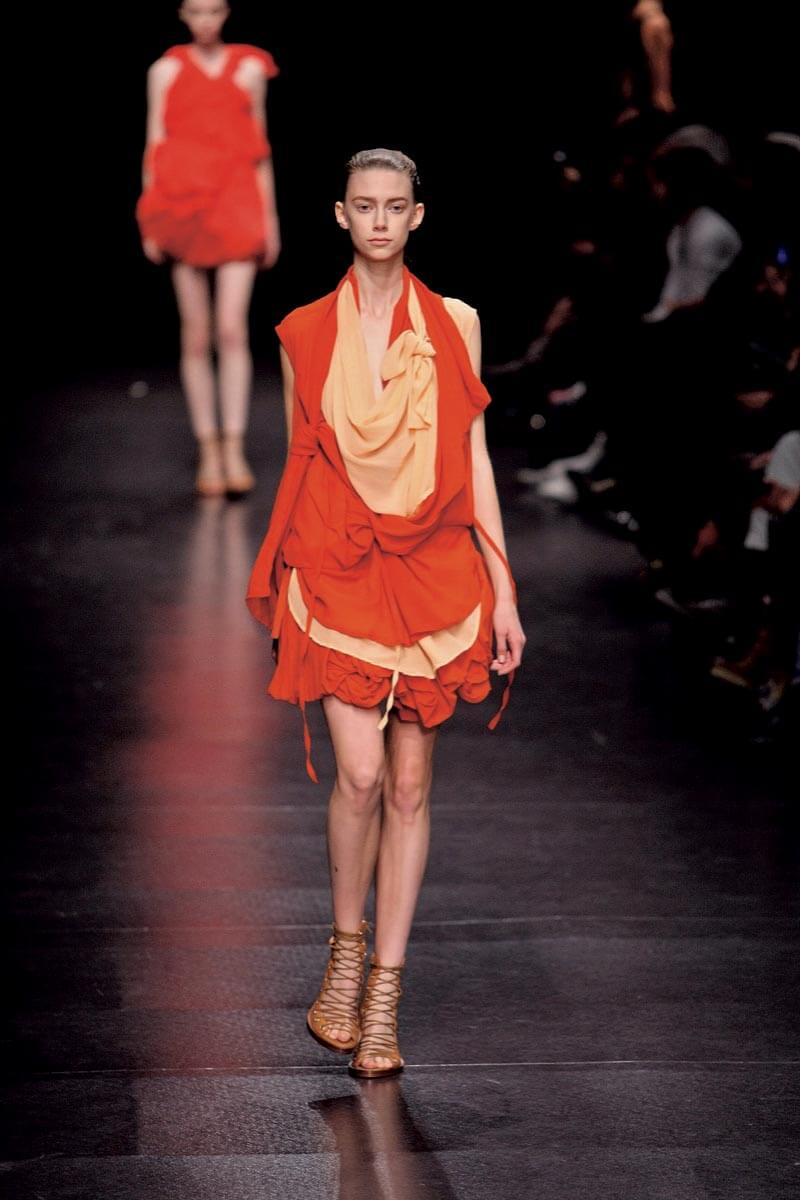 Ann Demeulemeester 很久沒有向大眾呈現其少女觸覺。其擁戴者至愛長春黑西裝及褲裝自然少不了,另一方面,其浪漫又帶點希臘式的短裙、鑲滿閃石的衫裙,相信能吸引不少新支持者。這系列除包括 Demeulemeester 至愛簽名顏色黑白以外, 還有鮮艷橙色,在水準保持、品牌形象持續不變之餘,也為看者增添新意。貫穿全秀的 lace up 高跟鞋,擺脫了 lace up 或 strappy 高跟鞋那純粹性感特質,很是吸引。