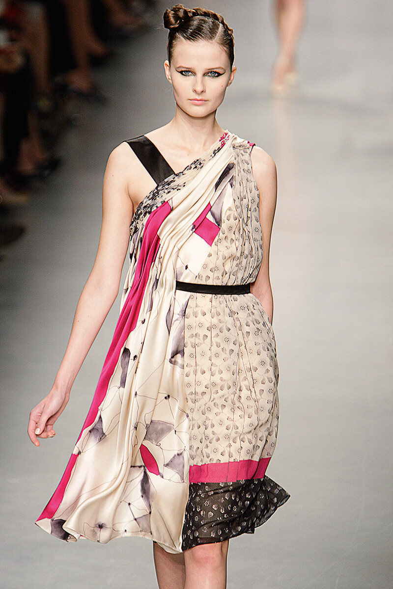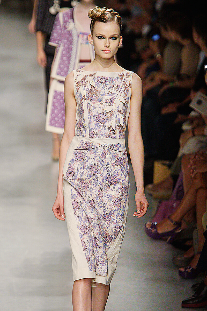 看 Antonio Marras 的時裝展最有趣的地方,往往是他如何在天橋上說故 事。這次春夏系列取材自以法國作家 Jean Genet 作品《The Maids》的同名電影版本,在電影擷取而來的聲帶作配樂之下,首先登場的是女僕所扮演的 高貴女主人造型,優雅的懸垂縐褶上衣,印花連身裙,配搭小針織上衣,由藍綠及桃紅色調逐漸回歸經典黑白,再從牡丹水彩畫至豹紋圖案,將主人的 各種個性一一展現。