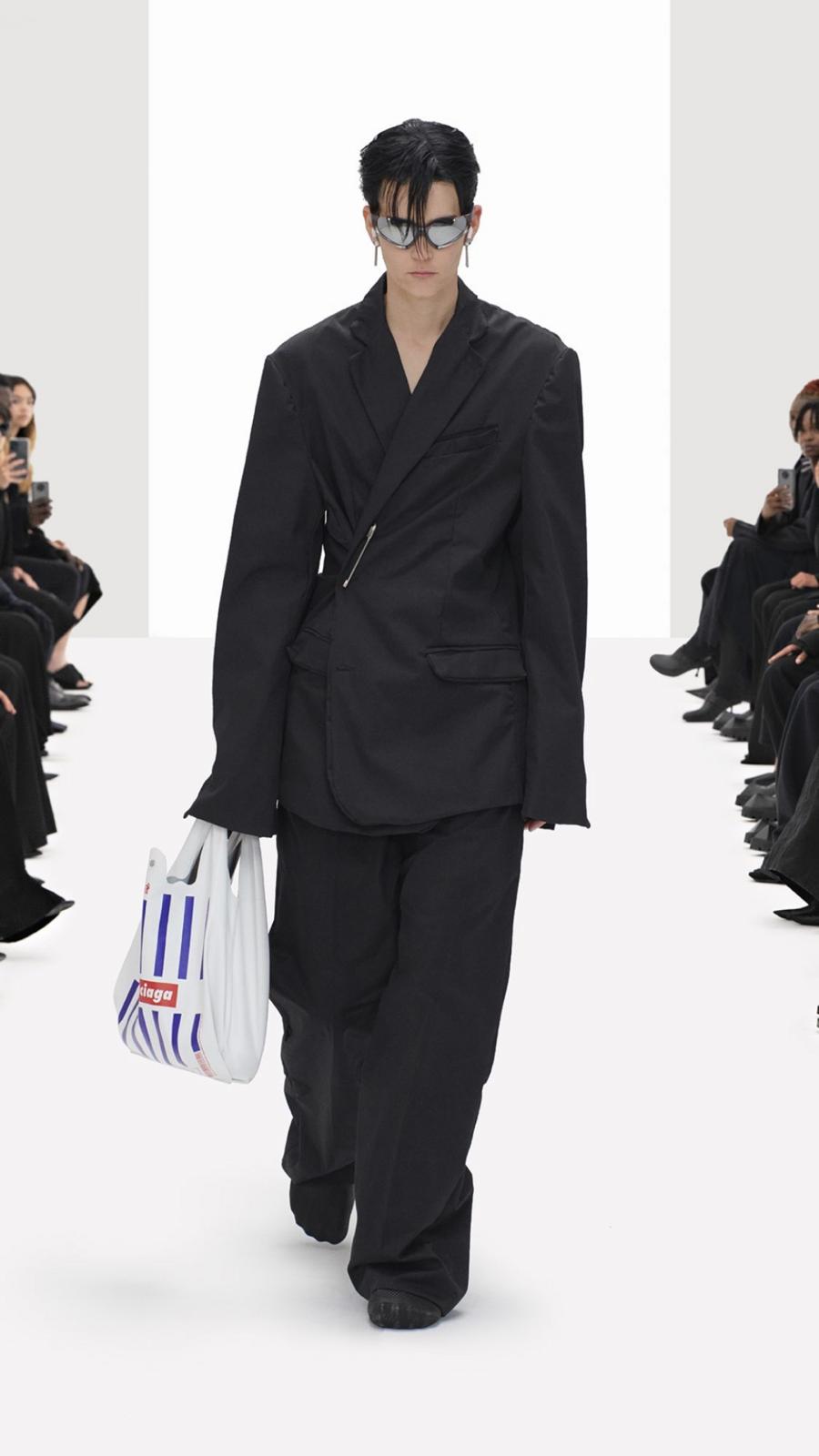 BALENCIAGA 2022 春夏系列於一個全白的舞台場地上演,場內所有由模特兒飾演的「觀眾」都穿上全黑套裝示人,呈現出強烈對比,同時也在告訴你這些「觀眾」也是這場騷的重要人物。在時裝騷舉行期間,「觀眾」們模仿以往觀眾一樣拿起手機拍照,心水清的你可能記得在 2017 秋冬系列時裝騷後,DEMNA GVASALIA 表示場內的觀眾只顧着拍照和拍影片,最後決定 2018 春夏不以實體騷形式展示系列,場內全黑打扮的觀眾,其實是 DEMNA GVASALIA 對於以往觀眾的一種諷刺。