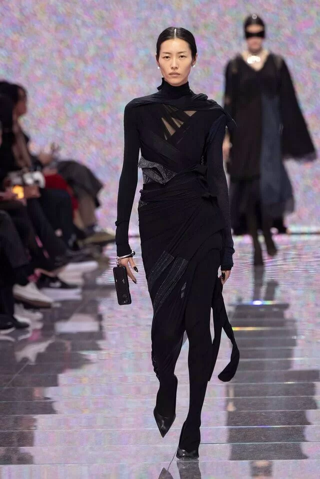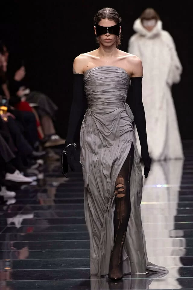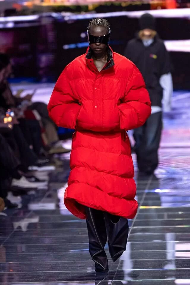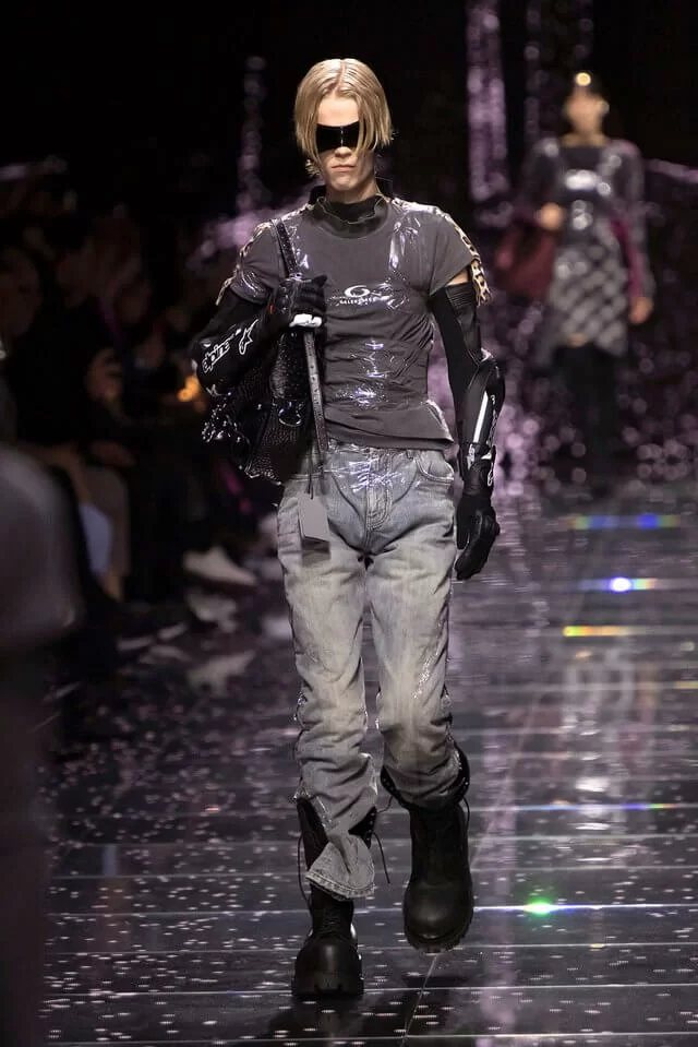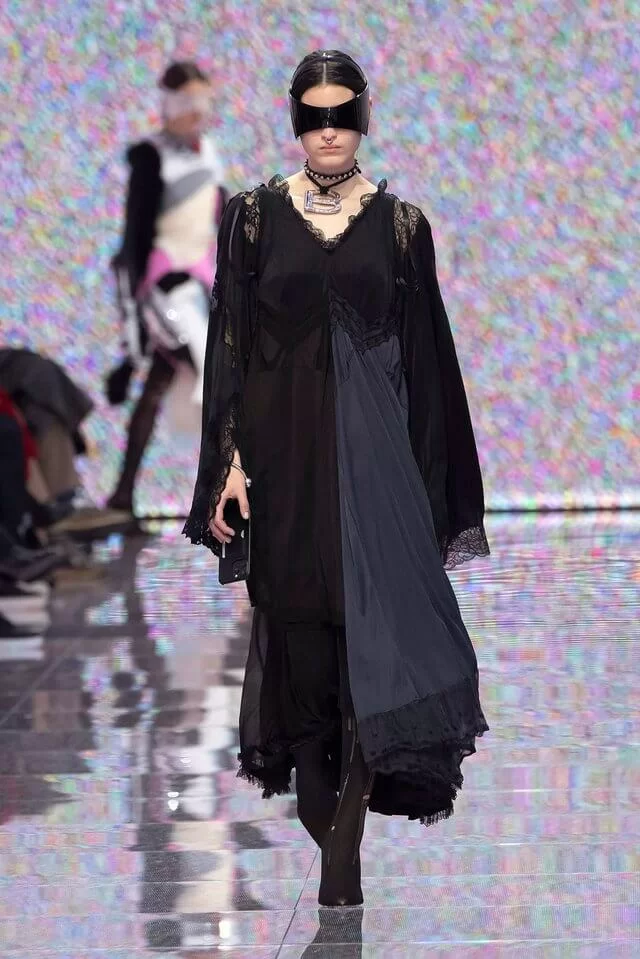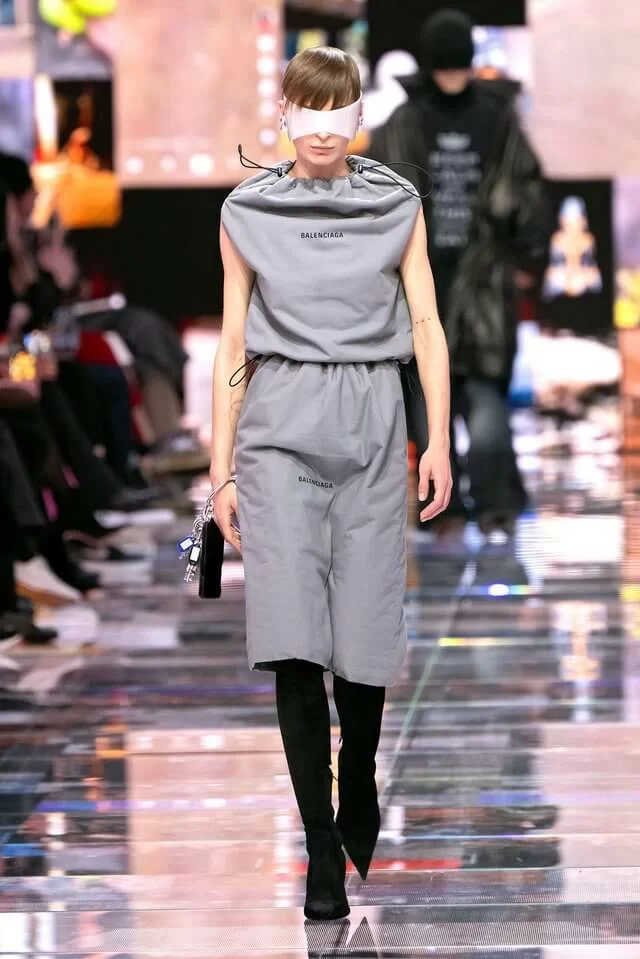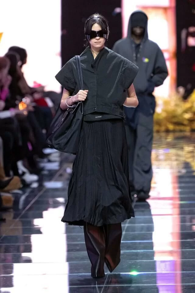 BALENCIAGA 防塵袋、背囊和尼龍健身袋被改造成上衣、半身裙和連身裙;女性內衣一層一層疊搭包裹住身體製成抹胸連身長裙。這是 DEMNA 對傳統與創新之間界限的探索亦是他在環保概念上的創新。充滿解構、流動感的精裁套裝;錯視風格的 BALENCIAGA 品牌標識皮革胸針;龐克風的豹紋印花;佈滿全身的亮片;一條又一條的鏈條;做舊效果的超大型人造毛皮大衣;牛仔褲被重新詮釋,披在肩上當上衣;連身裙中引入了「臀墊 (HIP-AULETTE)」結構,反轉傳統的肩部襯墊,將重點轉移到臀部,除此之外, BALENCIAGA 膠紙纏滿身的造型亦在秀場上回歸。搭配 AIRPODS 耳環、面罩眼鏡、過眼帽、由重新利用的 ALPINESTAR 材料製成的手拿包以及膠帶手鐲,展現出品牌一貫荒誕又前衛的時尚風格。