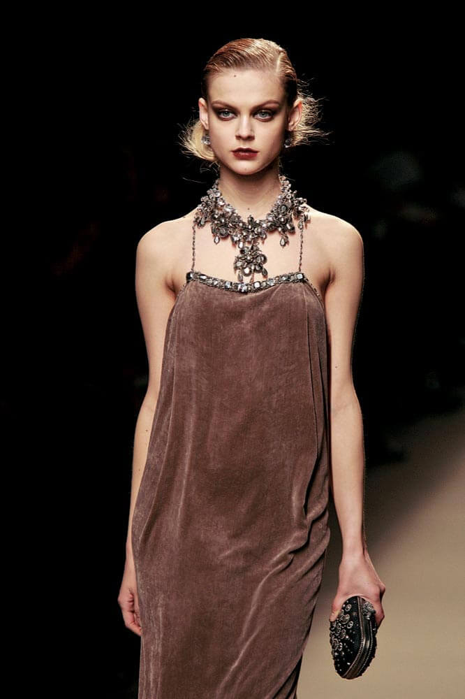 如果說今季多數的時裝設計師也要在創意與現實之間作選 擇,那麼 Thomas Maier 應該是最懂得在兩者間保持平衡的一位。 Bottega Veneta 式的低調世故與品質要求不變,不同的是今季有 更多日裝。大部分都是裙子,20 年代剪裁的絲絨裙子、內有鋼線圈 的緊身胸衣裙等。品牌的強項是將所有可以讓人察覺到的表面細節 刪去,只留下最純粹的部分,要親身穿上才會感受到衣服的精彩之 處,這季亦一樣。