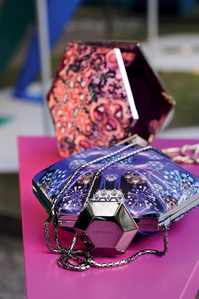 一個高貴優雅一個前衞大膽,風格可謂全然不同,唯一的共通點,是同樣喜歡採用鮮艷的顏色作配搭。Williamson 大膽的將兩個品牌不同的 signature:他的顏色配搭品味與奪目的圖案設計,與Bulgari珠寶透射出來的光芒二合為一,出來的是一般高級珠寶品牌欠缺的幽默感,以及自由創作下的瀟灑型格感覺。「除了這些鮮艷的淨色設計,我同時創作了三個圖案。我將品牌舊檔案中的紅寶石創作成圖案,並以我自己設計的蝴蝶圖案作襯托,希望營造一些銀河系、萬花筒的視野。」三個 tote bag 設計新穎大膽,打破了 Williamson 將品牌形容為 quiet luxury 的風格。