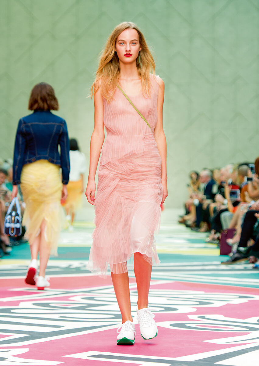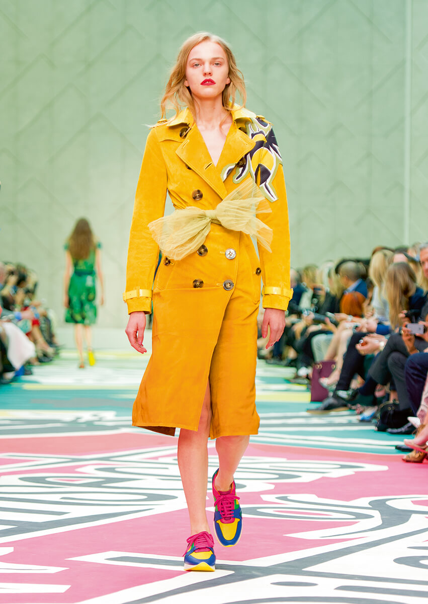 相信 Christopher Bailey 已經在花叢中入了迷。上季以綻放的鮮花為主調,手繪花卉圖案的高跟鞋和手袋成為當時一大焦點。事隔半年,他繼續沉醉於花園的氛圍之中,並以 The Bird and The Bees 為題,把英式的鳥語花香延續至明年春夏。這季同樣着重 hand-painting,手袋和 trench coat 上不乏手繪的蜜蜂圖案。單單是蜜蜂不足以構成整個花園,蝴蝶印花緞布、如花一樣鮮艷的漸變色絲綢,還有吸引蜜蜂到來的 honey-tone 華達尼布,眼前景象,就如春天繁花盛開的山頭。