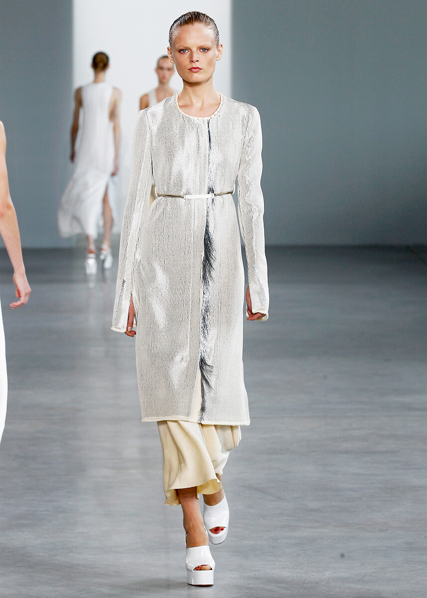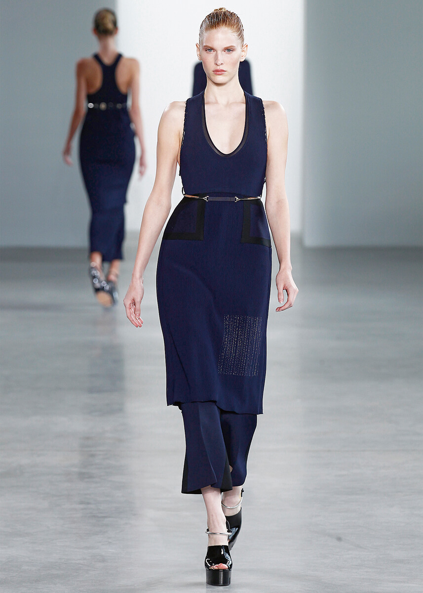 Uptown 的鄰里生活舒適寫意,跟downtown 圍繞工作和夜生活的燈紅酒綠形成強烈對比。Calvin Klein 取其中庸,設計好比城鄉交界:圓與方的拼貼、鮮明的白與冷靜的海軍藍、剛烈的皮革與光滑的絲綢,衣服上種種對比,猶如樹林和高樓大廈交錯的灰色地帶。至於整體風格亦一如以往,簡約的剪裁配合銀色流穗和鏤空皮革等恍似大廈建材的元素,讓曼妙體態隨身體擺動時若隱若現,證明不是明目張膽才叫性感,低調也可以是引人入勝的要素。