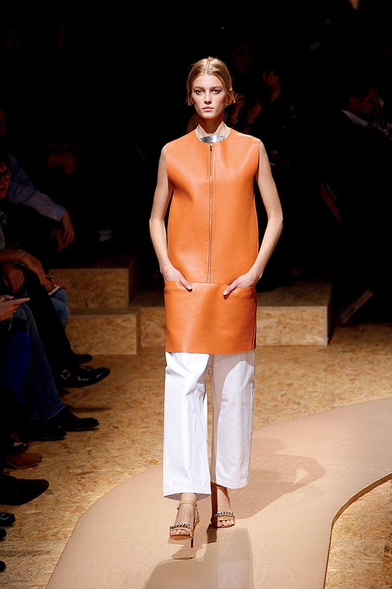 以來季十分流行的全白作開始,闊大的白色連帽長身裇衫配闊腳褲,英氣十足;以藍色或黑色在白色闊褲子的褲頭或褲腳作點綴,為素淨的白加入一些調劑;寶藍色闊布褲又以故意外露的拉鍊令它變得不平凡。沒有任何設計的窄身皮革上衣配闊布褲,比過多裝飾的時裝更前衞。數款顏色條子圖案設計成為了整個系列的高潮,奪目的闊藍綠條子是 Phoebe Philo 拿手好戲 ―― minimalism 的嶄新嘗試。整個系列是 Philo 的自信宣言,不需要作任何花巧,簡單便是美。
