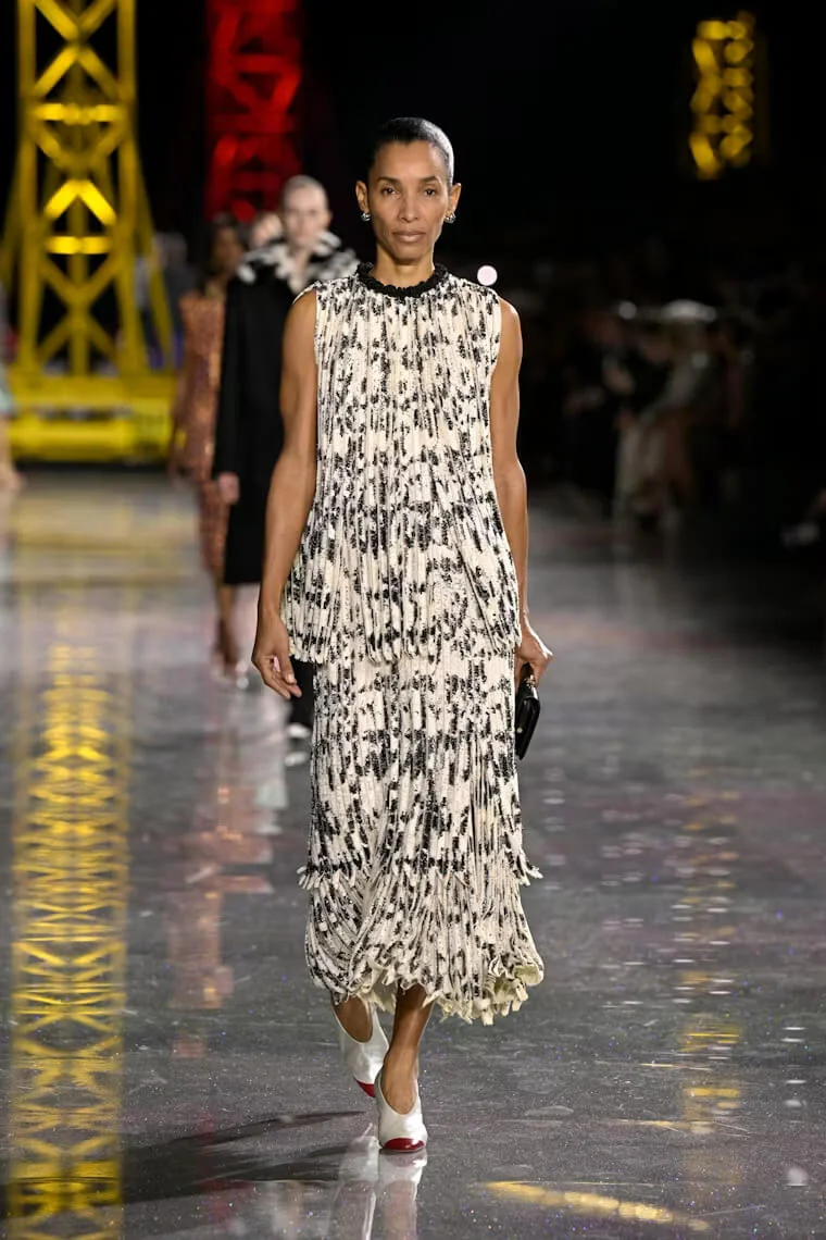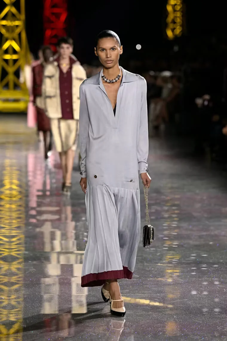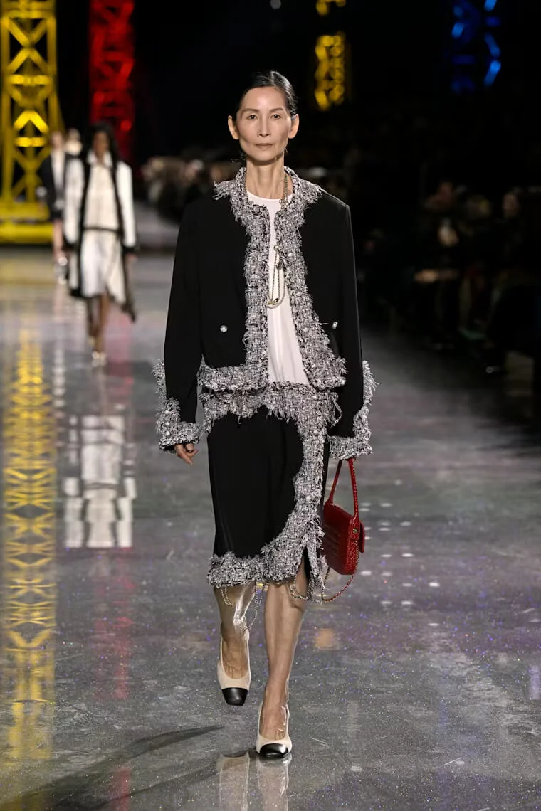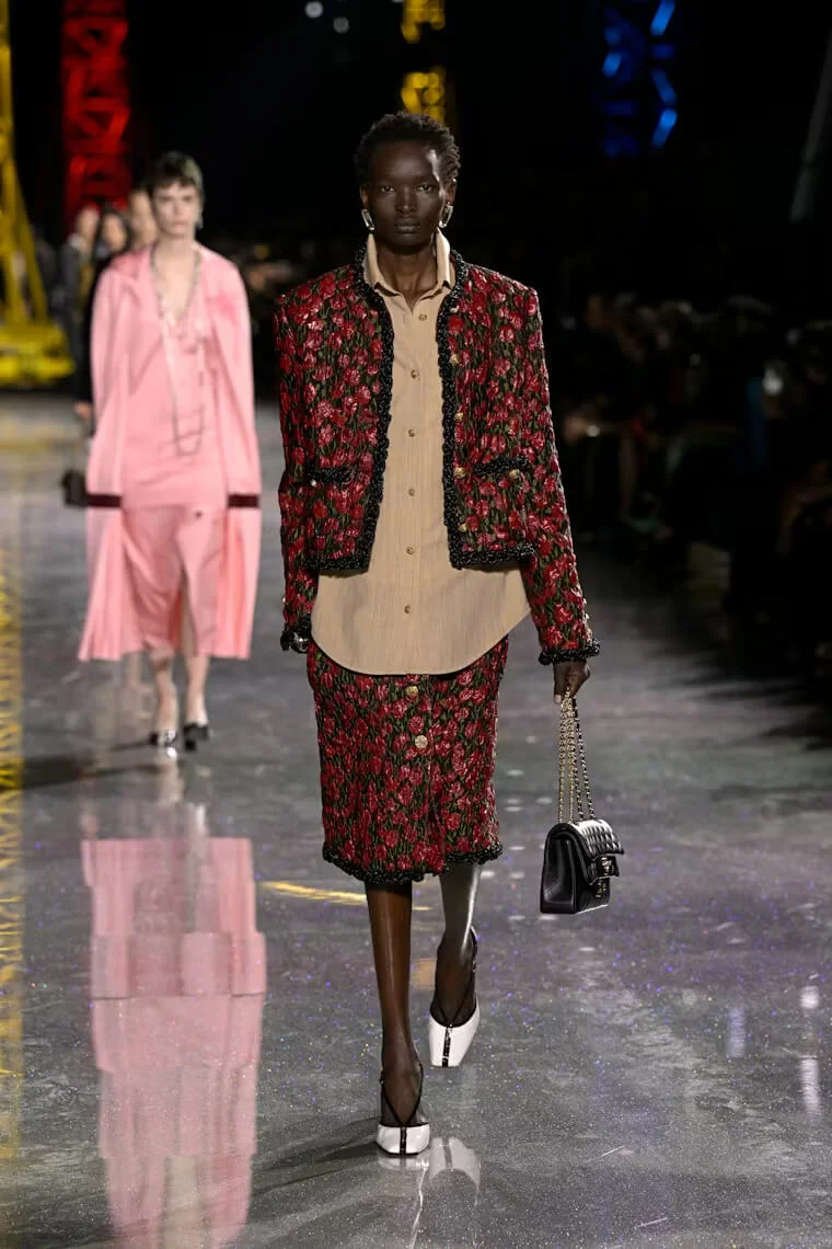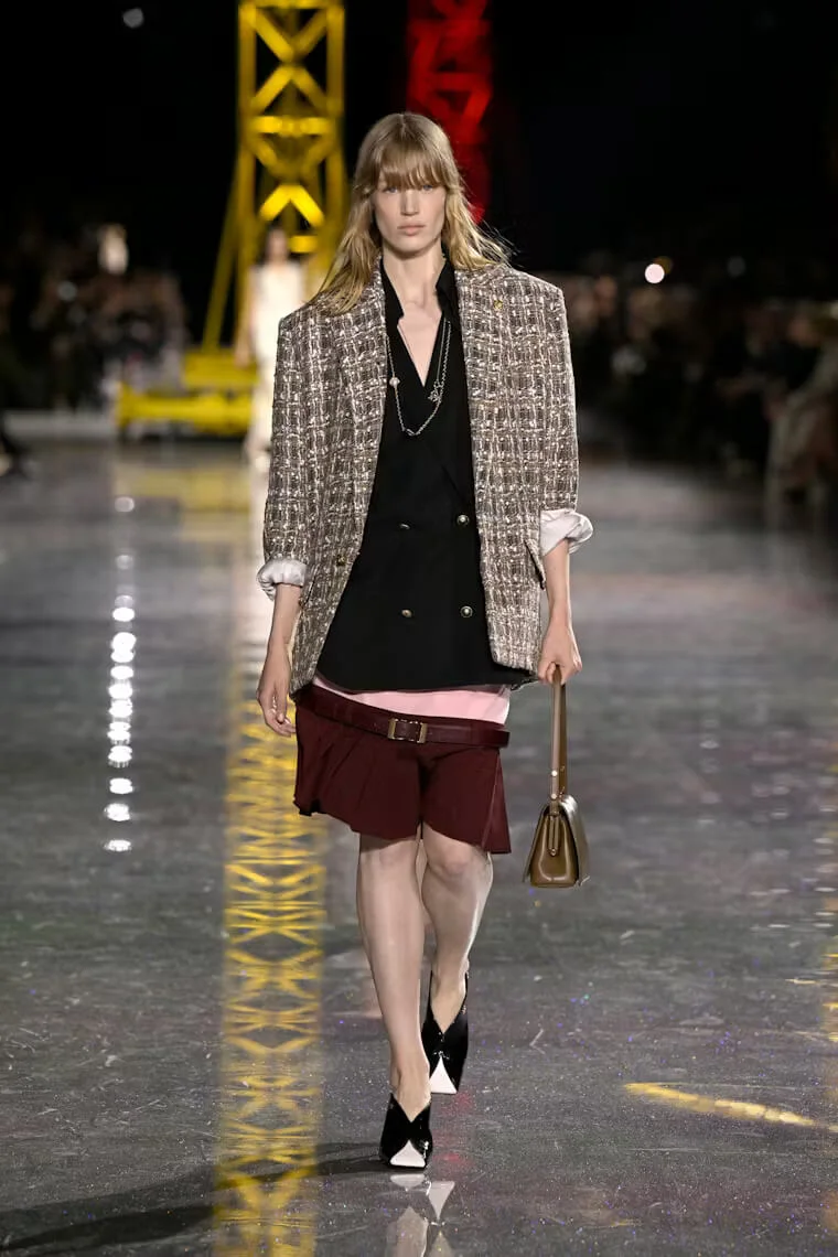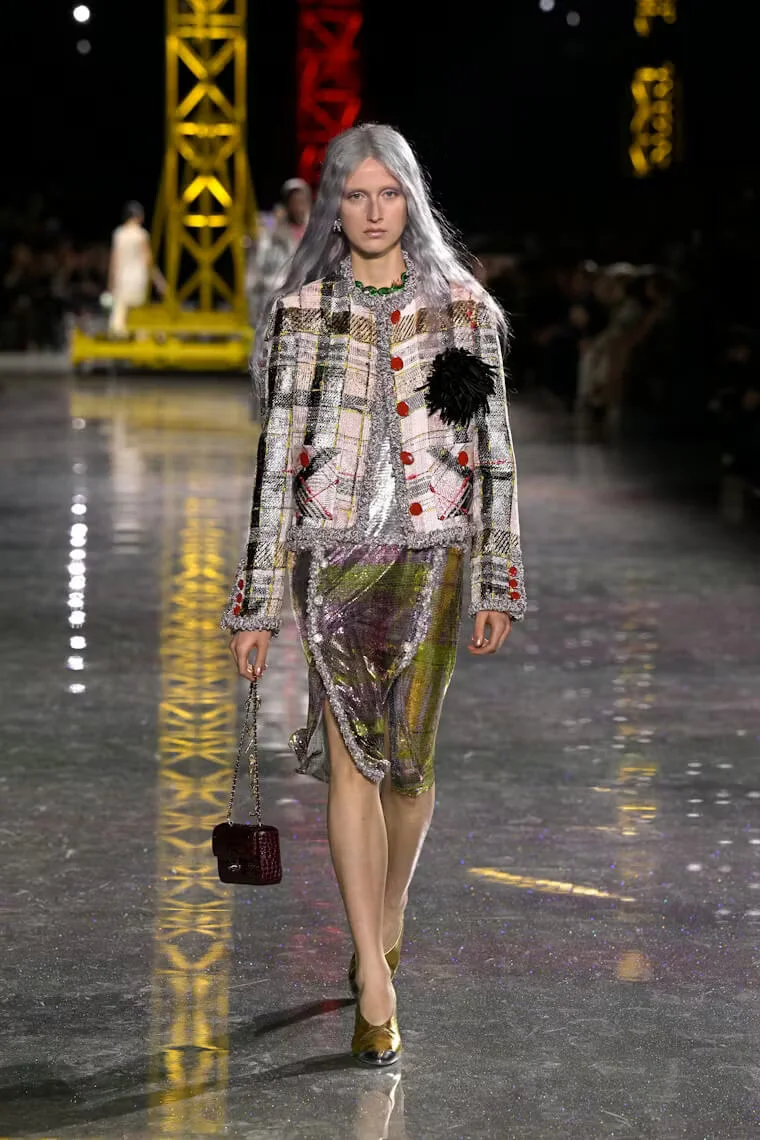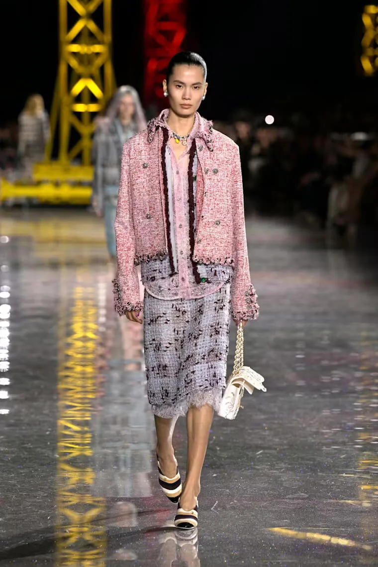 Chanel 2026 秋冬系列層次豐富卻又輕盈飄逸,不拘束又不失隨性,MATTHIEU以CHANEL套裝的經典原型貫穿多個時代的變遷,例如囊括了羅紋針織、經典粗花呢,融合了人造纖維、金銀絲、矽膠和天然紗布等面料,又變奏成工裝襯衫和充滿男性魅力的短版外套等。