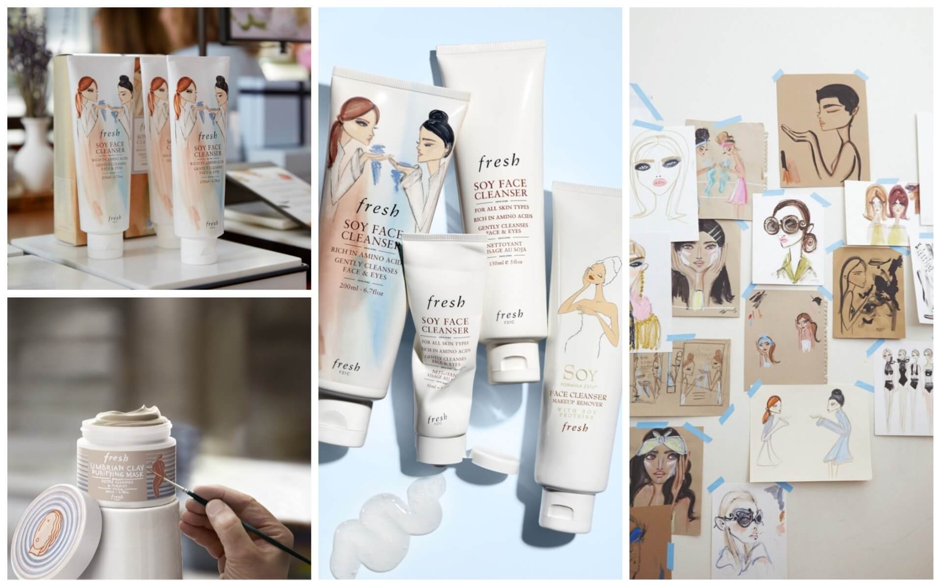 如果要為FRESH挑選品牌吉祥物,那一定是SOY FACE CLEANSER上面那位剛從浴室走出來,裹上頭巾和浴巾的大 豆女孩吧!誕於1999年的大豆卸妝潔面乳實在太深入民心,品 牌由去年開始已密鑼規劃20周年慶祝活動,先跑出的是一個 全新的大豆女孩形象,其實是兩個才對呢,出自紐約時尚插 畫 家BLAIR BREITENSTEIN的 手 筆, 當 上2018年 限 量 版 SOY FACE CLEANSER。今年終於等到20周年了,原創的 浴巾大豆女孩終於爭取到復刻機會,讓用家回味當年大豆成 分如何瘋魔美容界。FRESH的藝術情操不但聚焦於這支卸 妝潔面乳,還有經典的UMBRIANCLAY和SUGARLIP TREATMENT限量版12星座系列。2017年,品牌找來意大 利中部地區UMBRIAN著名的手工陶瓷品牌ROMETTI,為 UMBRIAN CLAY設計限量版裝潢,瓶上的伊特魯里亞婦女 輪廓結合前衞的幾何圖案及現代化的剪影勾畫,藉以宣揚品 牌與意大利小村莊UMBRA結緣的動人故事。