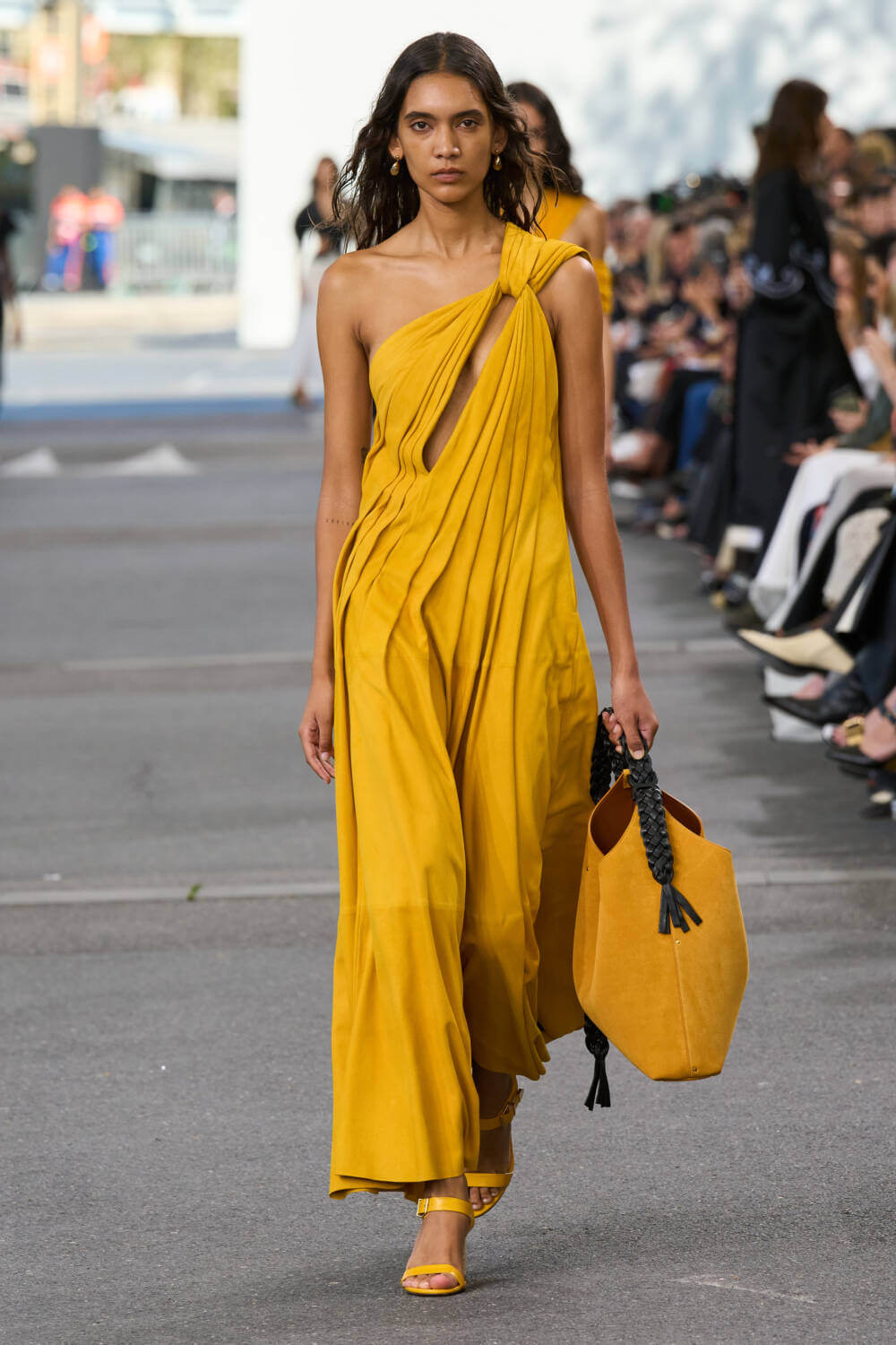「CHLOÉ」在希臘語中解作「嫰芽」,2024年春夏系列從植物取材,配以代表清晰的重點色調,並以橘黃色、珊瑚紅色和銀色代表啟蒙。馬蹄蘭的管狀形態化作黑色浸染羊皮披落式半截裙和連身裙的俐落曲形,以及騎士皮褸和乾濕褸曲線柔和的拉鏈開口。以金屬色皮革和羊毛打造的連身裙展現精緻的弧形縫線、鏤空細節、燈籠袖和低胸領口,呼應蘭花左右對稱的形態。以陶瓷搭扣點綴的大幅羊毛縐綢平織布料宛如簕杜鵑般盛放,如自由蔓生的藤蔓