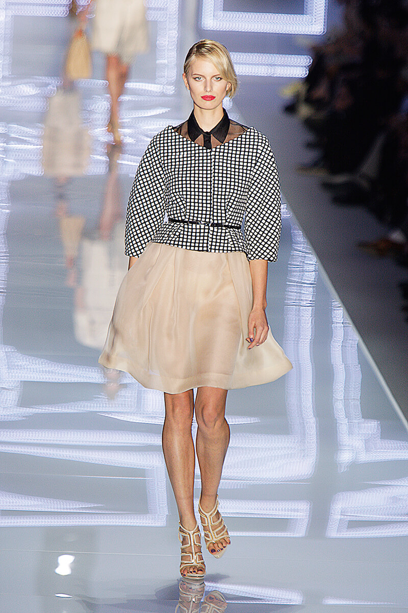 也許因為自從 John Galliano 離任後,Dior 創作總監仍未知花落誰家,所以經過一季之後,品牌仍處於轉變中的狀態,然而較保守且商業化的設計亦不失為權宜之策。來到 Bill Gaytten 第二度創作的春夏系列,雖沒明顯的中心主題或靈感來源,但不難發現 Gaytten 從品牌資料庫中尋找不少適合日間或晚間的作品,再加以重新包裝或詮釋,例如將經典的 Bar 外套配上闊領及修身剪裁等。