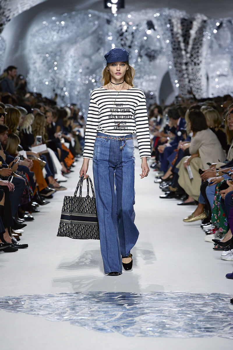 “Why have there been no great women artists?” 這個問題便赤裸裸印在法式 Breton 間條上衣,搭配60 年代剪裁的牛仔褲作開場,為求引領大家到 Maria 所浸淫的60年代 Niki 和 Marc Bohan 的時空。
