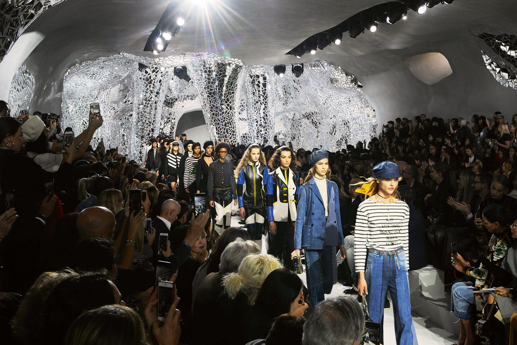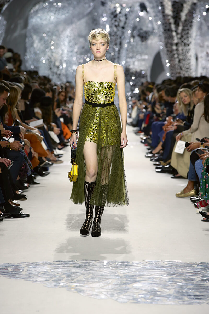 今次場地照舊在 Rodin Museum 舉行,場內都被破碎的鏡子保圍,光線不斷地在鏡子之間折射出如同鑽石的炫目光芒。整個裝潢設計是雇用80 個人將超過80,000塊的鏡子和7.2頓的凝土在20天的時間內堆砌完成。一切的切都源於Dior 最新系列的靈感女神 Niki de Saint Phalle,鏡子碎塊拼湊出震撼的場設計,手法甚至與 Niki 經典的馬賽克作品不謀而合,而成千上萬的鏡子正好能無限反射出 Dior 最新設計的輪廓!Maria 延續 Raf 的誇張排場(但真的是美呆了!) 將 Dior 推向更華麗的地步,看來 Raf 把她都快逼瘋了。