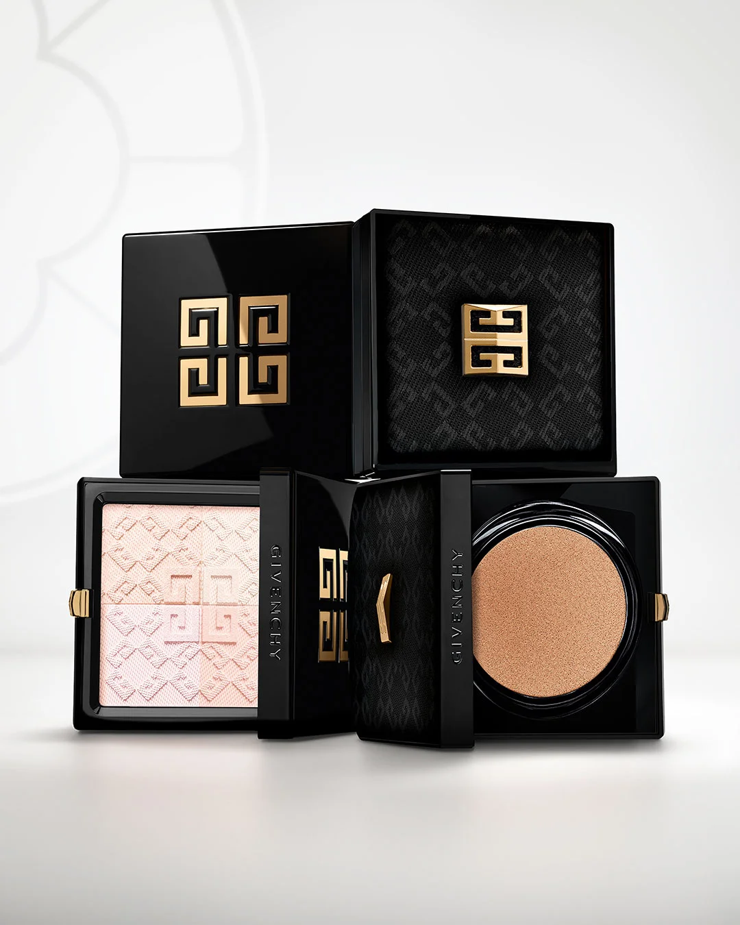 以 1972 年品牌創辦人 GIVENCHY 先生親自設計的經典 4G 標誌為靈感,高訂剪裁與經典紋理布料設計的限量版包裝,時尚精緻。氣墊粉底含護膚精華成分,妝效透亮。而全新色調 H10 SATIN IRISE 的四色蜜粉餅則可折射自然光澤,融合裸米色、粉嫩色、亮采色及冷色,可單獨使用或粉底後提亮肌理。