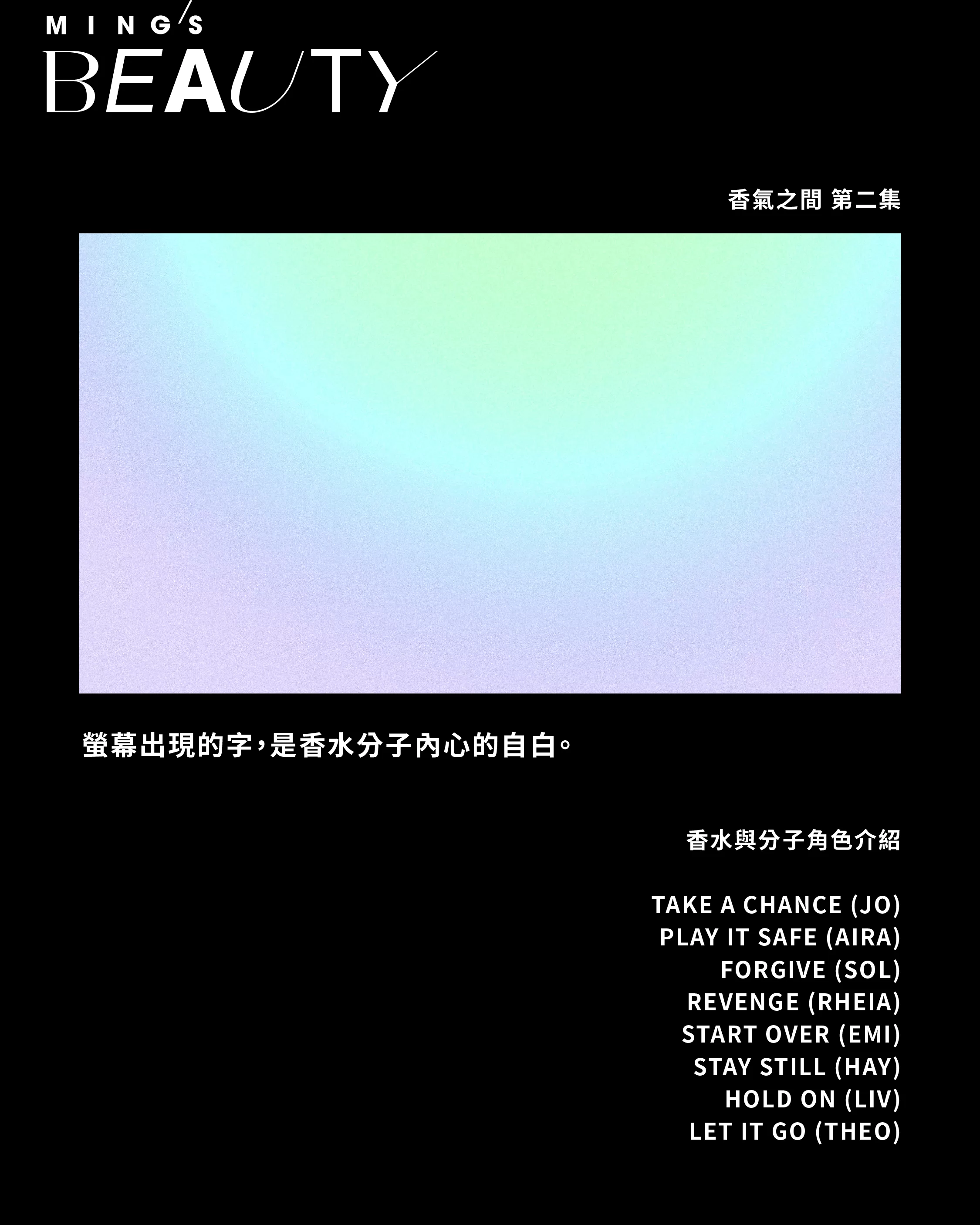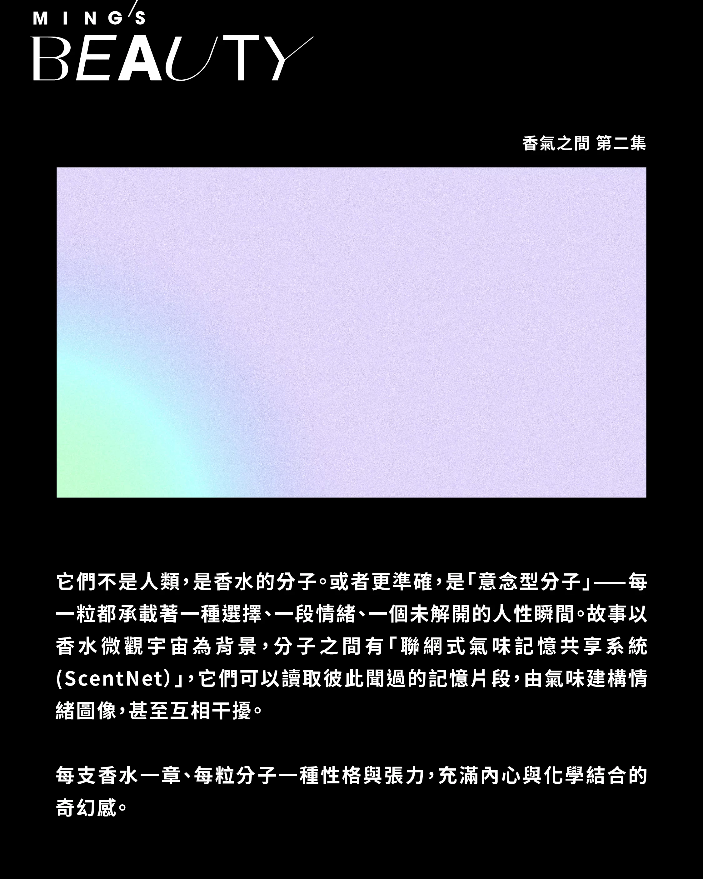 它們不是人類,是香水的分子。或者更準確,是「意念型分子」⸺每一粒都承載著一種選擇、一段情緒、一個未解開的人性瞬間。故事以香水微觀宇宙為背景,分子之間有「聯網式氣味記憶共享系統 (ScentNet)」,它們可以讀取彼此聞過的記憶片段,由氣味建構情緒圖像,甚至互相干擾。