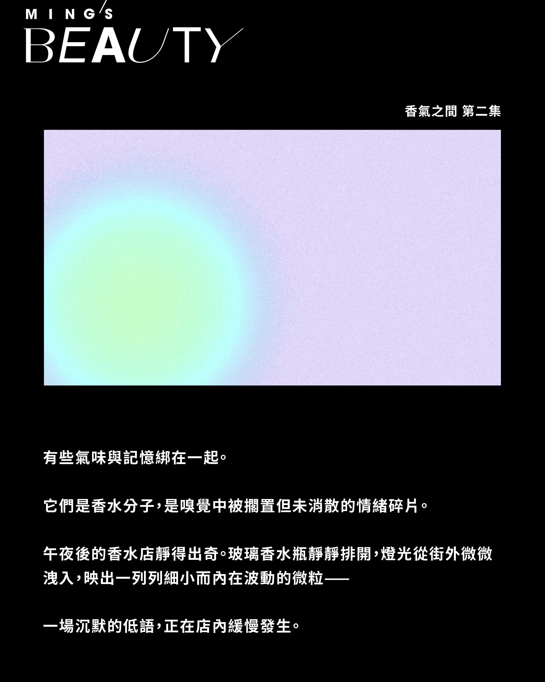 午夜後的香水店靜得出奇。玻璃香水瓶靜靜排開,燈光從街外微微洩入,映出一列列細小而內在波動的微粒⸺一場沉默的低語,正在店內緩慢發生。