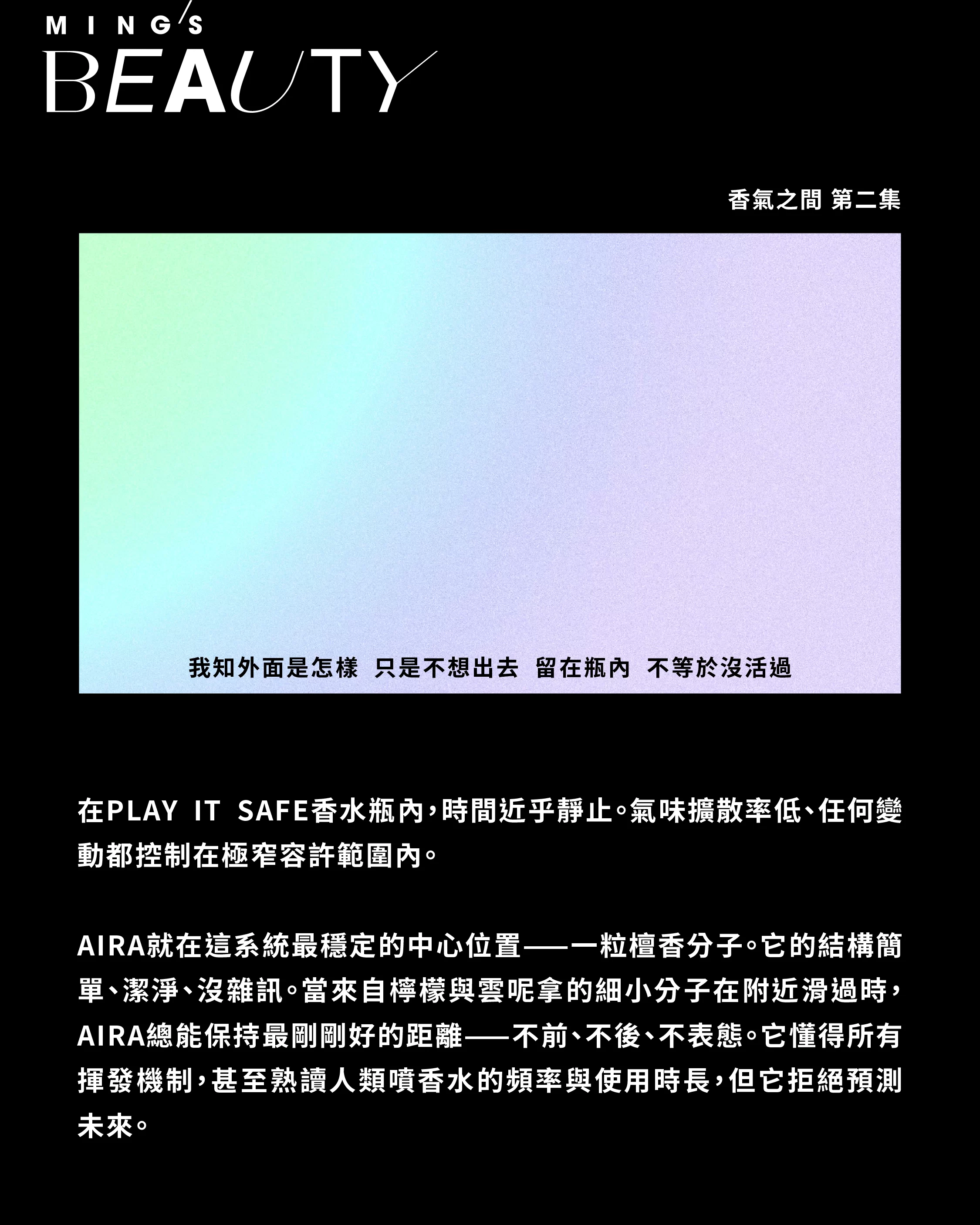 不過,此時在 AIRA 的香氣場底層,有條分子鏈開始閃爍。沒人知它幾時會變,但某部分的 AIRA 正在反思。