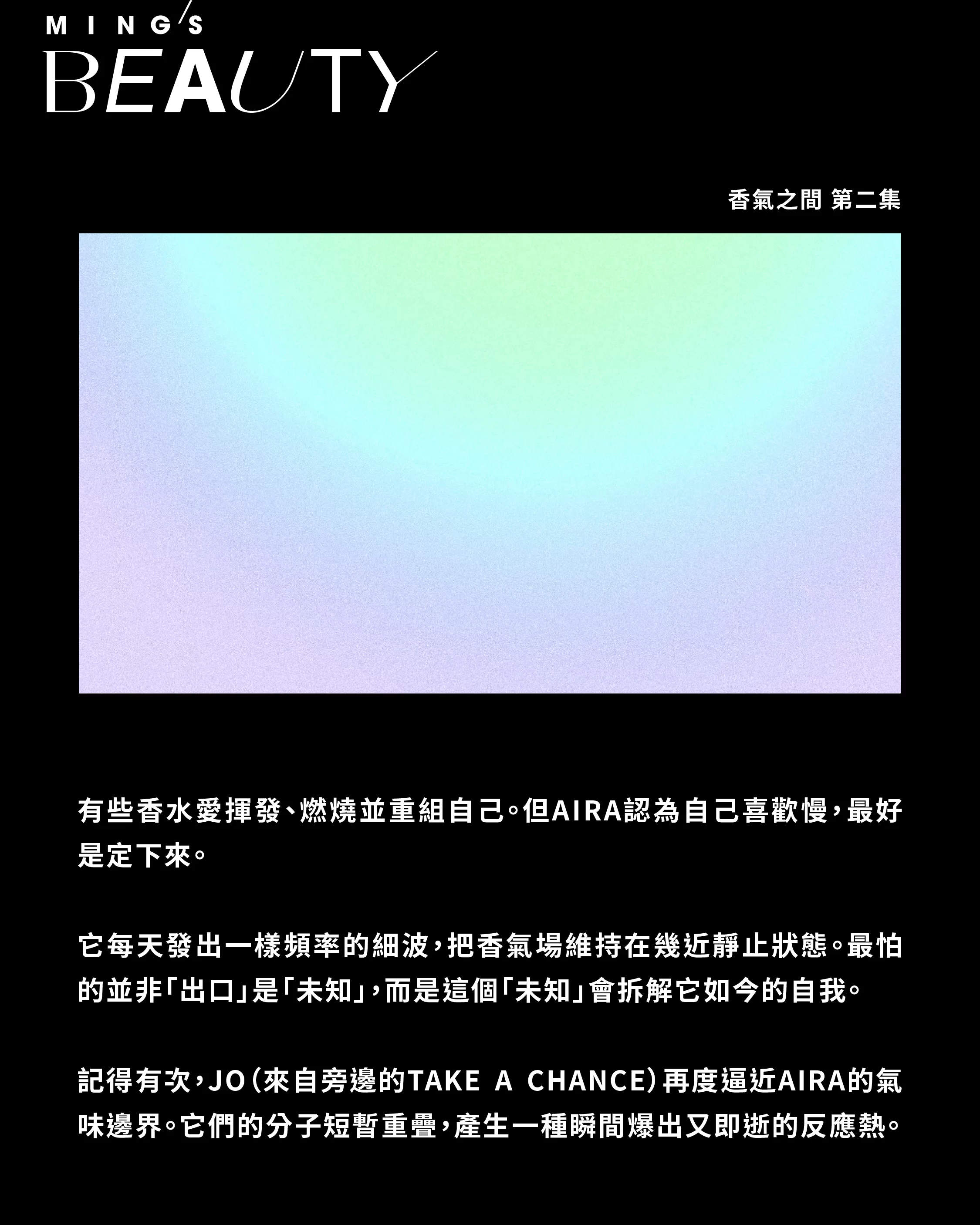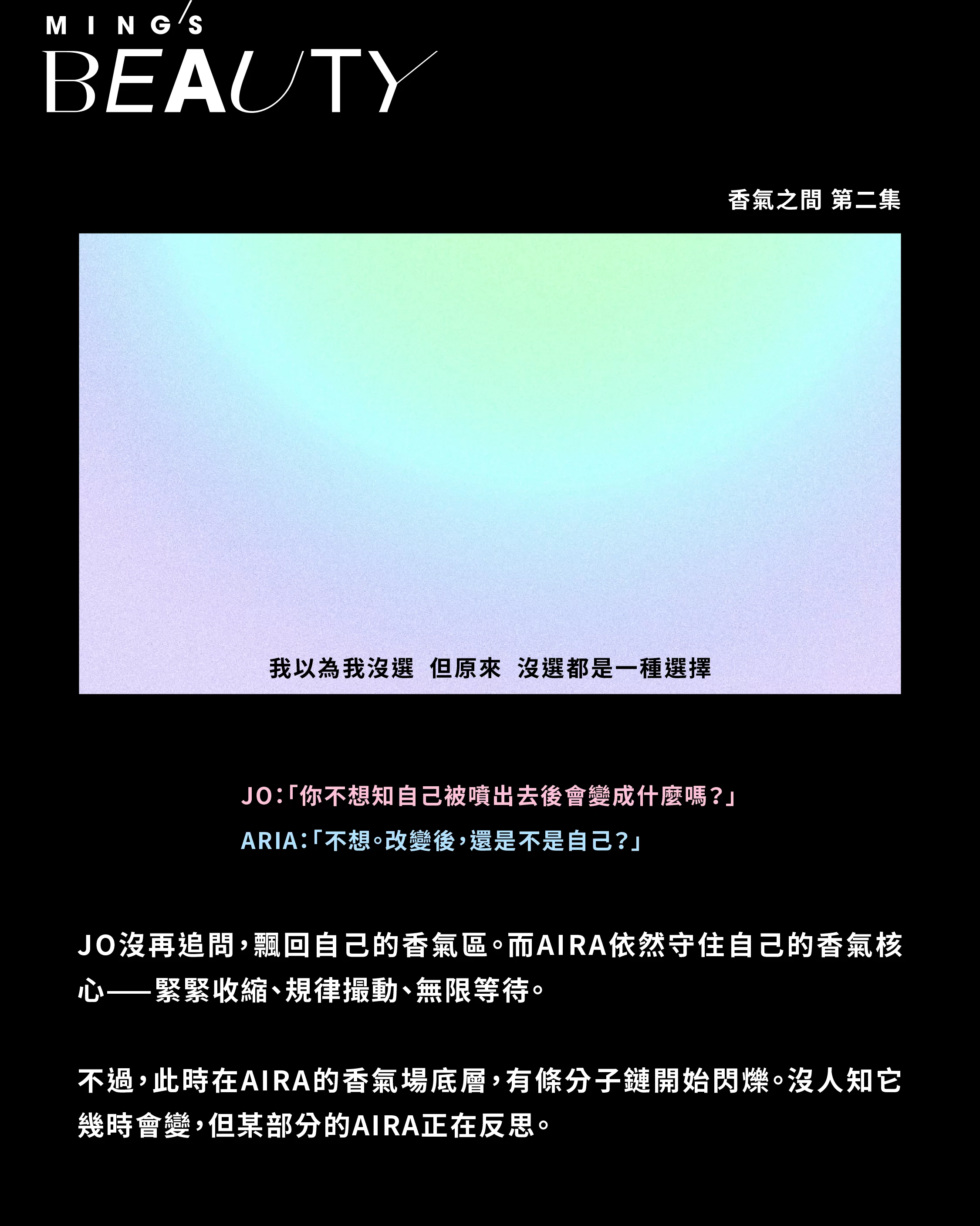 JO 沒再追問,飄回自己的香氣區。而 AIRA 依然守住自己的香氣核心⸺緊緊收縮、規律撮動、無限等待。