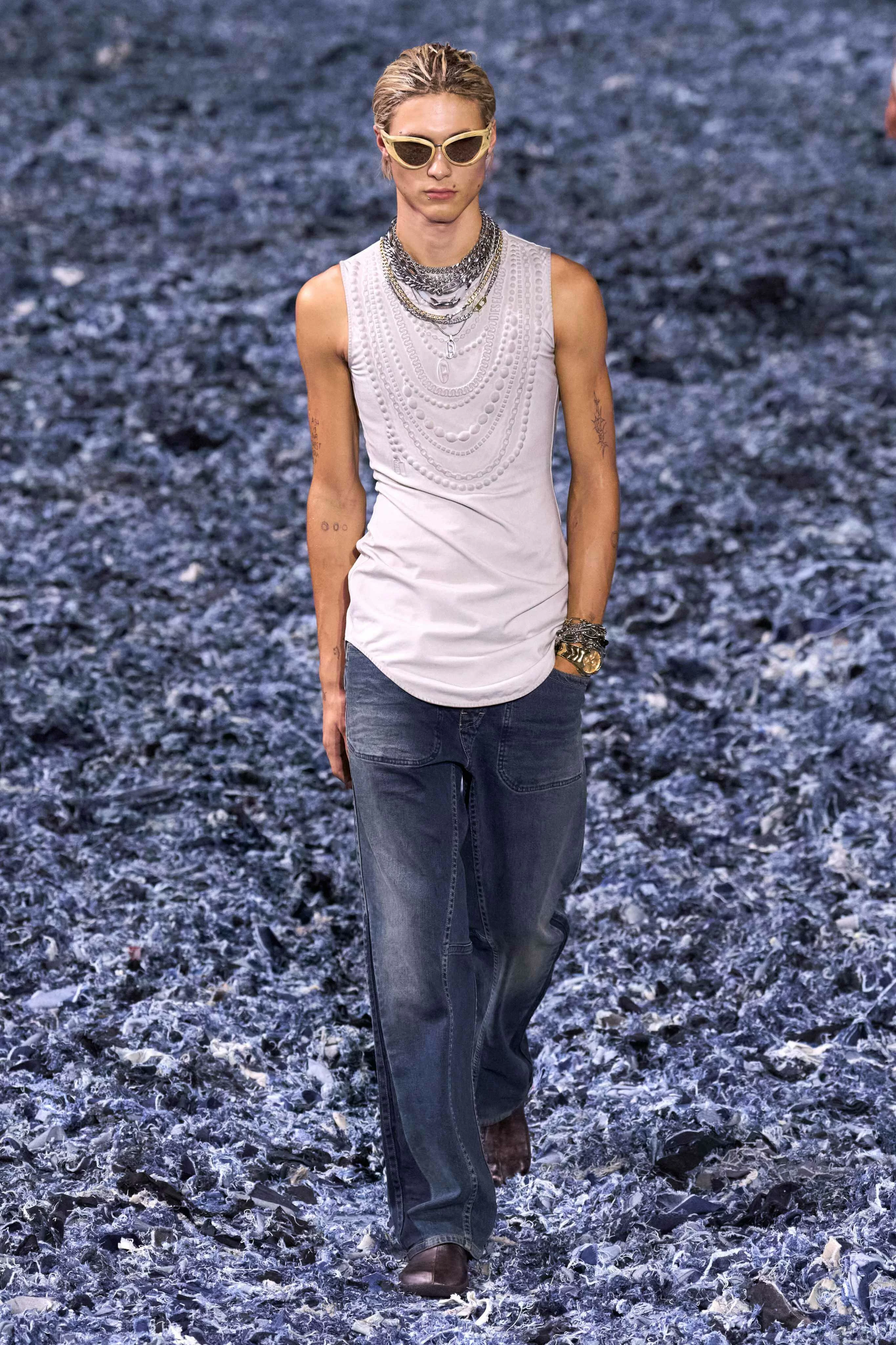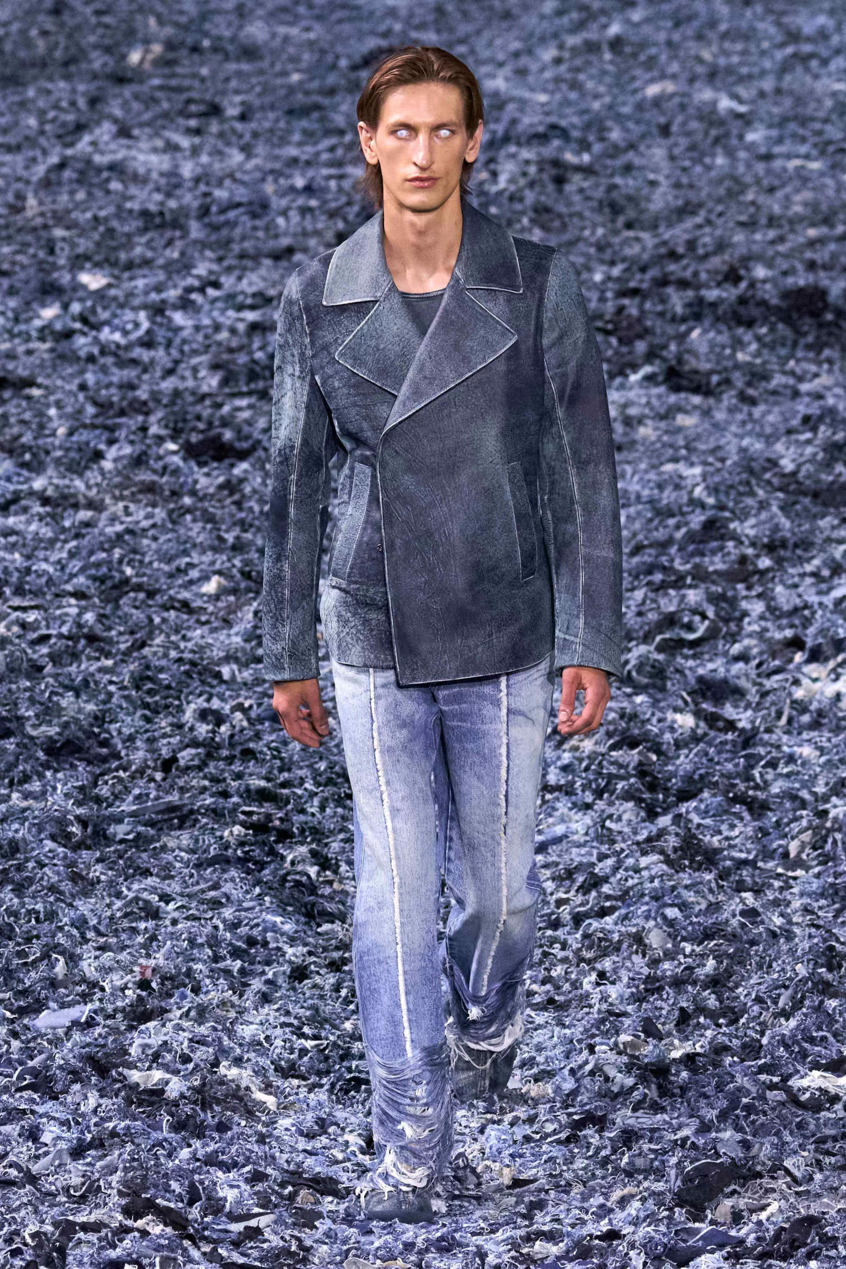 DIESEL 2025 春夏時裝展以 14,800 公斤牛仔布碎打造出沉浸式體驗,由地上延伸至柱子,讓每個賓客在踏入展場時就恍如走到牛仔世界一樣,感受當中的「廢棄之美」。背景還配合著一把猶如 AI 的聲音,朗讀著牛仔的簡介,當中更直接地道出品牌核心:DIESEL IS DENIM.