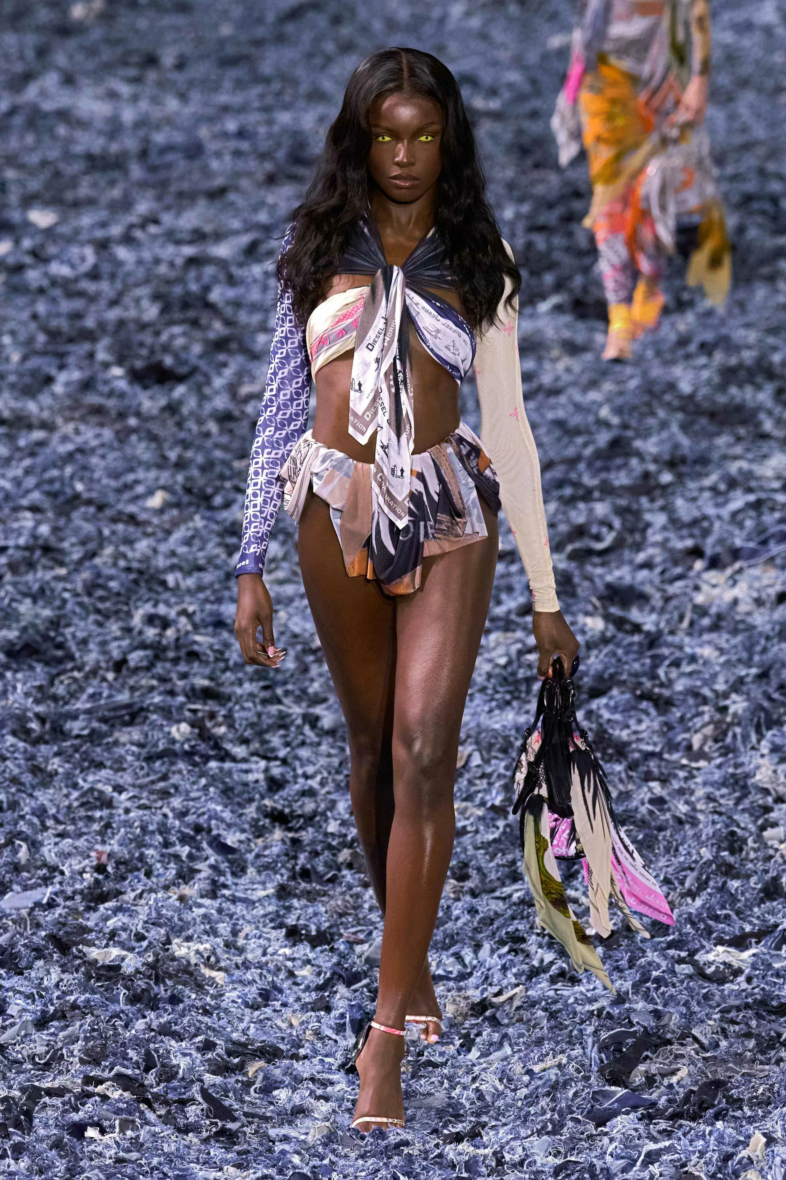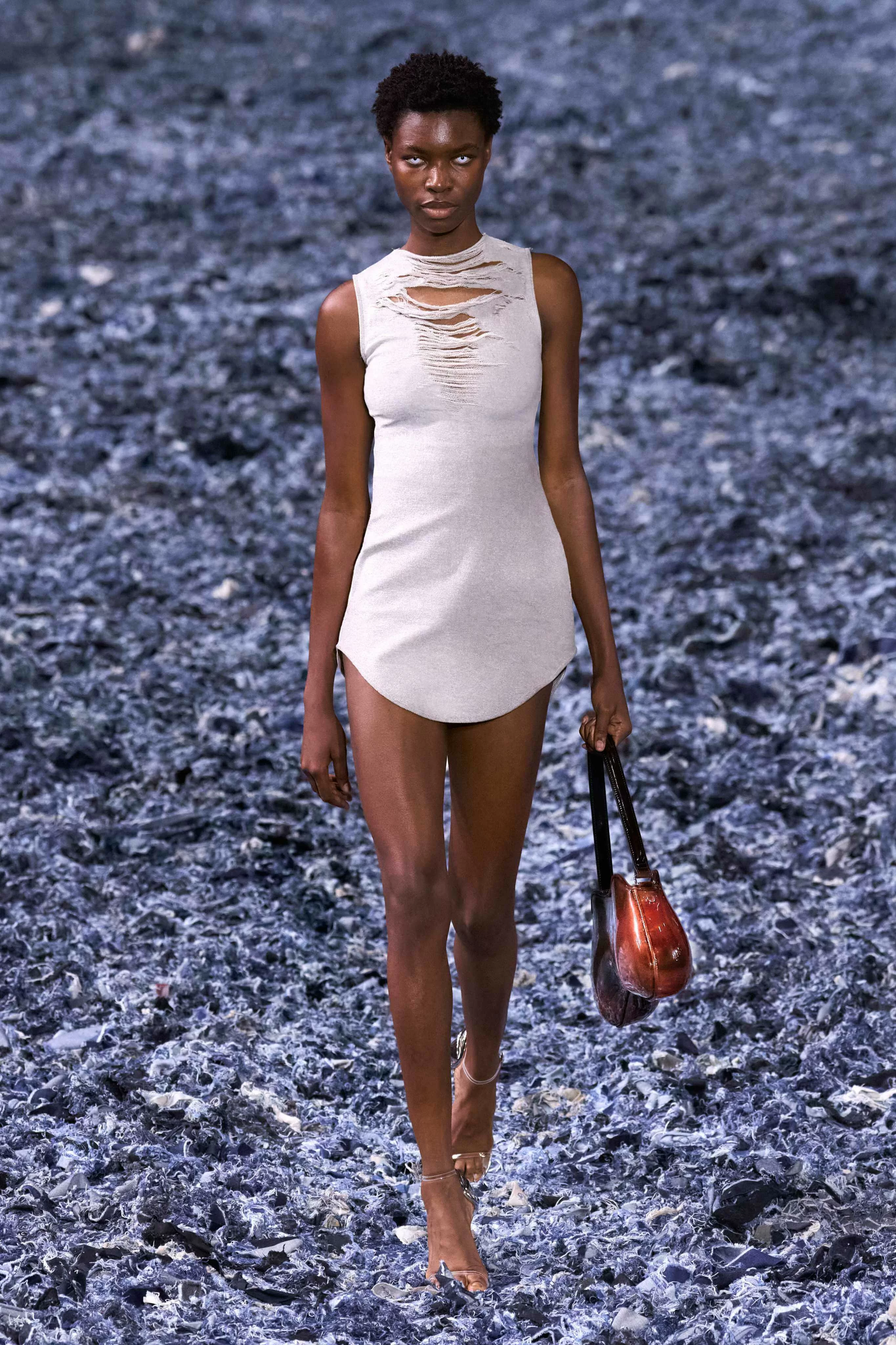 以無數廢棄牛仔線製作而成的手工製長褸;雙梭織技術為超寬鬆牛仔布帶來全新質感;經激光處理後呈現磨蝕效果,更被染成溫暖的淺啡色;長身拖地圓翻領大褸和超闊牛仔褲均來自REHAB DENIM系列;棉質衛衣、迷你裙和背心領口以 DEVORE 燒花工藝製作出彷如自然磨損的質感;棉質布料被燒蝕至露出底層薄紗,形成破爛的視覺效果;把格紋元素同樣印在 PVC 物料上,並設計成比基尼、連衣裙和西裝等,這無一不體現出品牌的實驗精神。
