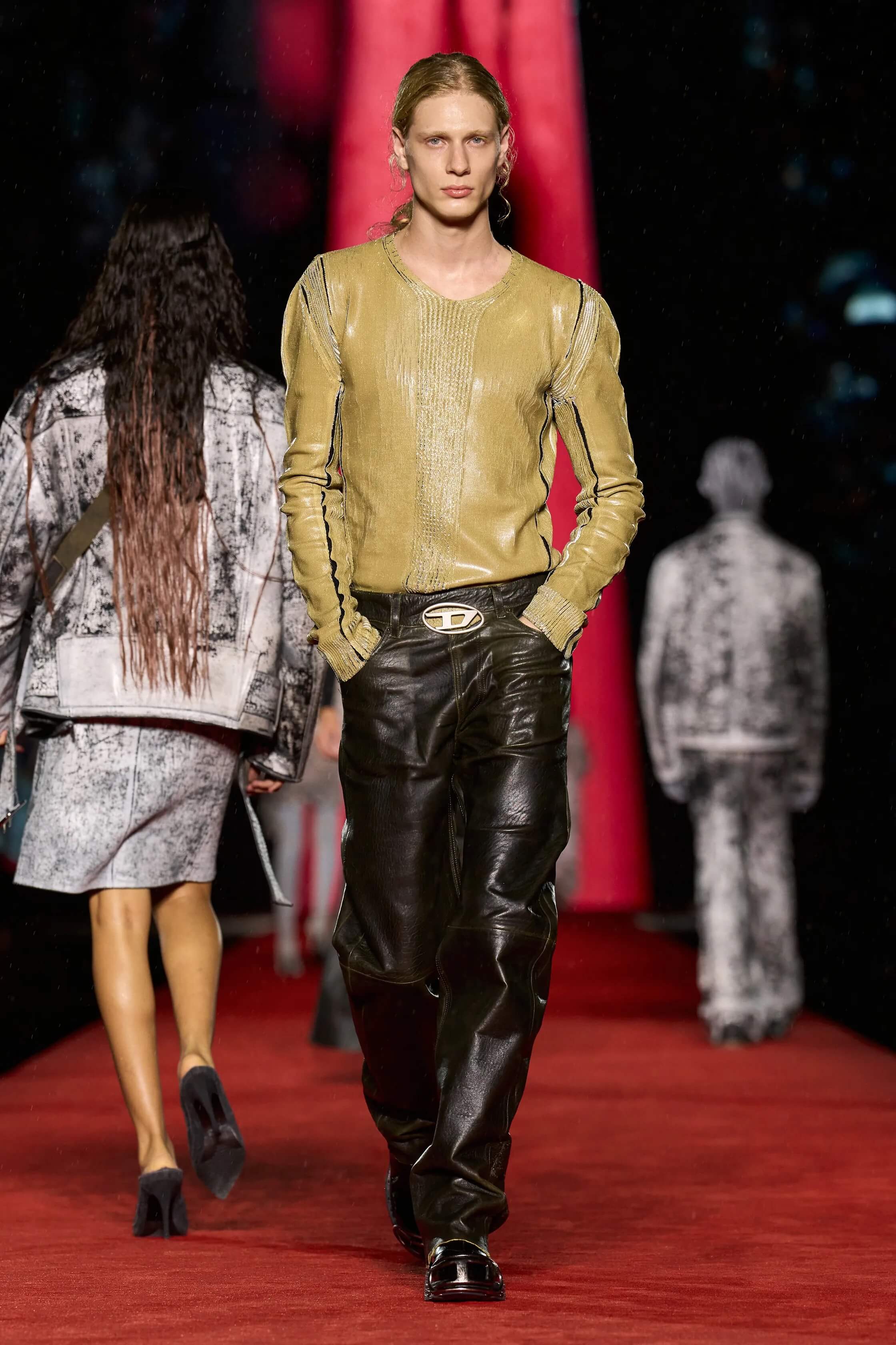 從在場內擺放巨大充氣人形到 20 萬個 DUREX 砌成山丘,每一次 DIESEL 大秀都聲勢浩大,總是玩出讓人意想不到新花樣,2024 春夏系列也是如此。 鋪上紅地毯的天橋後方是一面巨大的螢幕,突然紅燈閃爍,全場倒數近一分鐘,兩側噴出的煙霧籠罩整個舞台,像極了某位世界巨星演唱會的開場,DIESEL SS24 系列大秀就這樣在「DIESEL FOR PEOPLE, DIESEL FOR THE PARTY」的口號中,在萬眾矚目下拉開序幕。