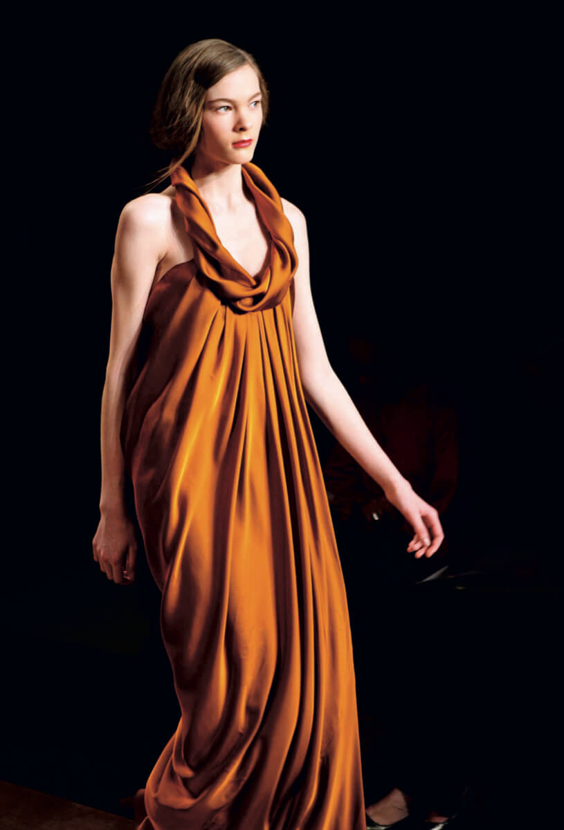 人比她更清楚現今女性的需要,Karan 早年的設計就是職場女性的最愛,今季Donna Karan 卻要為女士們尋回其浪漫的一面。一系列 Jewel tone 色系的色丁鬆身袍子是今季令人印象深刻的設計,V 領色丁背心裙、不對稱剪裁的連身裙都不是設計師慣常採用的手法,跟其一貫著重實用及可穿性的服飾有點不同,但這樣的女性形象不無吸引之處,既有嫵媚感覺,同時有結構性及 volume 的剪裁亦給予女士一份都會女性的剛強氣質。喜歡 Donna Karan 式西裝的話,這個系列亦不會令你失望,今季的大領外套、窄身長褲及毛衣是一 貫的 effortlessly chic。