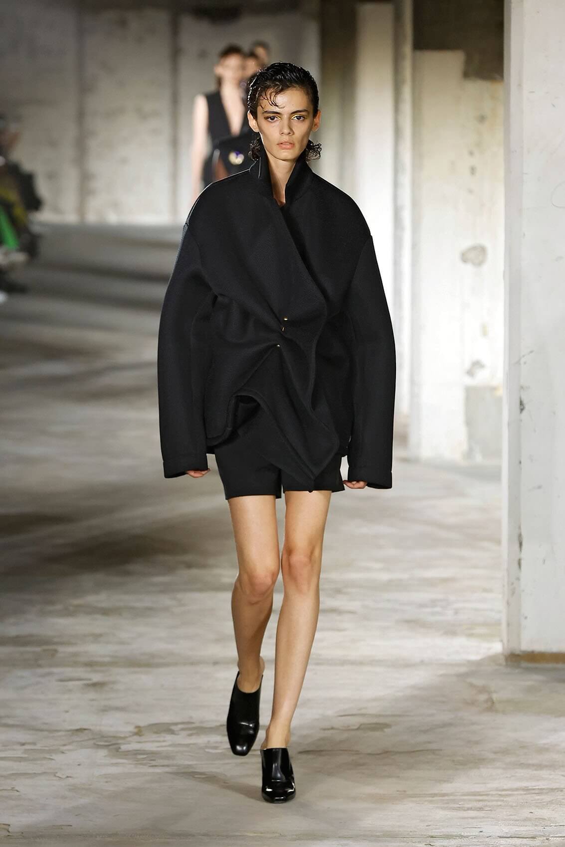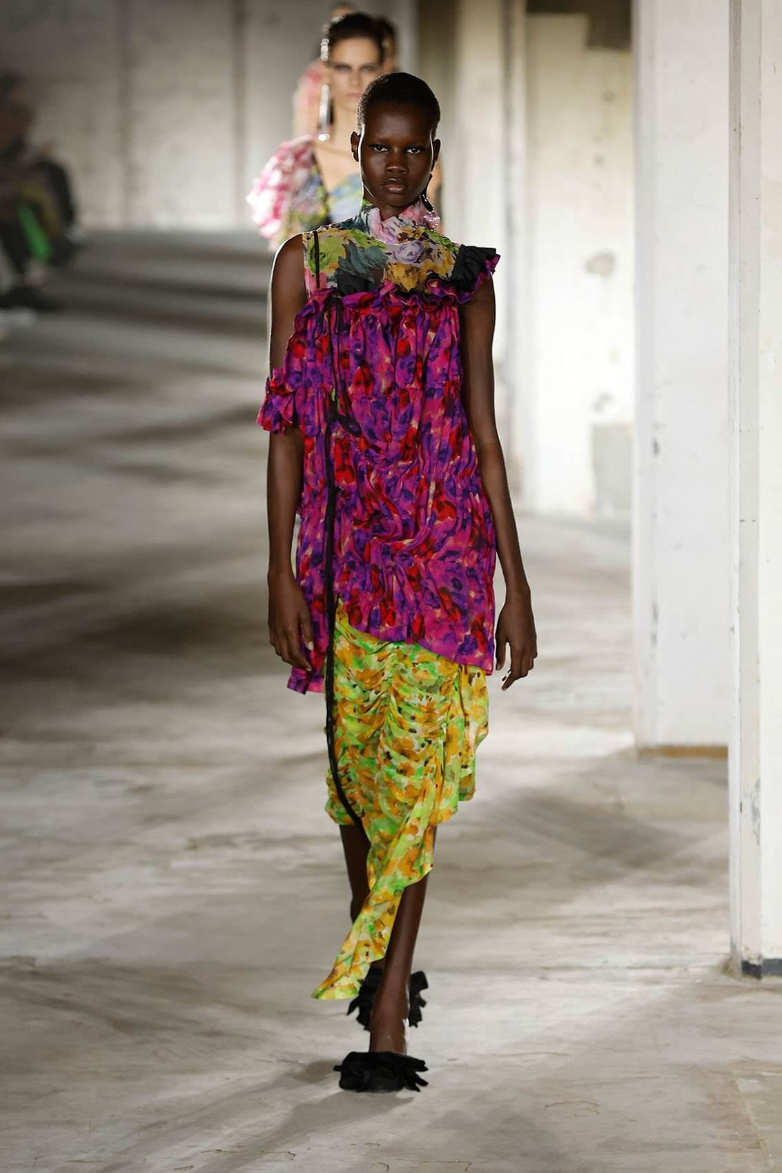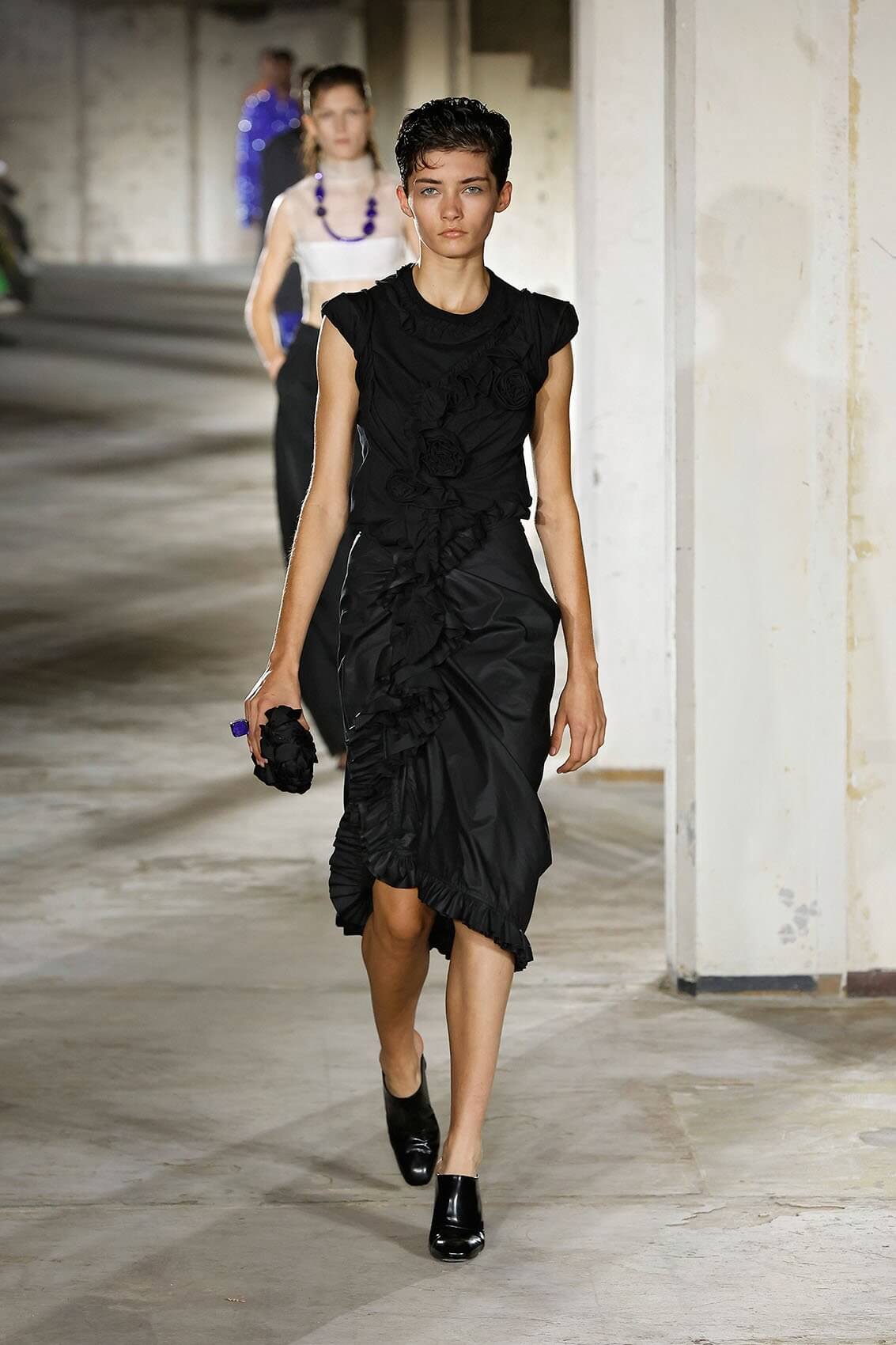 最新系列大致可以分為 3 個部份,第一個部份的靈感來自幾何派藝術家 MALEVICH 1915 年的畫作 THE BLACK SQUARE,彷彿無窮無盡的黑暗之中藏着質感。與之對照的是一反設計師常態的一系列全黑造型。正正因為沒有了色彩,立體剪裁、皺褶、流蘇和繡花得到了更純粹的展現,猶以背心裙的輪廓最為經典優雅。