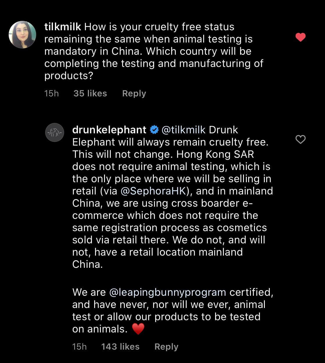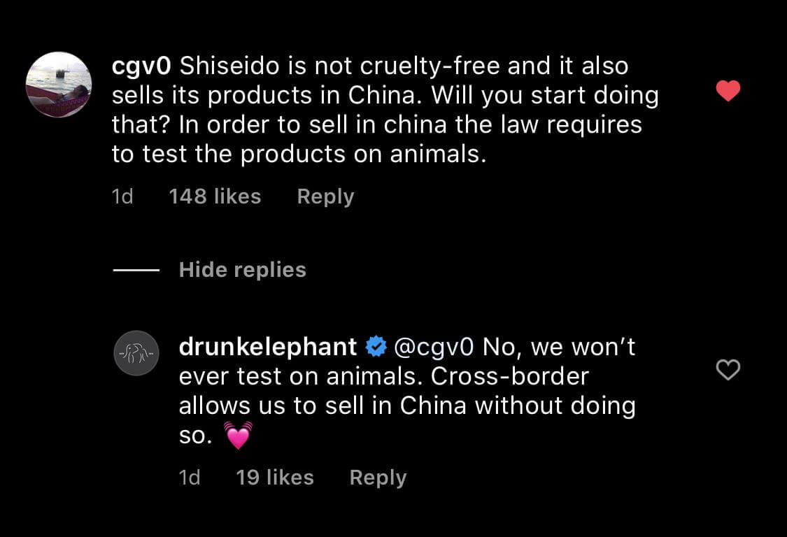 至於網友最擔心的是資生堂並非無動物測試品牌,而且旗下大部分品牌也有在中國銷售,會否令 Drunk Elephant 作出轉變?品牌解釋道 Drunk Elephant 依舊不會作任何動物測試,而中國唯一銷售點就是香港 Sephora,而香港並沒有動物測試法例。至於中國將會以電子商務銷售,與中國內陸的銷售註冊過程並不一樣,並指出他們現在及將來不會在中國擁有實體店。