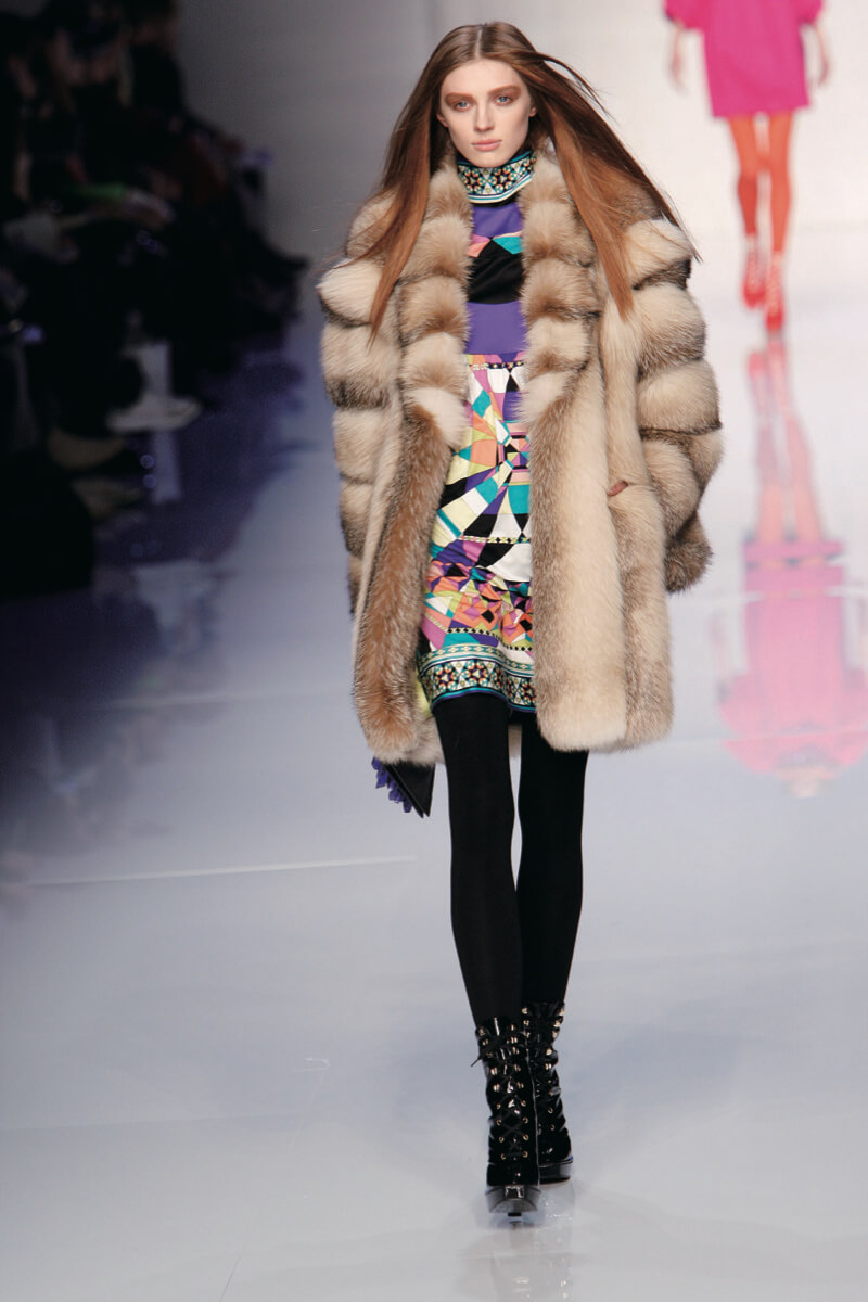 整個系列以 60 年代和滑雪運動風為骨幹,滿是運動外套、parkas、滑雪緊身褲、迷你裙、皮草衣服和皮草滾邊。同時強調皮草與不同質料組合所產生的強烈對比,像皮草與漆皮或毛冷 patchwork 併合而成為運動外套或背心;加上 Pucci 的典型 Op-Art 圖案和色彩,勾畫出在 St. Mortiz 這些著名滑雪勝地的高級時髦度假生活。沒錯!有錢人去度假和滑雪就是這樣子,從早到晚的裝 束也需要為他們打點;於是,Pucci 系列中的晚裝迷你裙搭配着運動外套和 parka,並非是天方夜譚,而是配合穿 Pucci 的人在現實生活中所需。