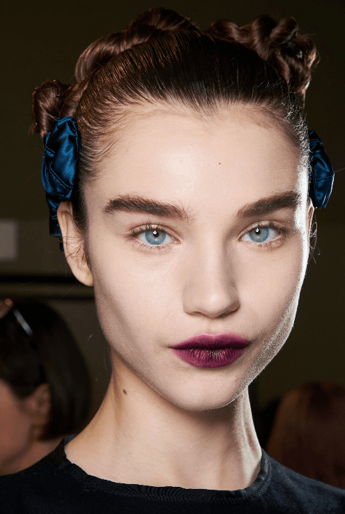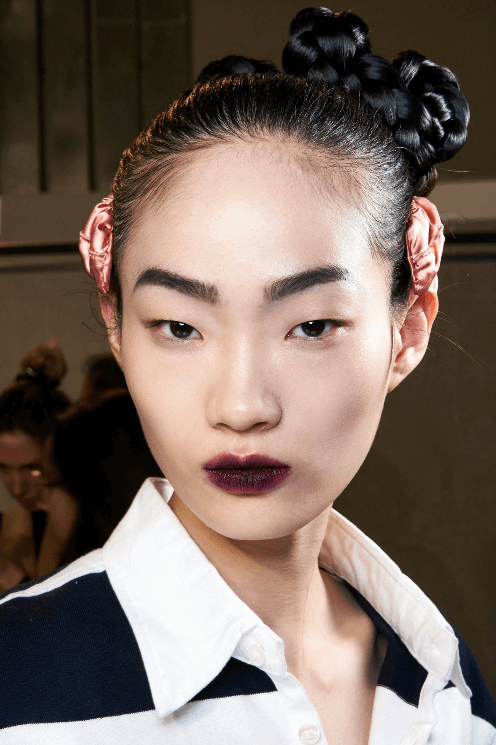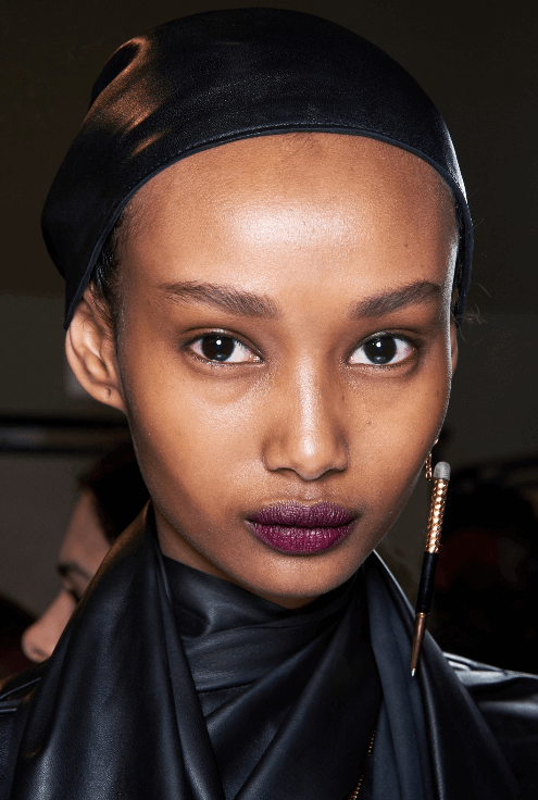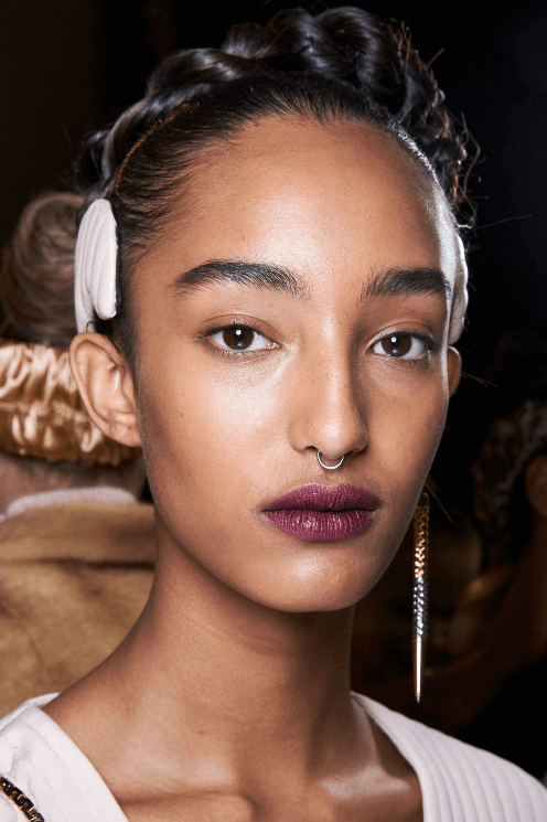 完美無瑕的底妝,是所有模特兒的妝容共通點,遮瑕和眼底打亮是在鎂光燈下呈現完美肌膚的第一要步,以及使用具柔焦效果的碎粉,作打造細緻的霧面零毛孔肌,以配搭深色調的唇妝。