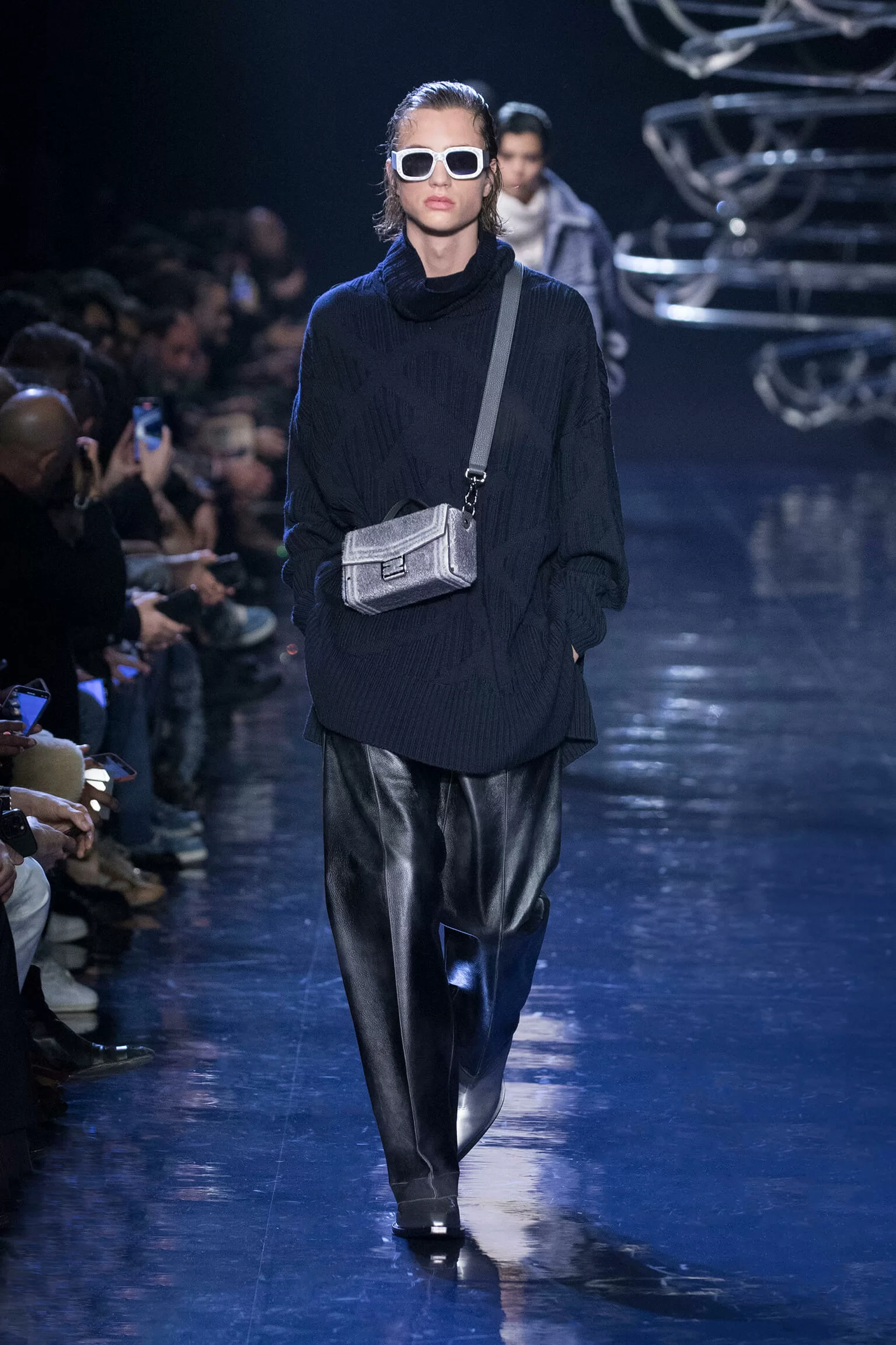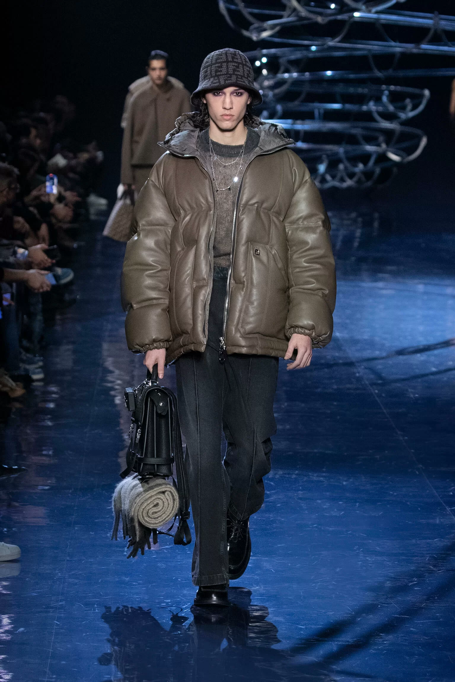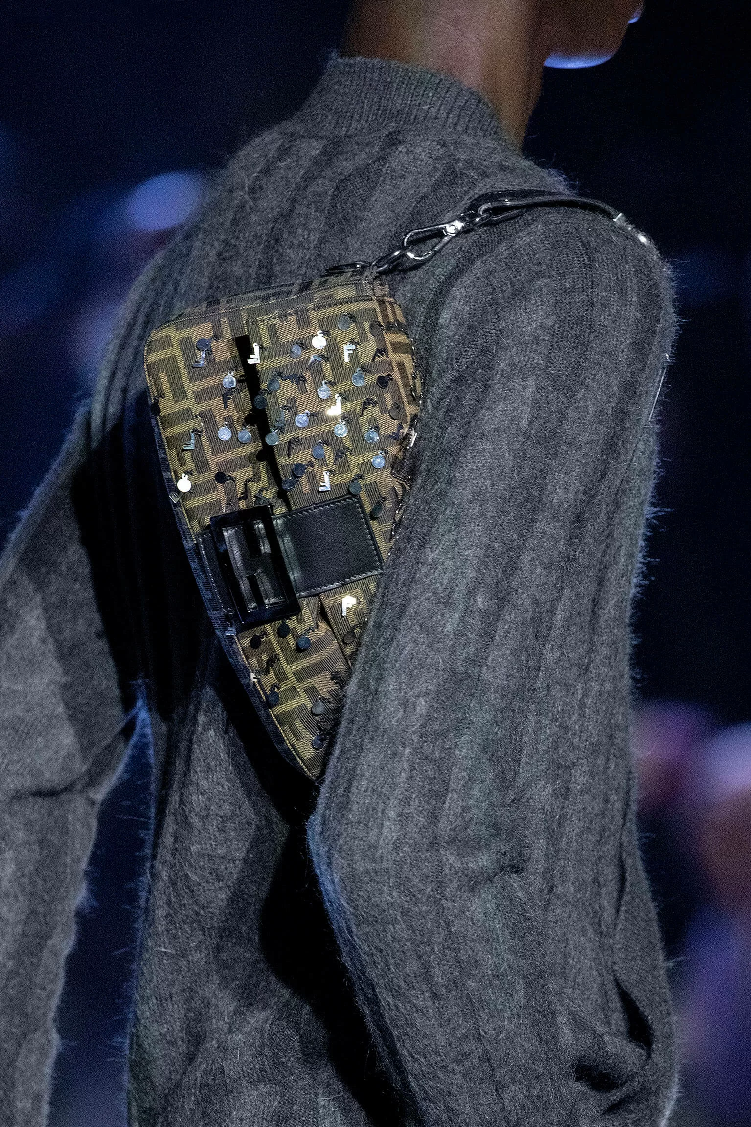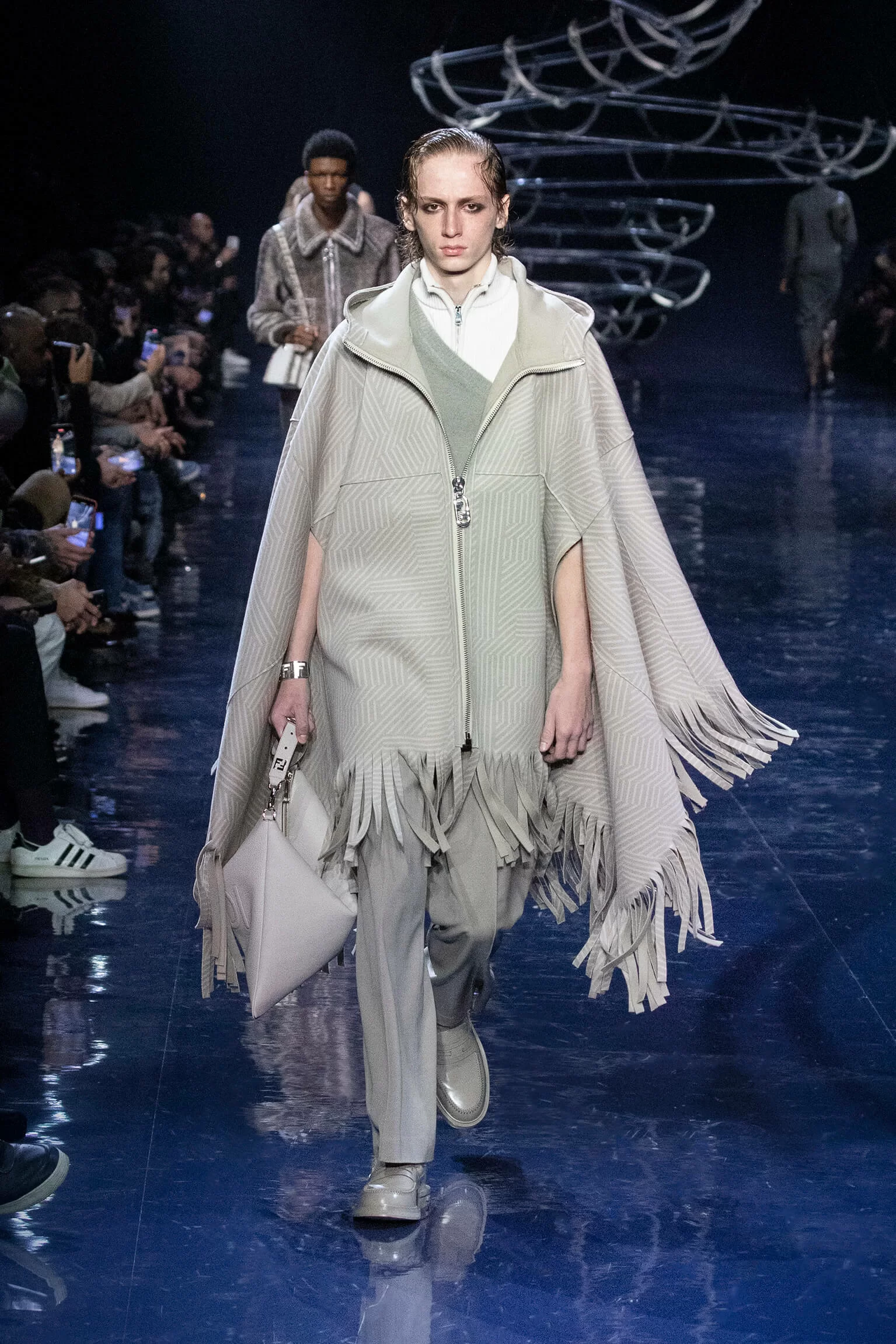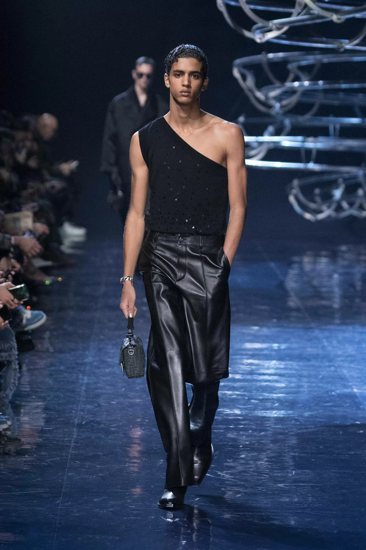 FENDI 2023 男裝秋冬時裝秀上緩緩響起 MORODER 經典之作《I FEEL LOVE》的重新編曲,傳奇天后 DONNA SUMMER 伴隨 DISCO 音樂不停重複着 I FEEL LOVE 的歌詞,正好映照出配飾及男裝藝術總監 SILVIA VENTURINI FENDI 對時尚的熱情,和在場觀眾對品牌又一個美妙系列的愛不釋手。系列探索城市入夜後的頹廢氣息和霓光閃爍的光景,,以斜肩剪裁、仿舊質感、流蘇和反光修飾貫穿,活現嶄新優雅魅力。