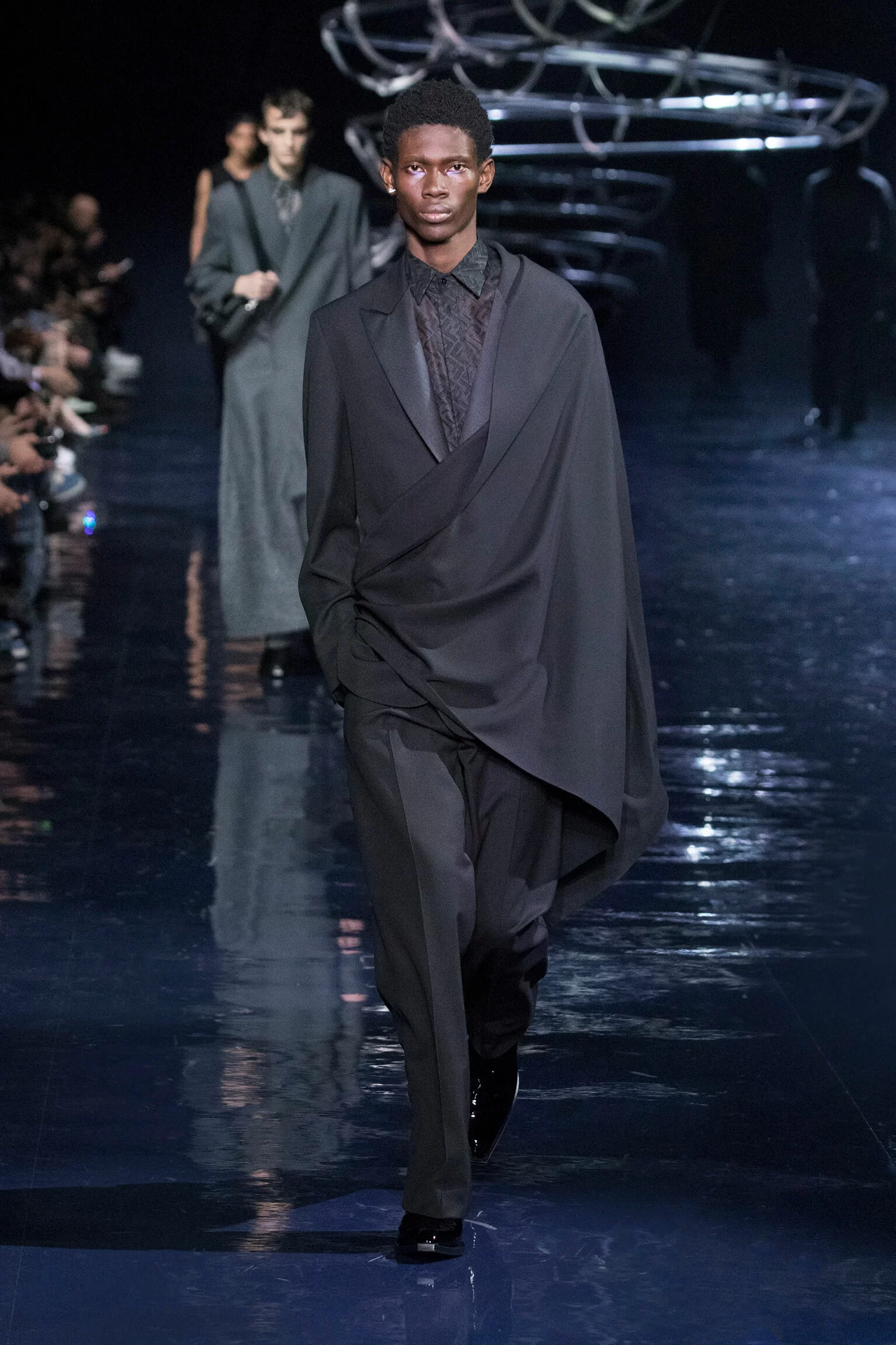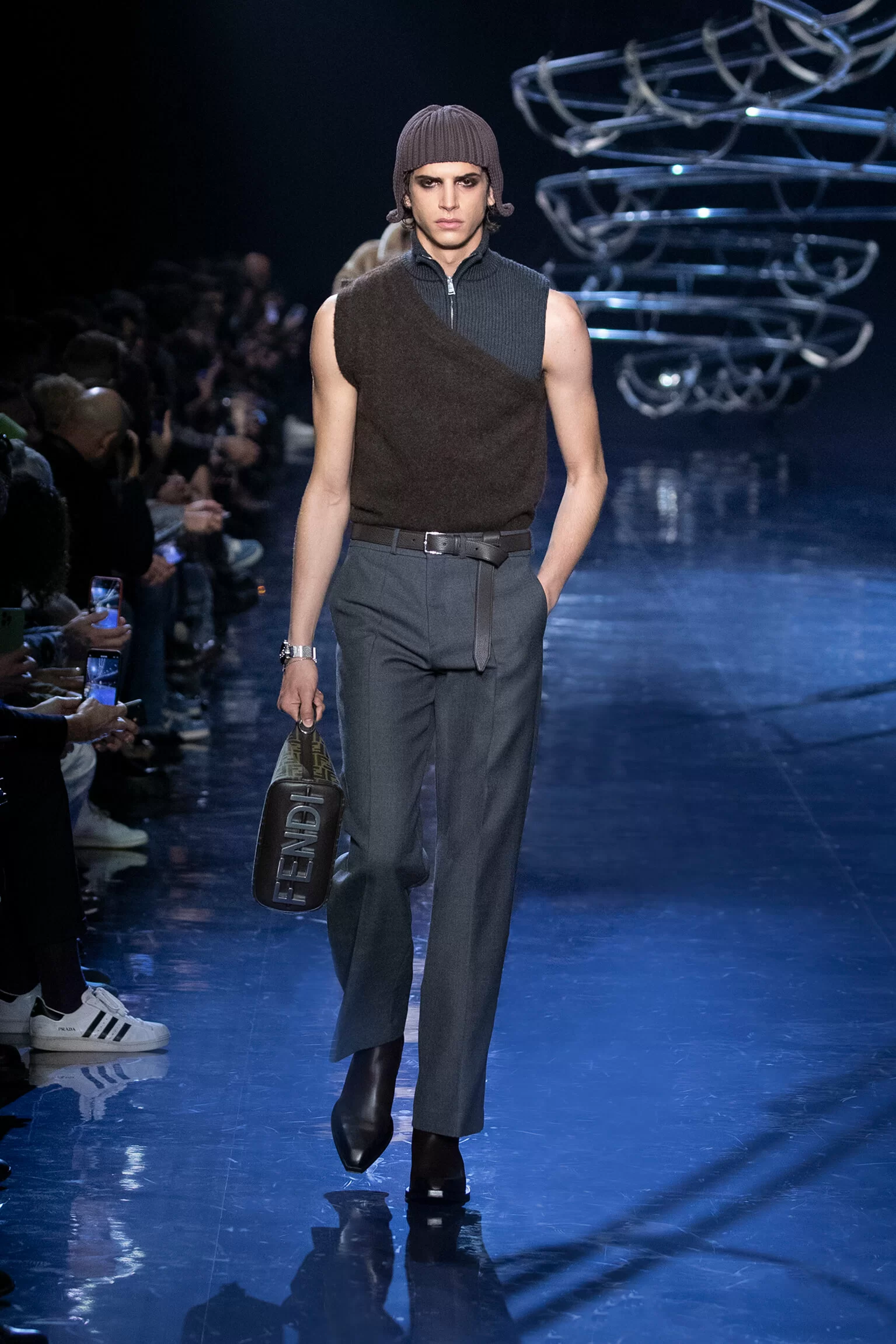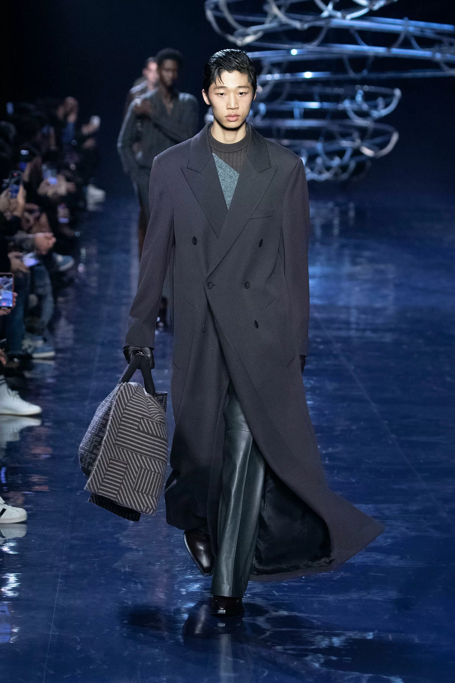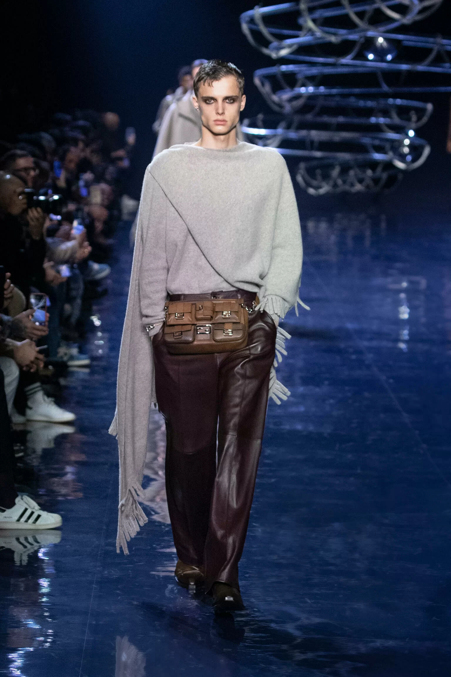 FENDI 2023 男裝秋冬時裝秀上緩緩響起 MORODER 經典之作《I FEEL LOVE》的重新編曲,傳奇天后 DONNA SUMMER 伴隨 DISCO 音樂不停重複着 I FEEL LOVE 的歌詞,正好映照出配飾及男裝藝術總監 SILVIA VENTURINI FENDI 對時尚的熱情,和在場觀眾對品牌又一個美妙系列的愛不釋手。系列探索城市入夜後的頹廢氣息和霓光閃爍的光景,,以斜肩剪裁、仿舊質感、流蘇和反光修飾貫穿,活現嶄新優雅魅力。