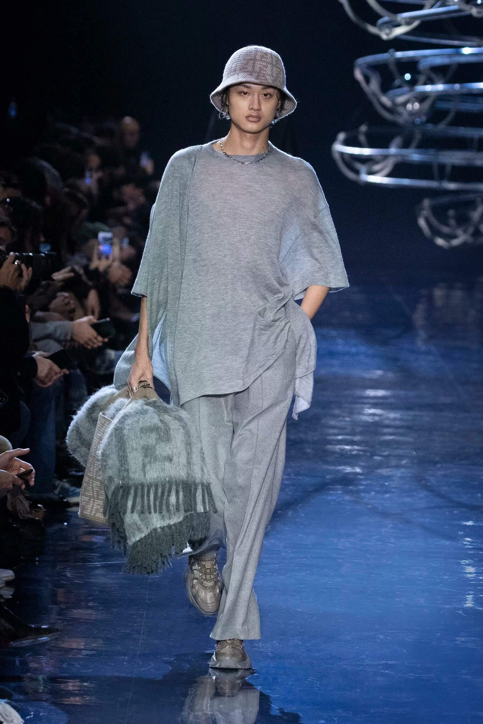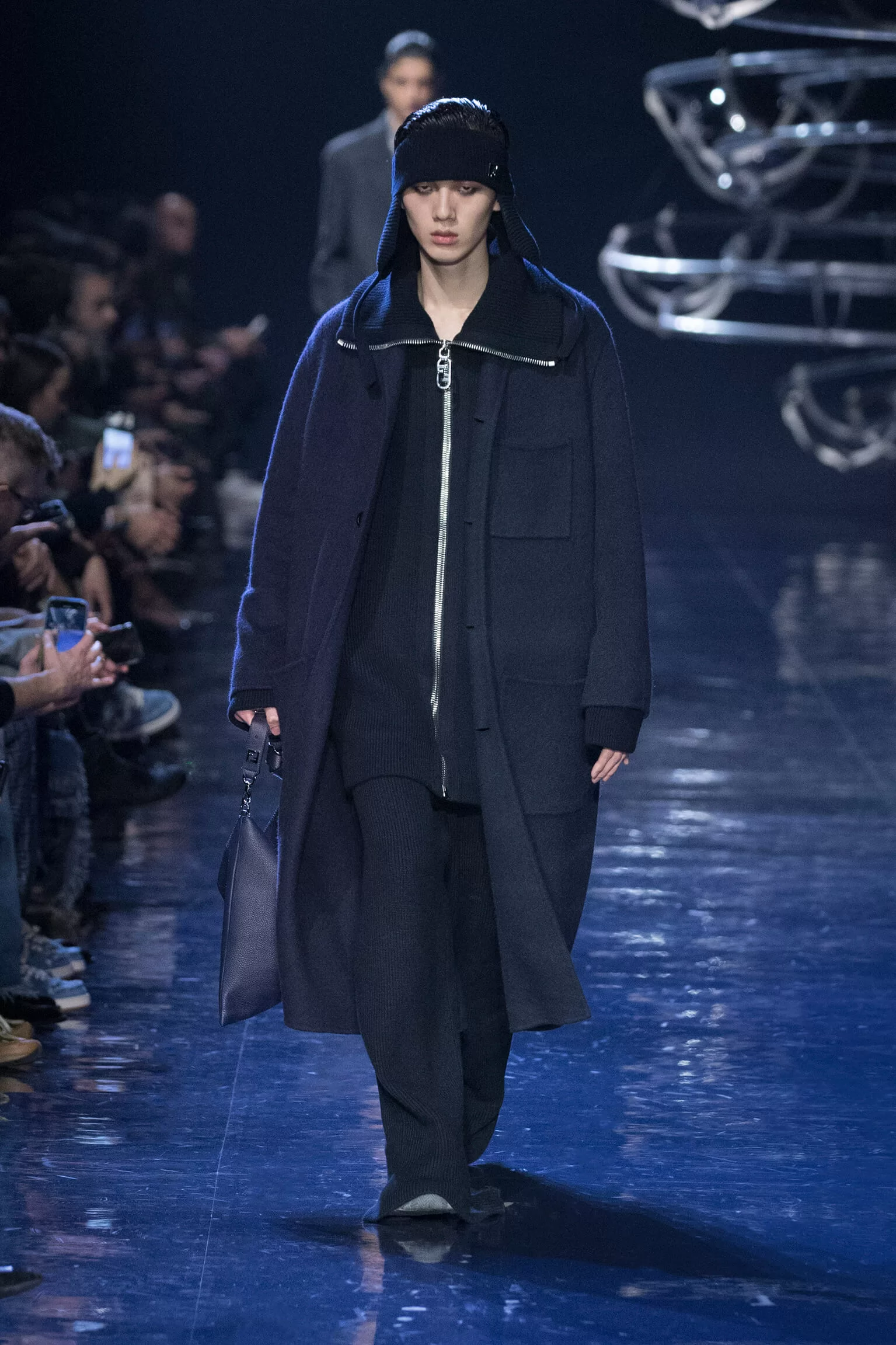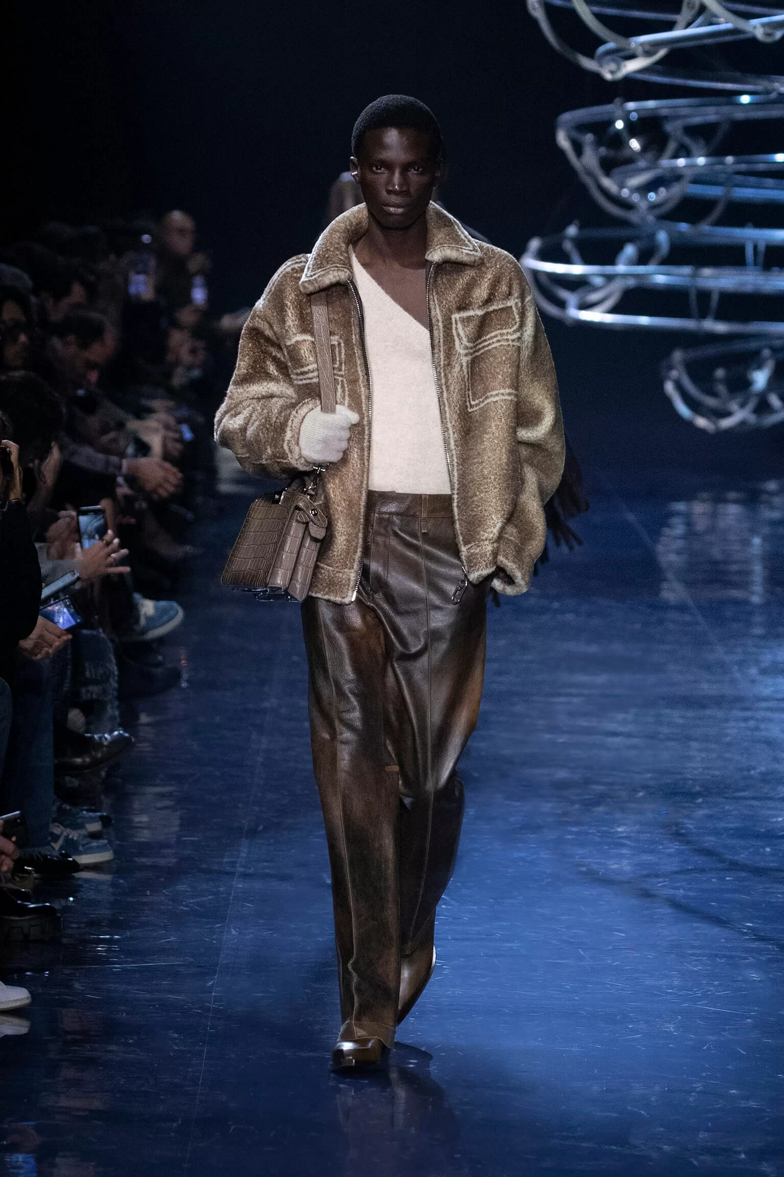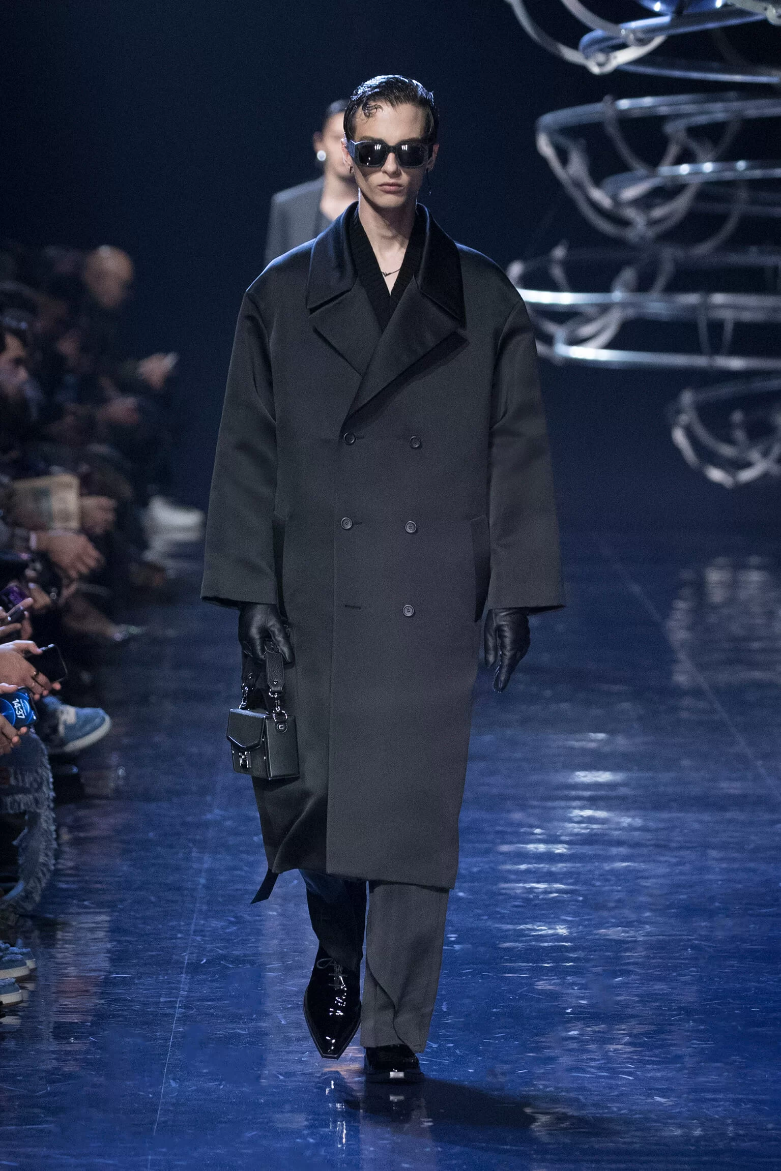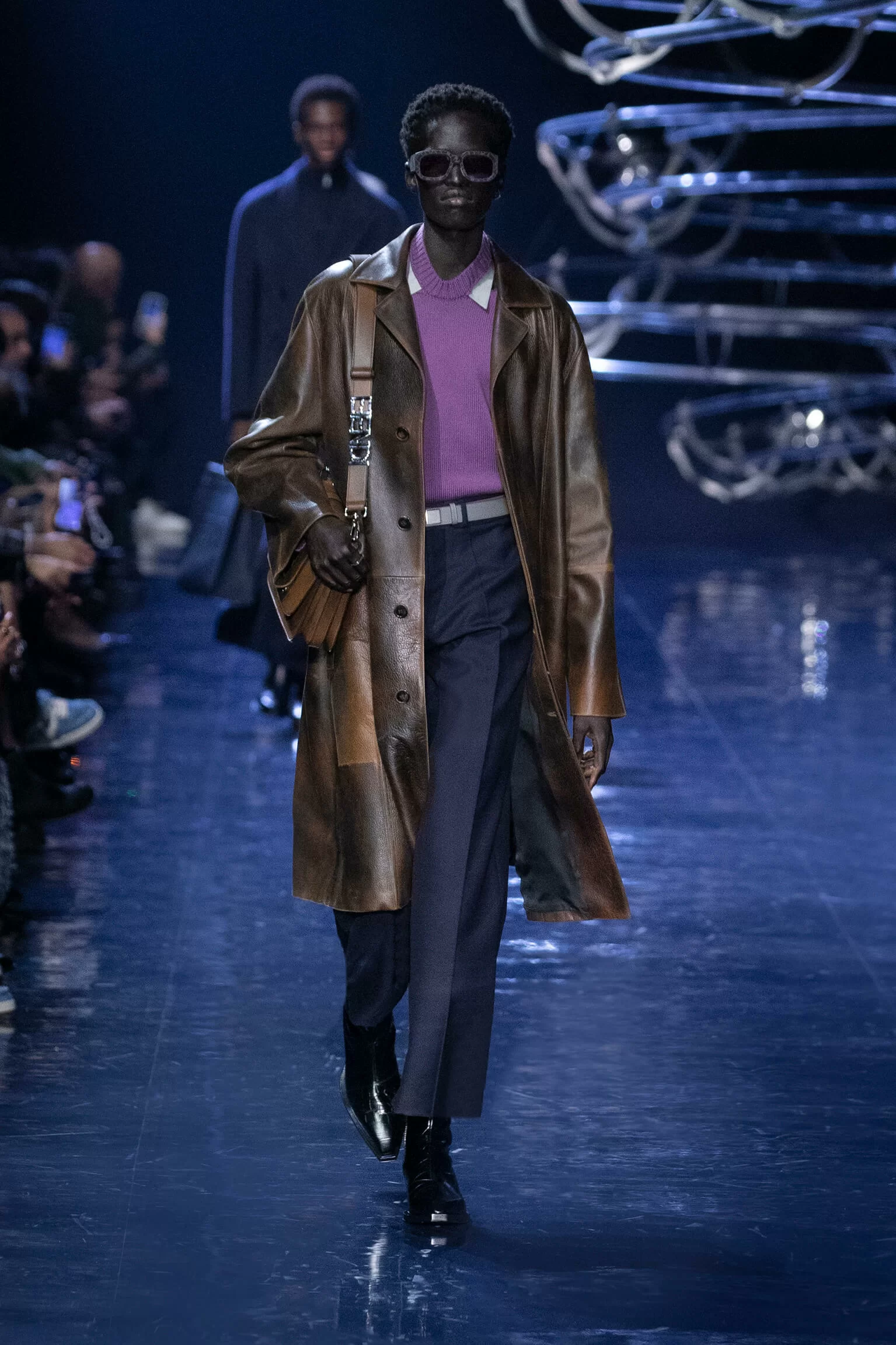 FENDI 2023 男裝秋冬時裝秀上緩緩響起 MORODER 經典之作《I FEEL LOVE》的重新編曲,傳奇天后 DONNA SUMMER 伴隨 DISCO 音樂不停重複着 I FEEL LOVE 的歌詞,正好映照出配飾及男裝藝術總監 SILVIA VENTURINI FENDI 對時尚的熱情,和在場觀眾對品牌又一個美妙系列的愛不釋手。系列探索城市入夜後的頹廢氣息和霓光閃爍的光景,,以斜肩剪裁、仿舊質感、流蘇和反光修飾貫穿,活現嶄新優雅魅力。