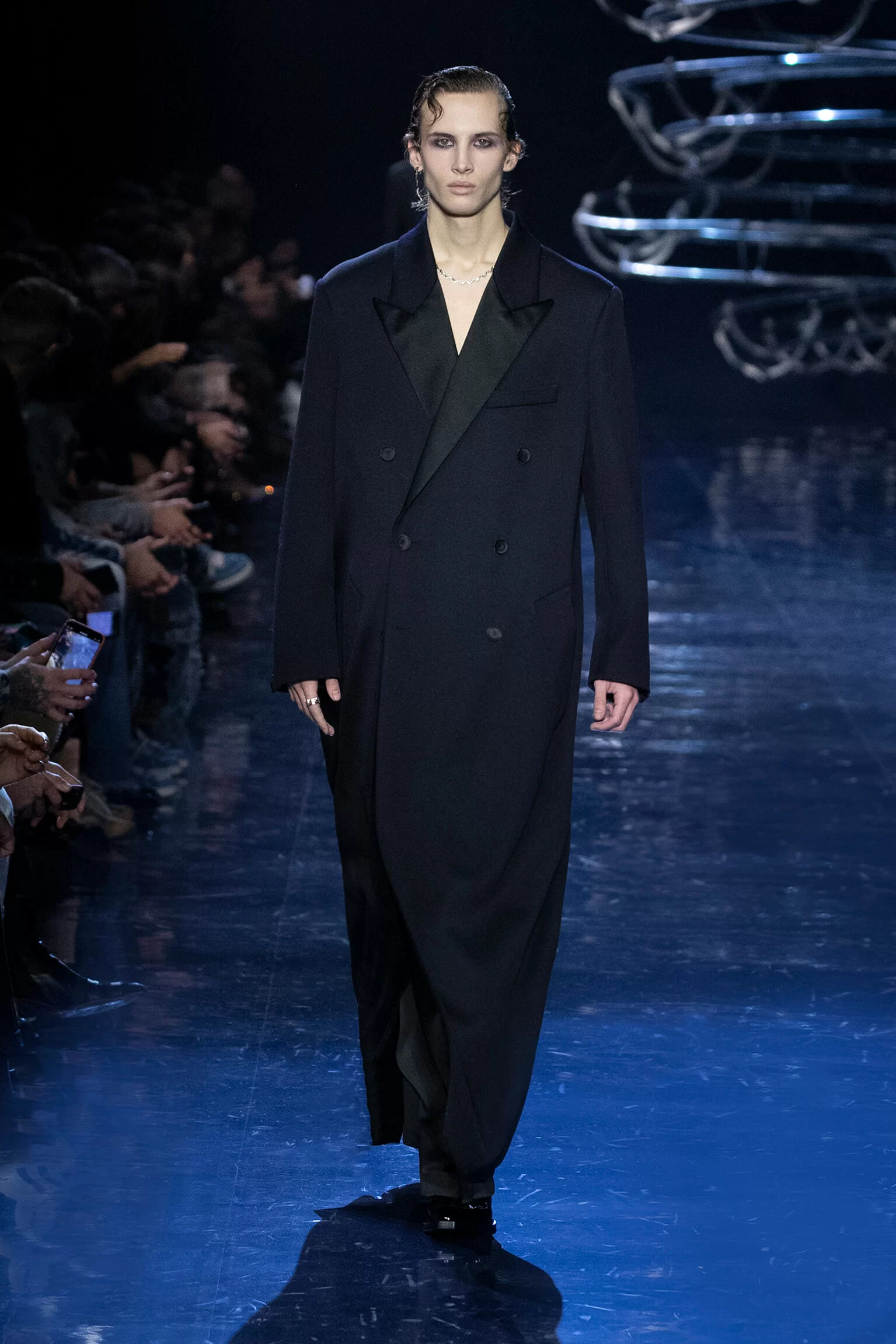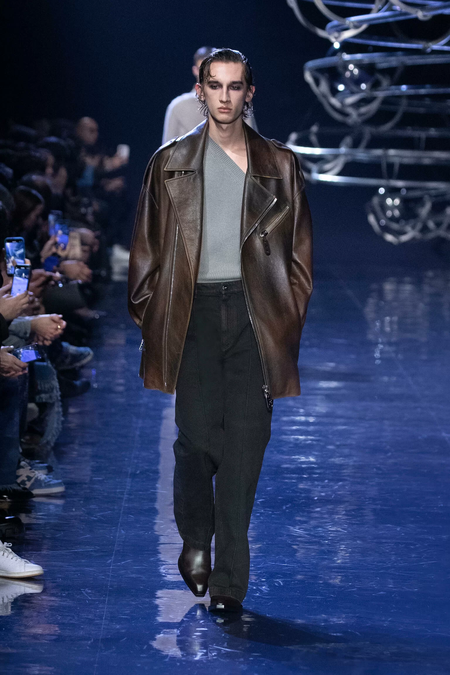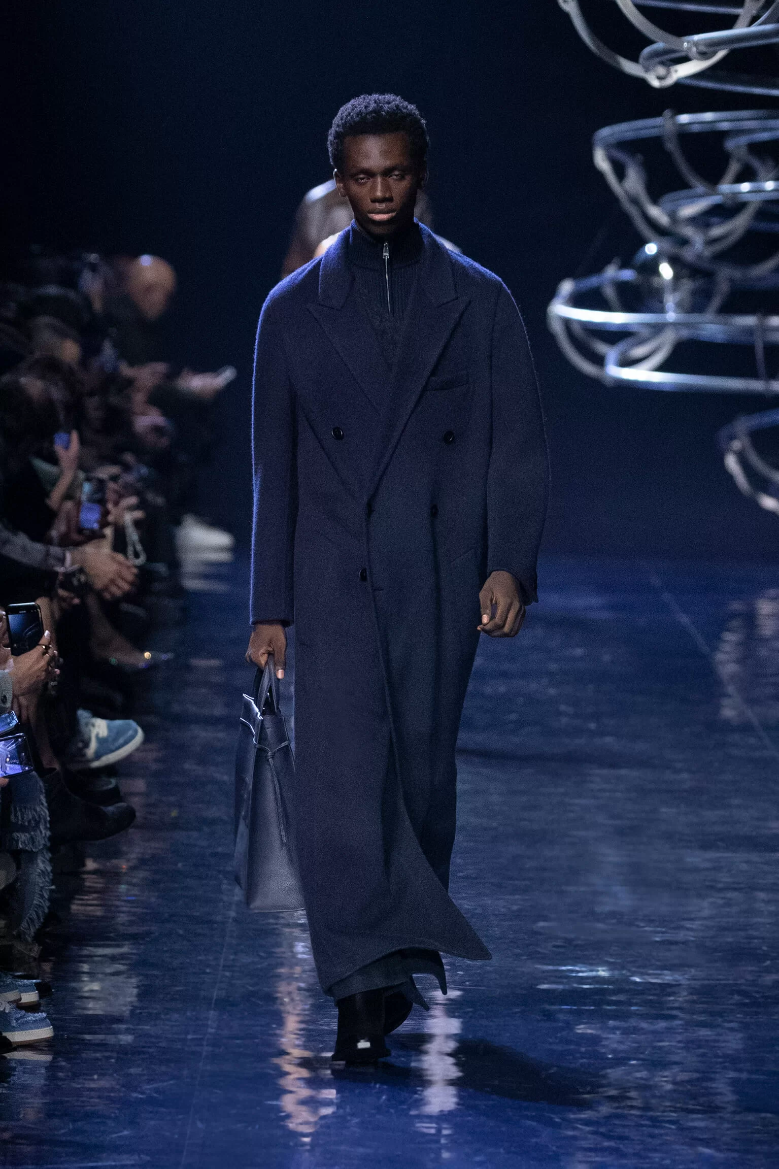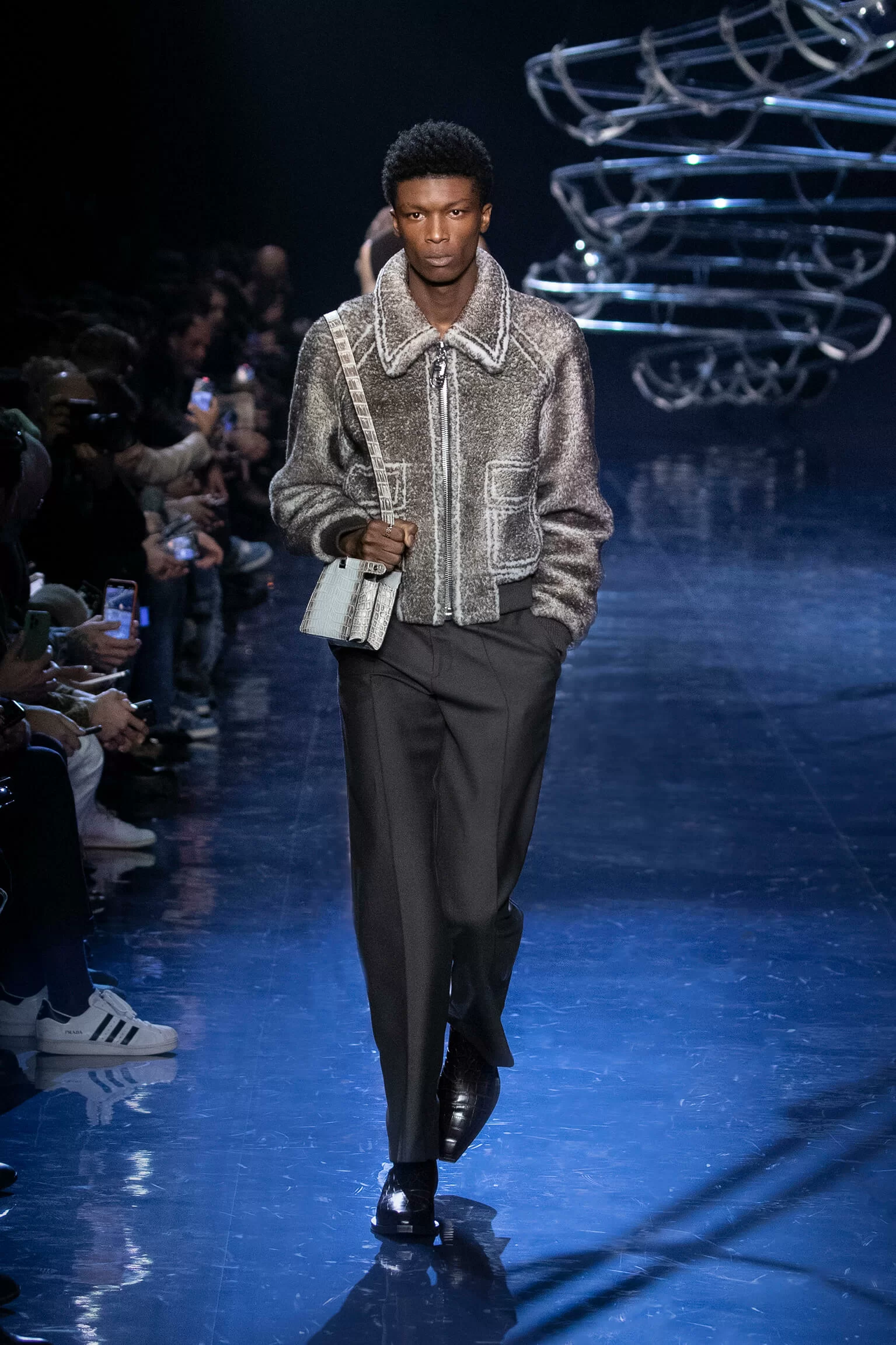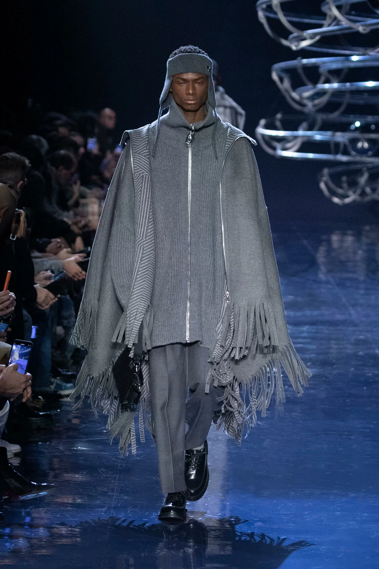 FENDI 2023 男裝秋冬時裝秀上緩緩響起 MORODER 經典之作《I FEEL LOVE》的重新編曲,傳奇天后 DONNA SUMMER 伴隨 DISCO 音樂不停重複着 I FEEL LOVE 的歌詞,正好映照出配飾及男裝藝術總監 SILVIA VENTURINI FENDI 對時尚的熱情,和在場觀眾對品牌又一個美妙系列的愛不釋手。系列探索城市入夜後的頹廢氣息和霓光閃爍的光景,,以斜肩剪裁、仿舊質感、流蘇和反光修飾貫穿,活現嶄新優雅魅力。