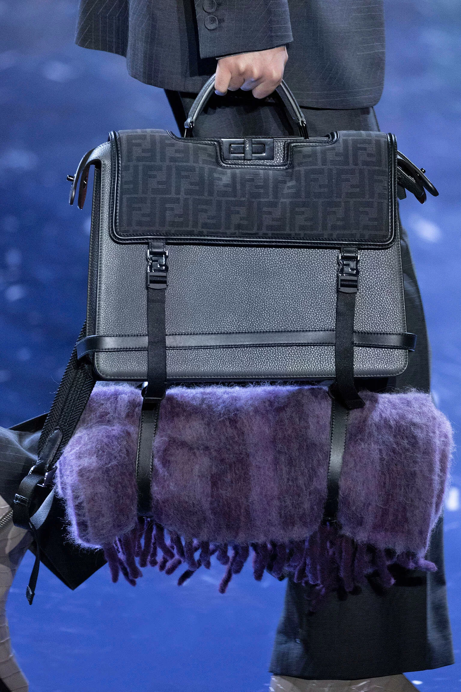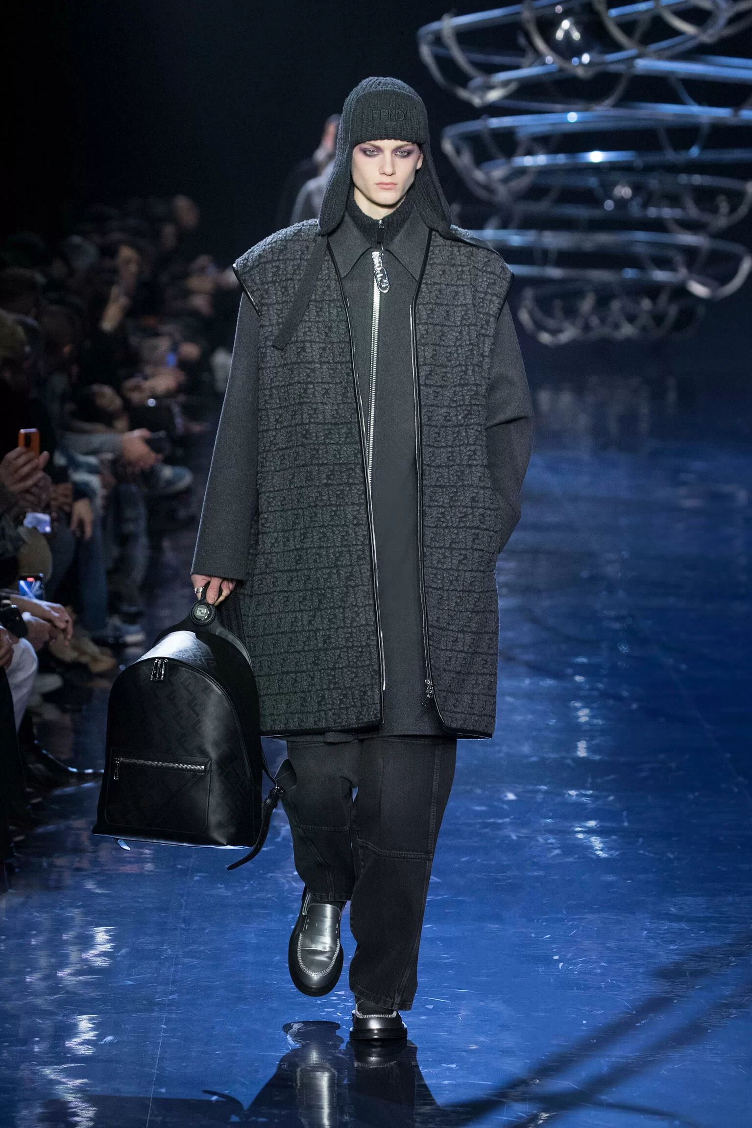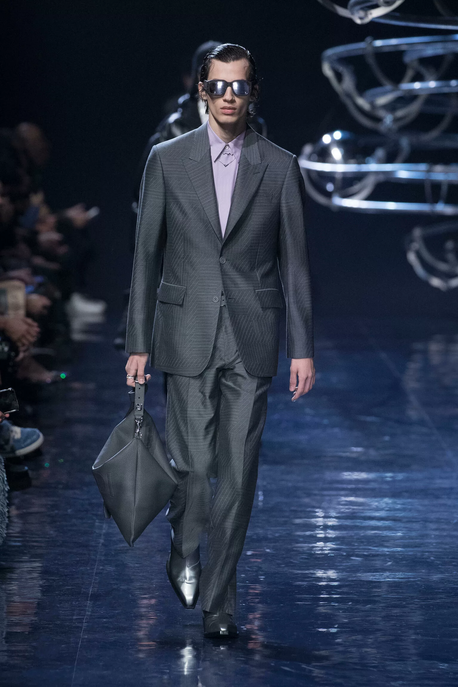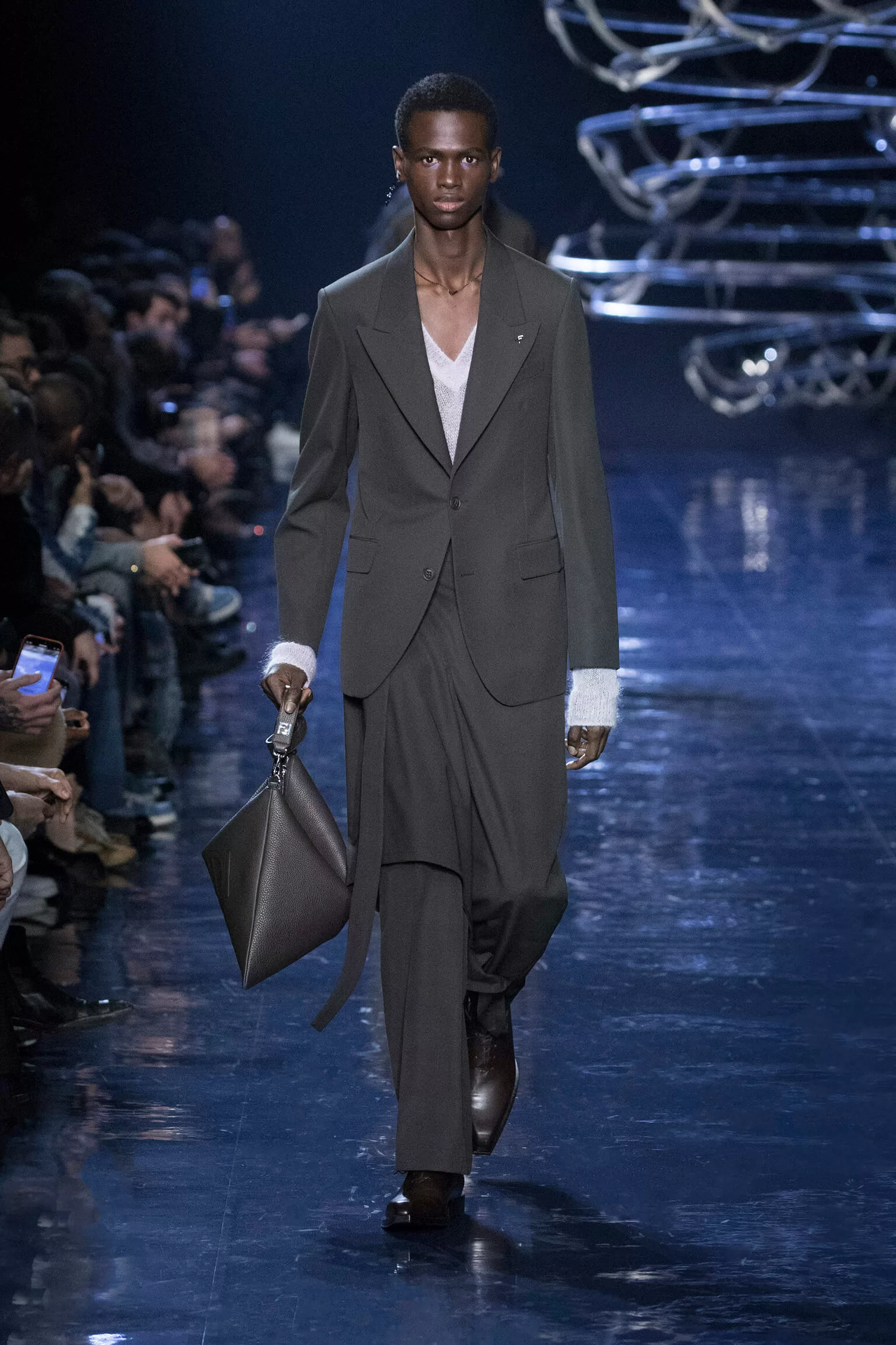 西裝大玩對稱設計及層次感,展現幾何動感,彰顯層次分明的工藝。雙層茄士咩、人造皮革及織花絲綢頌揚 FENDI 向來重視的素材質感,鍍上銀色、靛藍色及紫色等 DISCO 反光燈球所投射出的光線。包覆身體曲線的溫暖外套與慵懶性感的針織衫和剪裁破格的恤衫碰撞出火花,挑戰實用功能和巧妙設計的界限。毛衣背心採用不規則斜肩,垂墜半截裙幅劃破長褲剪裁,服飾上散落金屬色顫動貼飾,蠟面及拋光皮革或過染牛仔布紛紛增添仿舊潤飾。