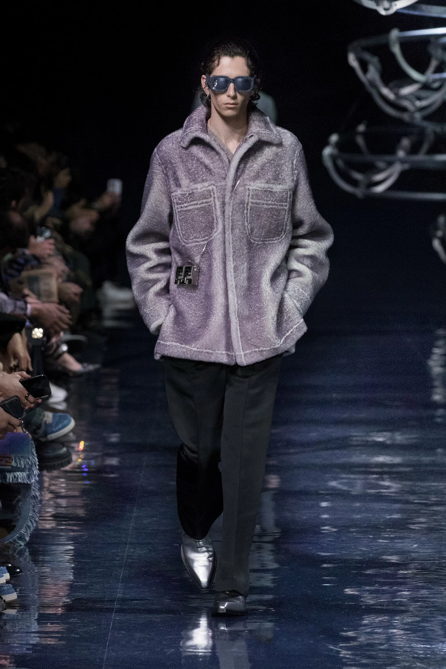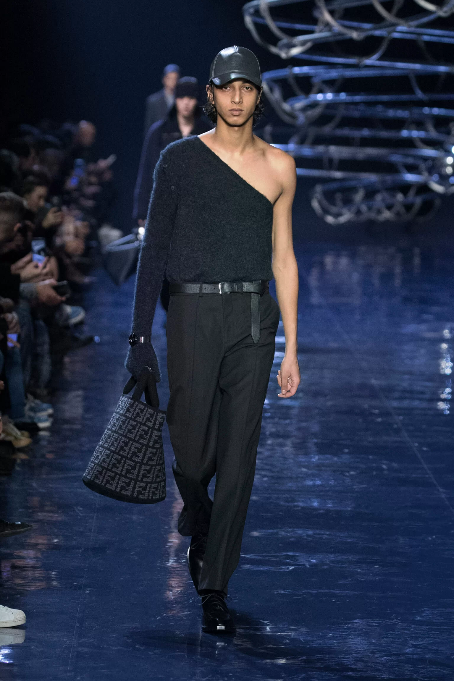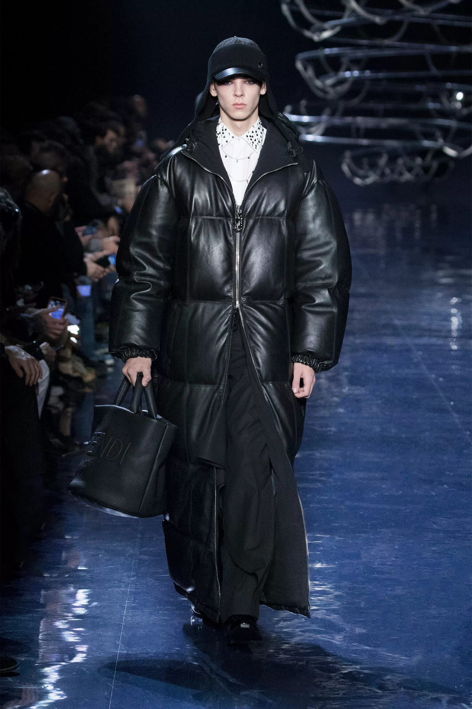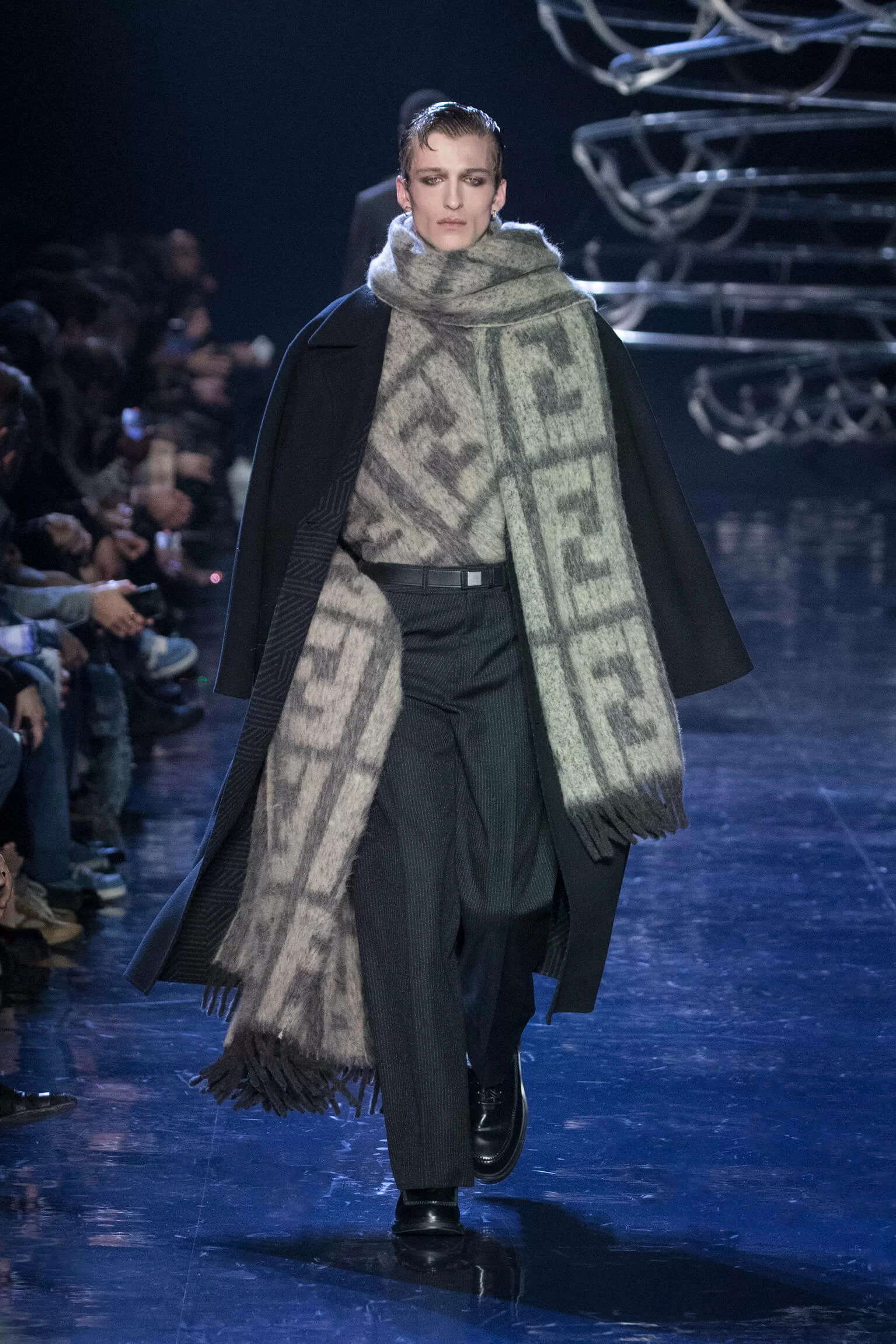 西裝大玩對稱設計及層次感,展現幾何動感,彰顯層次分明的工藝。雙層茄士咩、人造皮革及織花絲綢頌揚 FENDI 向來重視的素材質感,鍍上銀色、靛藍色及紫色等 DISCO 反光燈球所投射出的光線。包覆身體曲線的溫暖外套與慵懶性感的針織衫和剪裁破格的恤衫碰撞出火花,挑戰實用功能和巧妙設計的界限。毛衣背心採用不規則斜肩,垂墜半截裙幅劃破長褲剪裁,服飾上散落金屬色顫動貼飾,蠟面及拋光皮革或過染牛仔布紛紛增添仿舊潤飾。